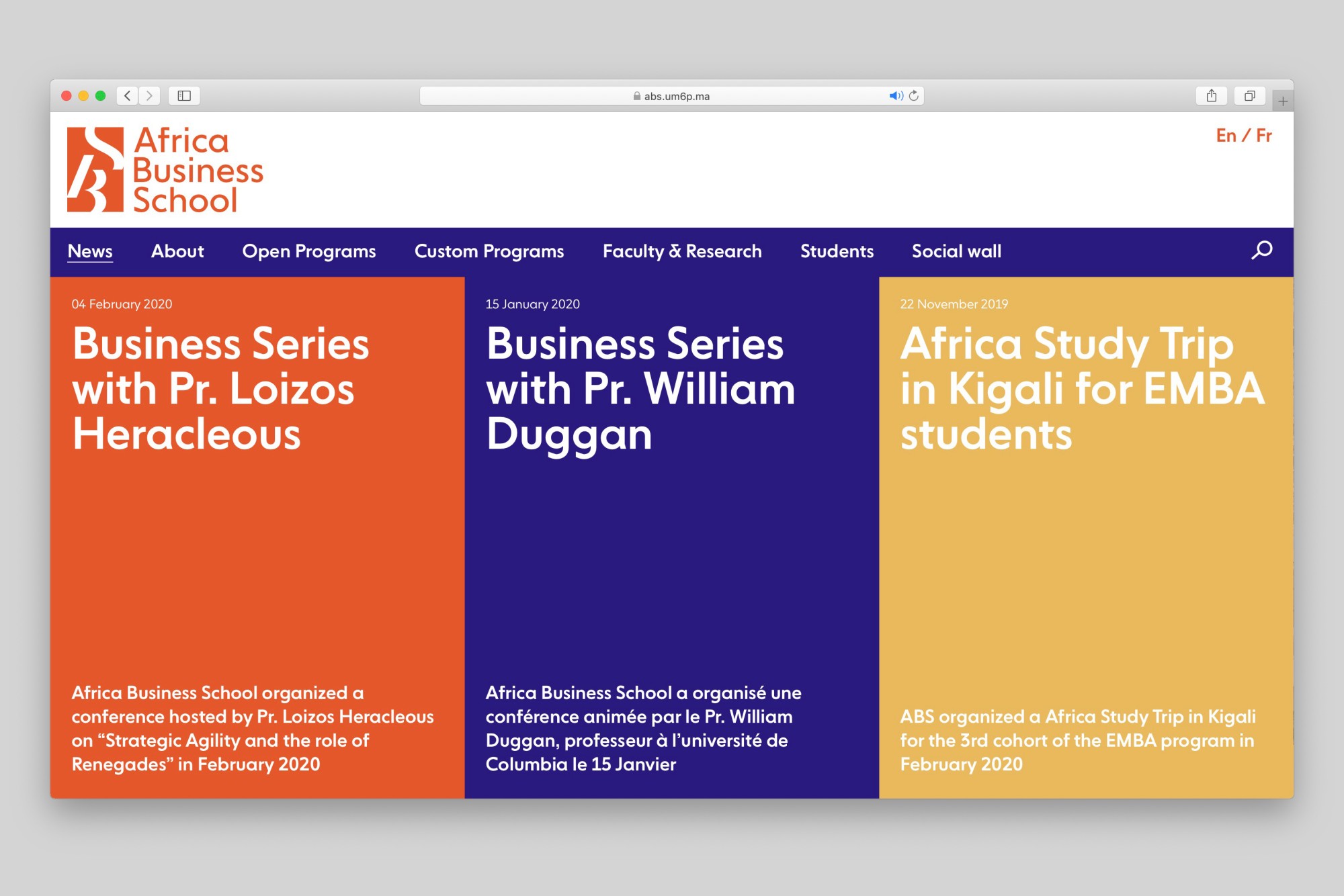 The logo consists of an original monogram based on the three letters A, B and S. The overall shape of the logo and the acronym is set in a strong, stable and ergonomic rectangle. It refers not only to the "setting" of the course, but also to the building of the Mohammed VI University, designed by Ricardo Bofill, a key element in the ABS environment. The colour of the building was the basis for the design of a bespoke range, including blue, which is very present in Morocco from the sea to the land, ochre, which is reminiscent of the desert, and the red of the saffron fields and African countries.