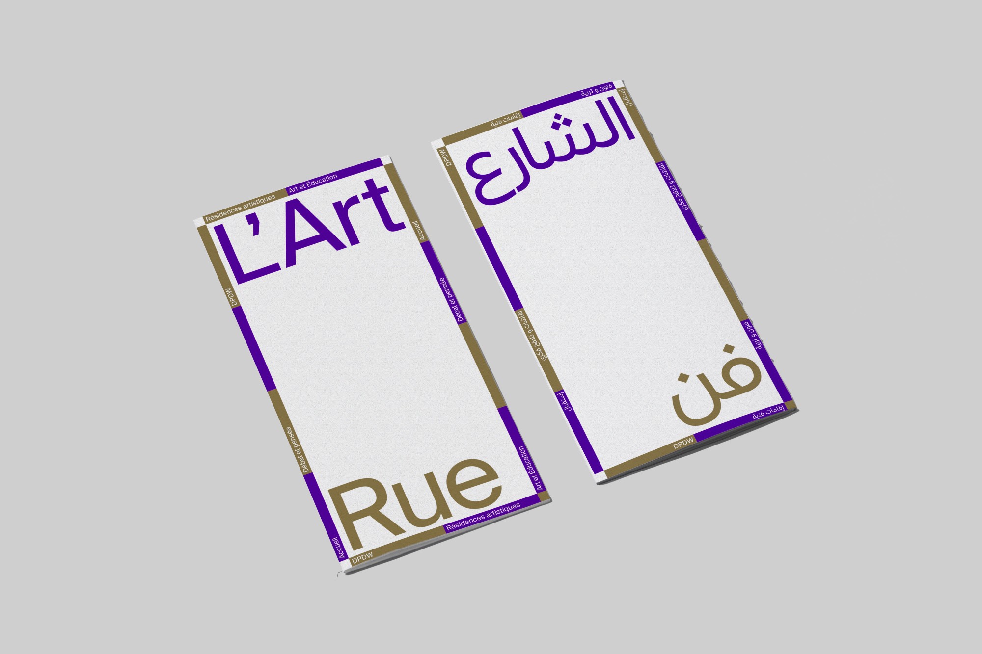 Led by choreographers Selma and Sofiane Ouissi, L’Art Rue is a space for creation, experimentation, and research across practices and cultures. Based in the Medina of Tunis, the association extends its reach — from one territory, city, language, discipline to another — through a transdisciplinary and international program. We developed a modular, trilingual (Arabic, French, English) visual identity system that unfolds through distinct patterns representing each of the organization’s activity areas. Easily recognizable, playful, and adaptable, this identity is redesigned every two years around a new duo of colors.