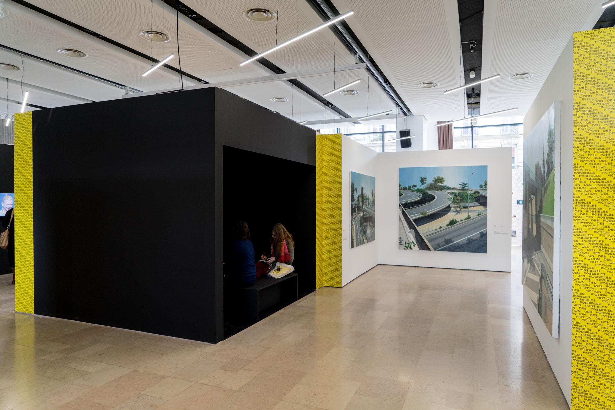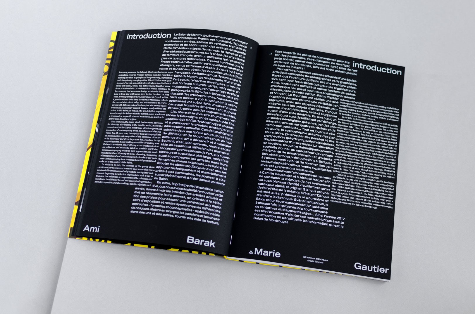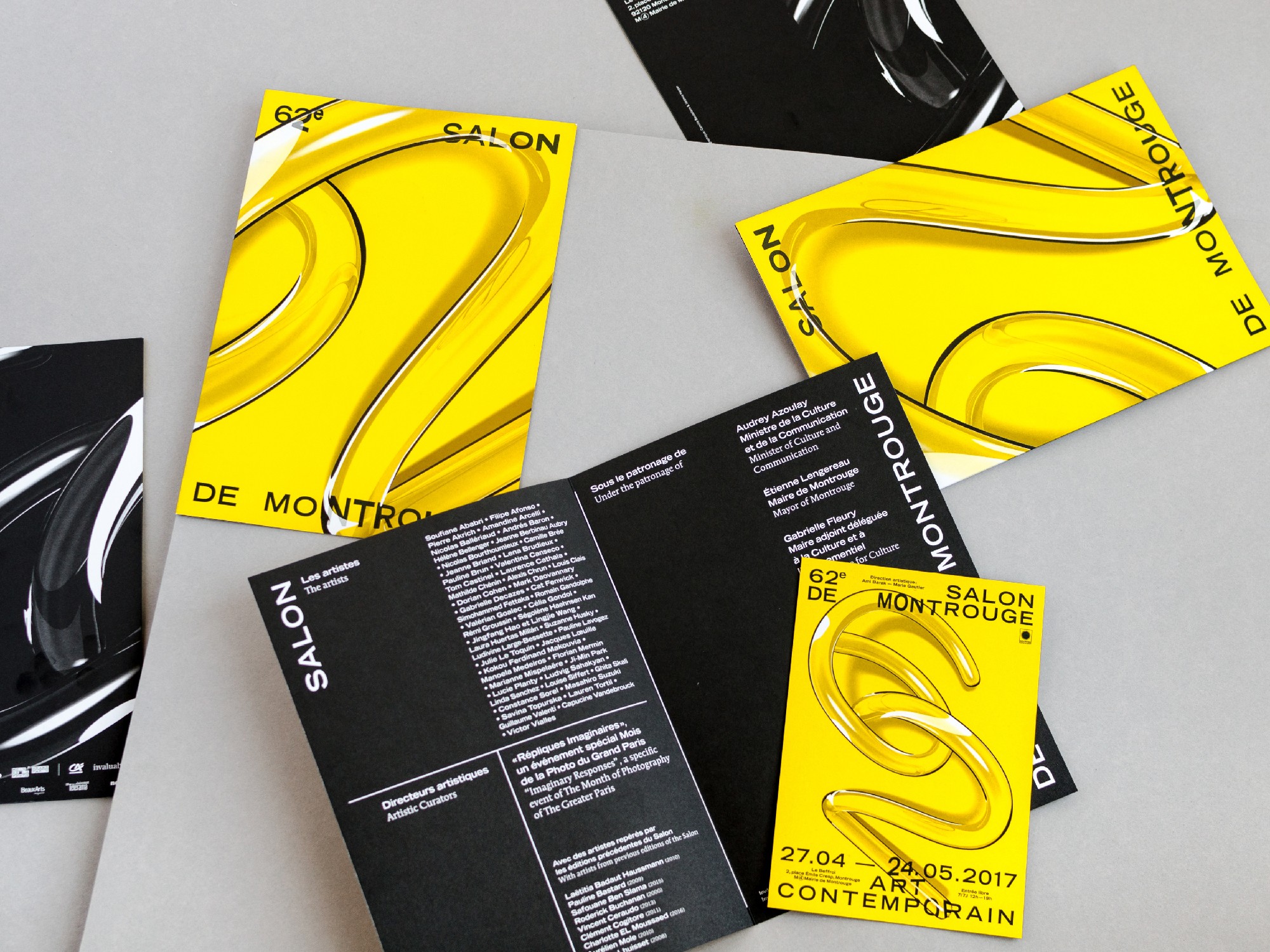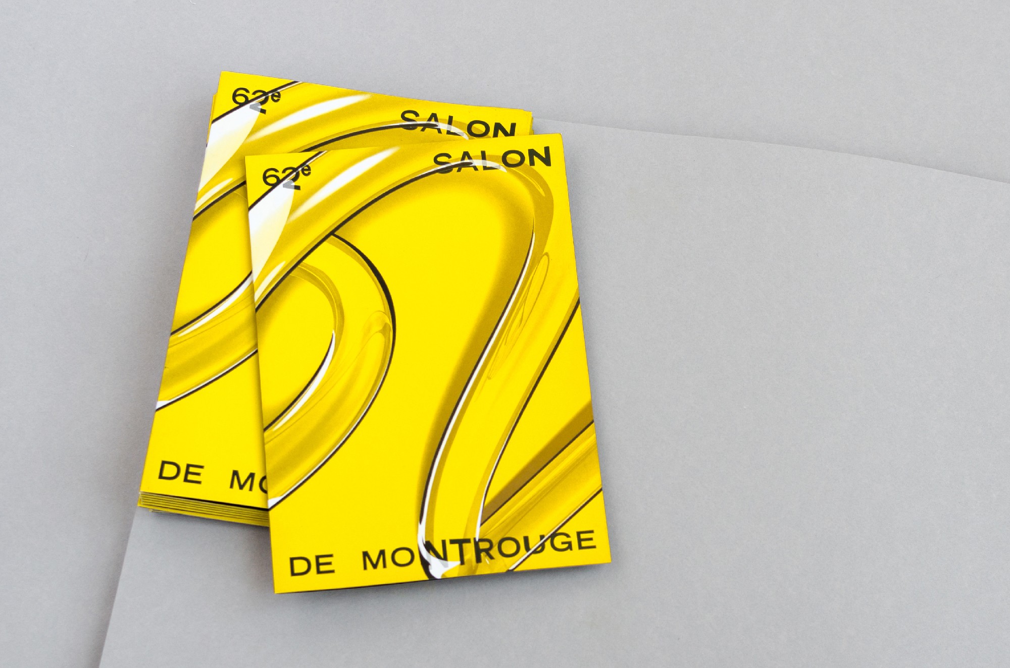 Le numéro du salon s’impose toujours comme principal repère visuel dans la communication de cet événement en faveur de la jeune création artistique, et prends cette année une tournure plus sculpturale. Pourvu d’une ombre franche, il se détache du fond de l’affiche comme une véritable objet à la matérialité ambiguë. Entre 3D et dessin, le visuel navigue en eau trouble, grossissant et déformant les typographies au travers de son parcours sinueux. A partir de cette écriture ludique se déploie en sur-couverture du catalogue et en papiers-peints, tout un répertoire de motifs typographiques dansants. Un nouveau défi technique est relevé pour ce visuel qui combine toute la palette des outils du graphiste, et s’imprime dans une combinaison flamboyante de Pantone jaune fluo et de noir.