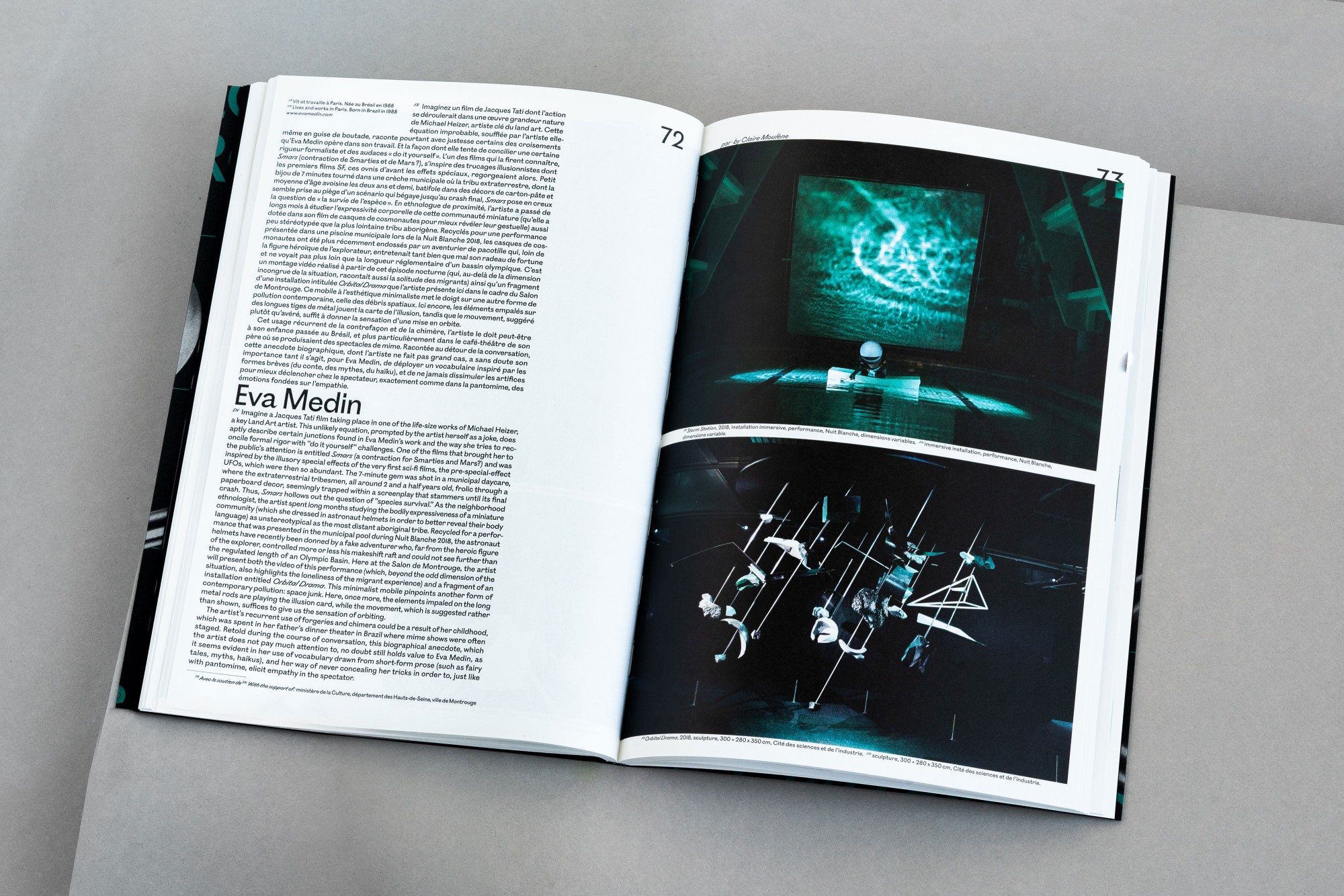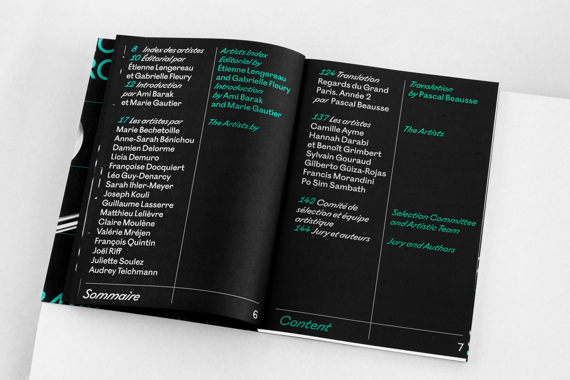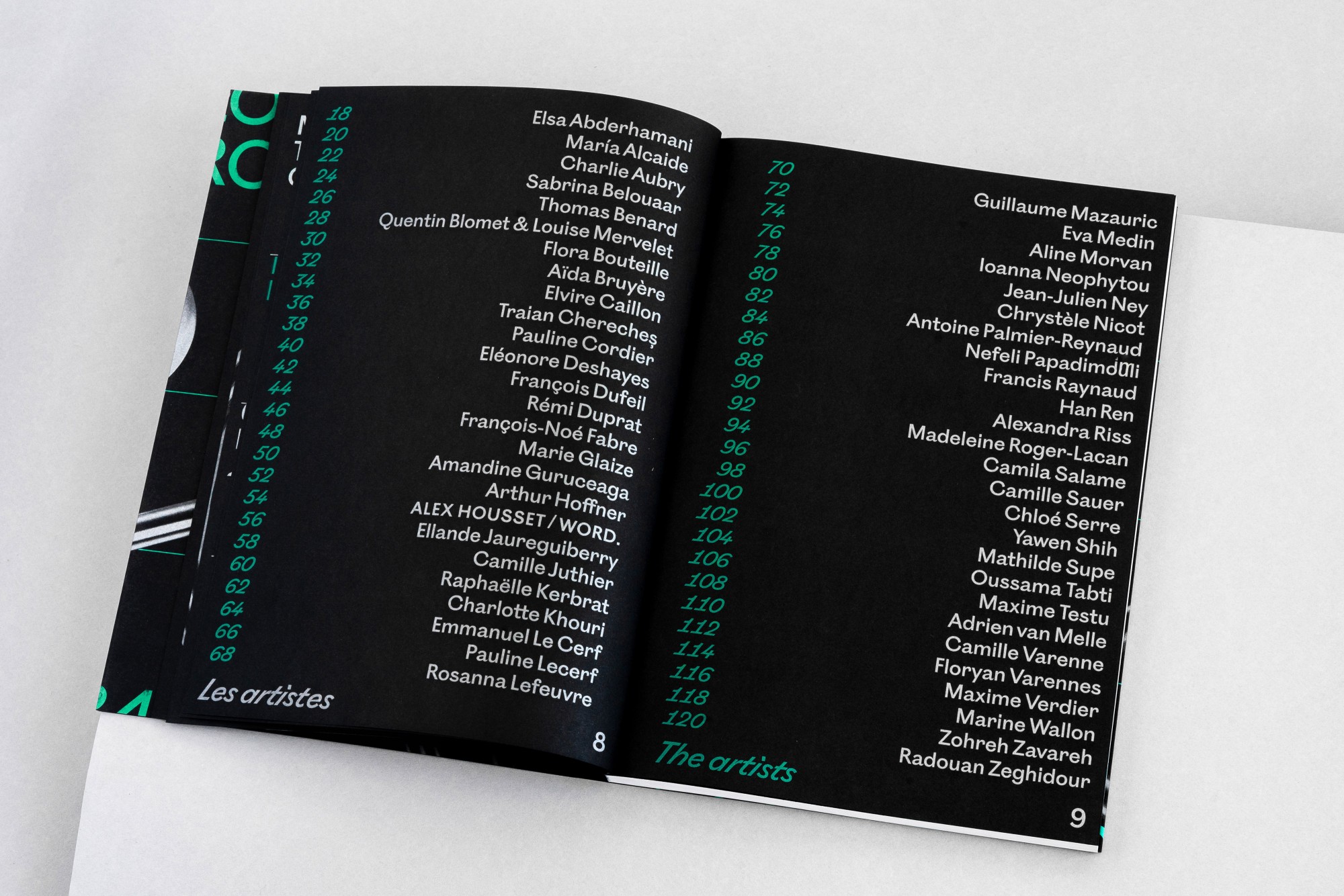 Le grand chiffre, signe distinctif du salon, est à nouveau l’occasion d’une exploration formelle en 3D. Nous proposons cette fois un chiffre en anamorphose, constitué de plusieurs modules géométriques que l’on imagine reposer sur un support quadrillé. Dans la continuité de l’affiche, cet alphabet géométrique se déploie sous toutes les coutures sur les différents supports. Une gamme subtile de noir-vert et argent tranche avec les couleurs chaudes proposées les années précédentes.