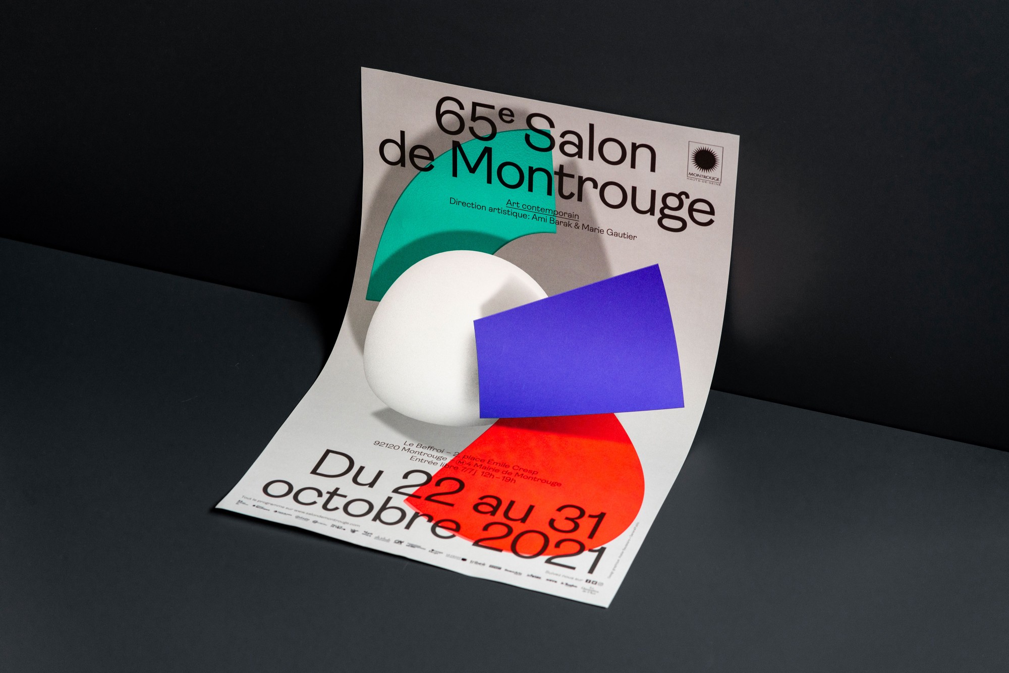 Pour la quatrième année consécutive, l’Atelier Baudelaire et le studio GeneralPublic s’associent pour signer l’identité, le catalogue et la signalétique du Salon de Montrouge, exposition d’art contemporain. En cohérence avec les saisons passées, l’identité arbore le numéro 65 en volume, dans un esprit plus sculptural encore, débordant du cadre jusqu’à devenir un jeu de formes et de couleurs. Affiches, catalogue, invitations, annonces presse, signalétique, etc déploient l’identité par des variations de cadrages et d’échelles. Pour la scénographie, les formes XXL habillent les cimaises, débordent sur le sol et structurent l’espace.