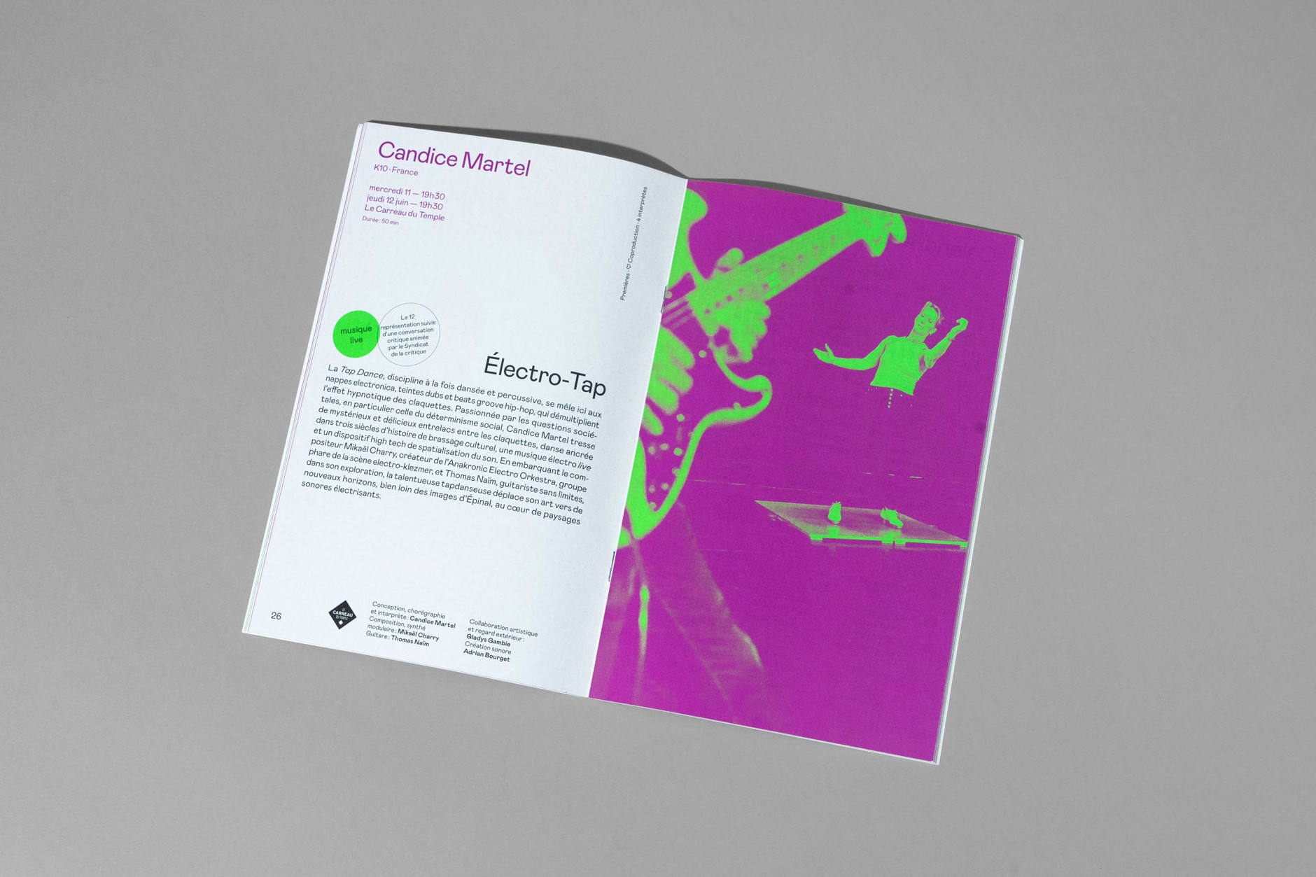 Les grands principes de la mise en page sont réemployés rigoureusement pour chaque nouvelle brochure dans un soucis de cohérence, de lisibilité et d’efficacité, permettant au public de conserver ses repères dans l'identification et la lecture des documents. Des associations de couleurs fortes et vibrantes réinventées à chaque nouvelle édition bousculent cette identité rigoureuse et pensée pour répondre à une économie de moyens et de temps dans l’élaboration des documents.