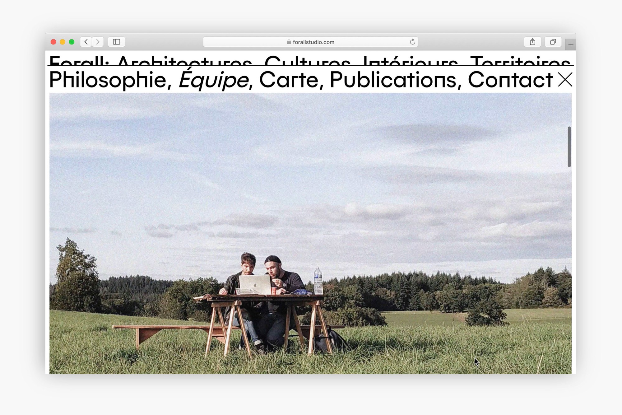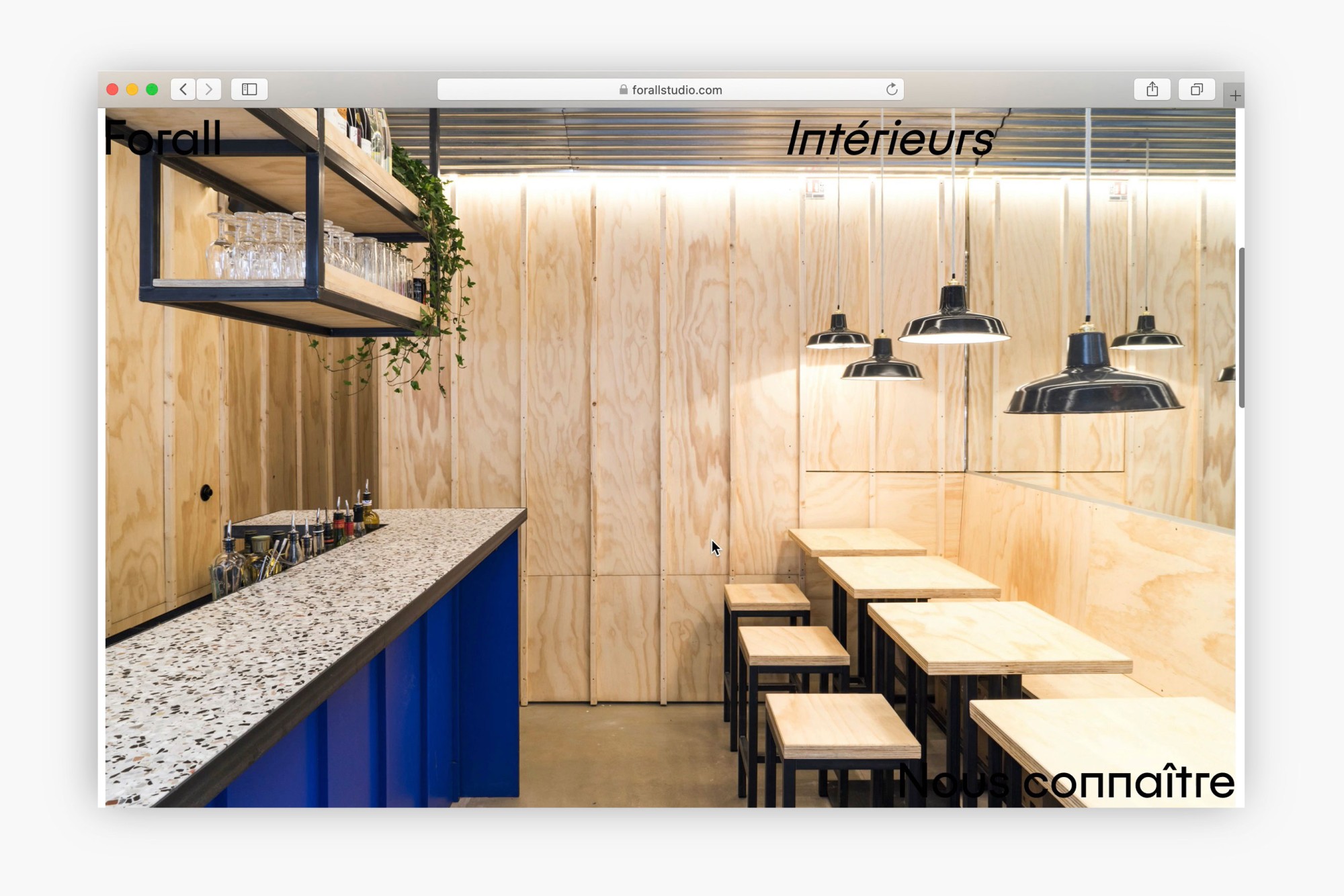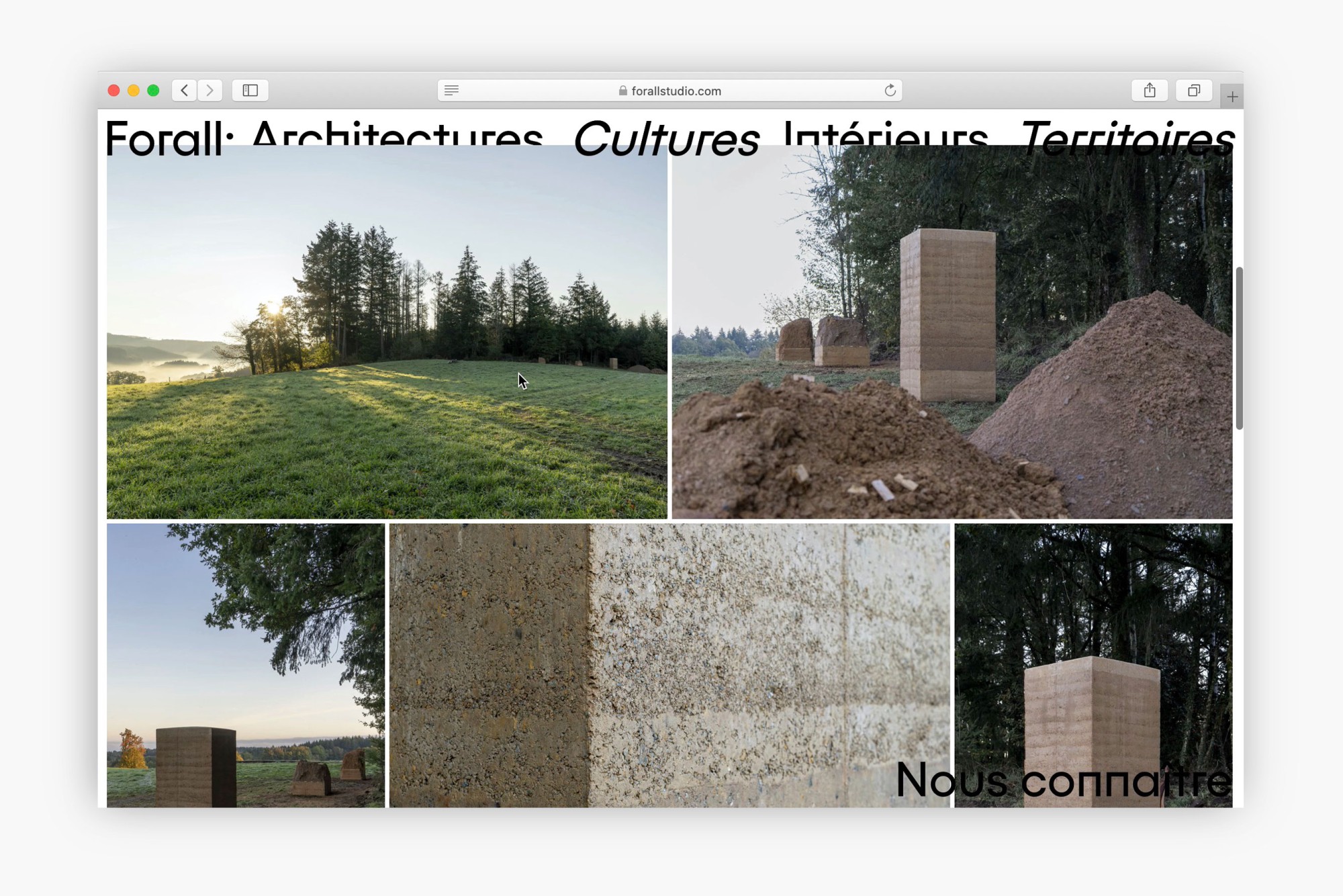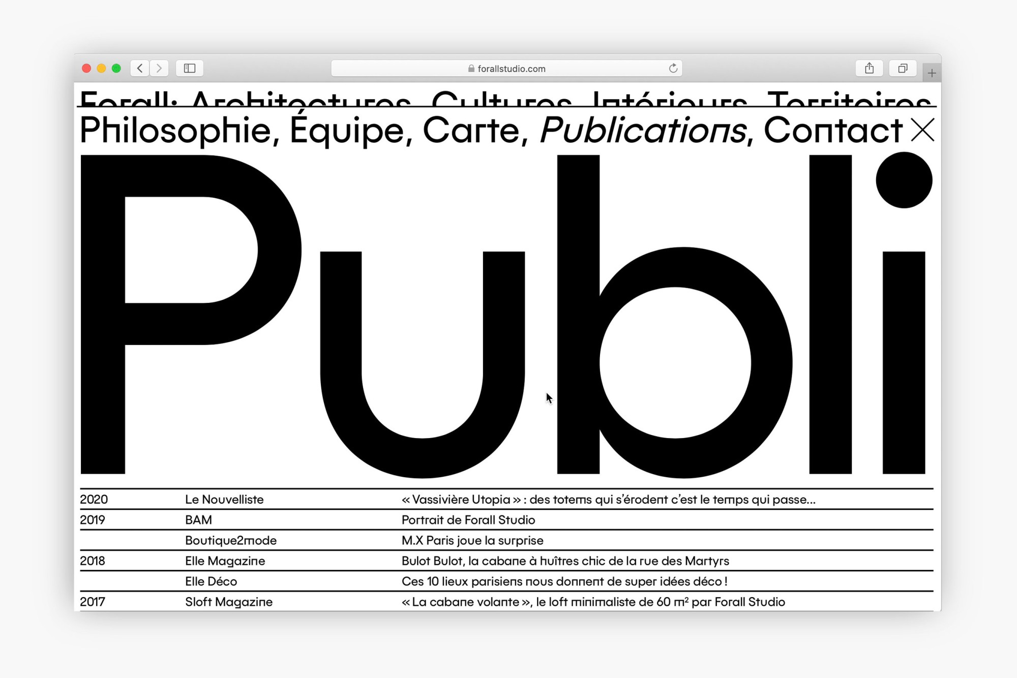 L'Atelier Baudelaire accompagne Forall Studio, agence d’architecture, d’architecture d’intérieur et d’urbanisme, depuis ses débuts. Nous avons conçu pour eux un site mettant en valeur l'aspect pluridisciplinaire de l'agence et leur réflexion, qui s'exprime souvent autant par le texte que l'image. Lauréat des AJAP20, ce studio d'architecture met la réponse à la crise climatique au cœur de ses projets quelle qu’en soit l’échelle. Les sujets sont abordés par le prisme de la ressource – durable et locale, de son utilisation raisonnée, de la culture constructive qui lui est associée, du tissu économique qu’elle fédère, du territoire qu’elle fabrique. La lettre « A » retournée à 180° est un symbole mathématique signifiant « pour tout ». L’identité visuelle joue sur la mobilité et l’hybridité de cette lettre qui devient à la fois signe et signature.