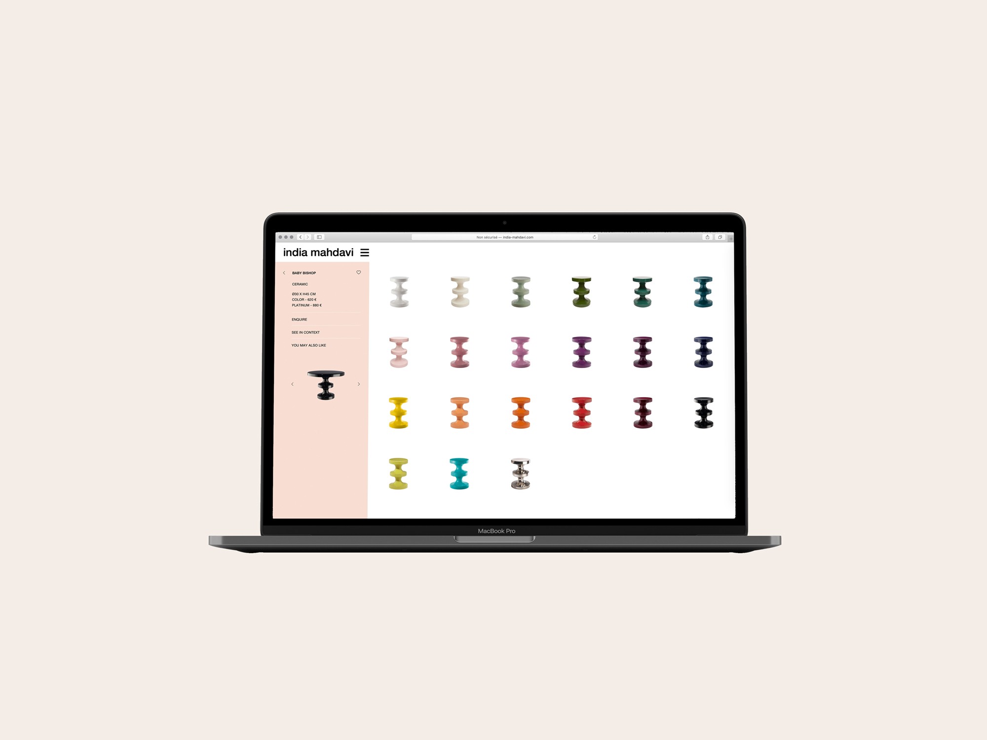 Entre e-shop et vitrine, le site internet d’India Mahdavi propose un grand damier d’objets, d’espaces et de couleurs.