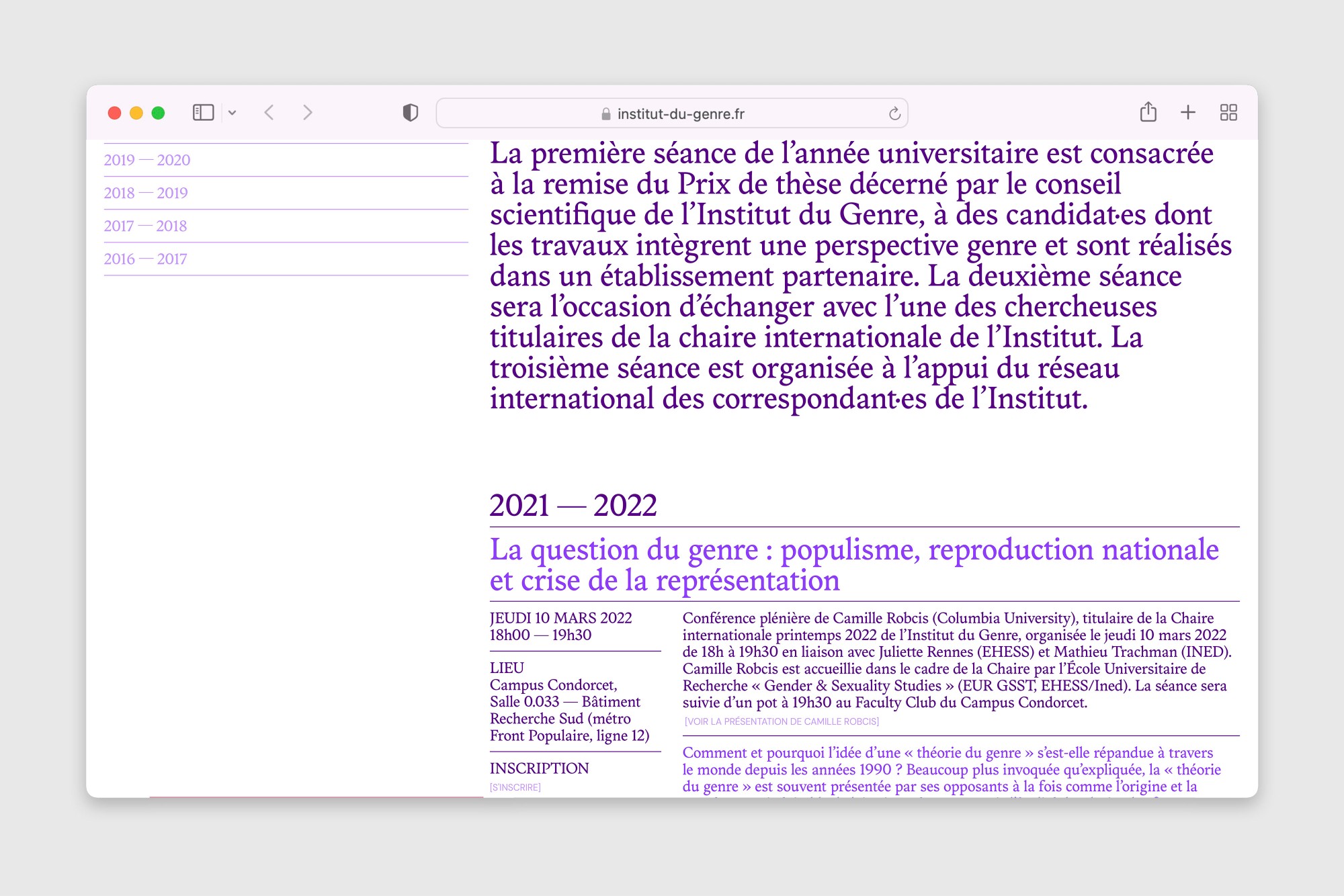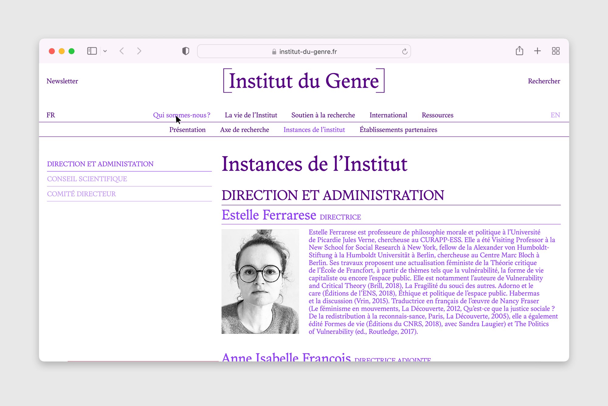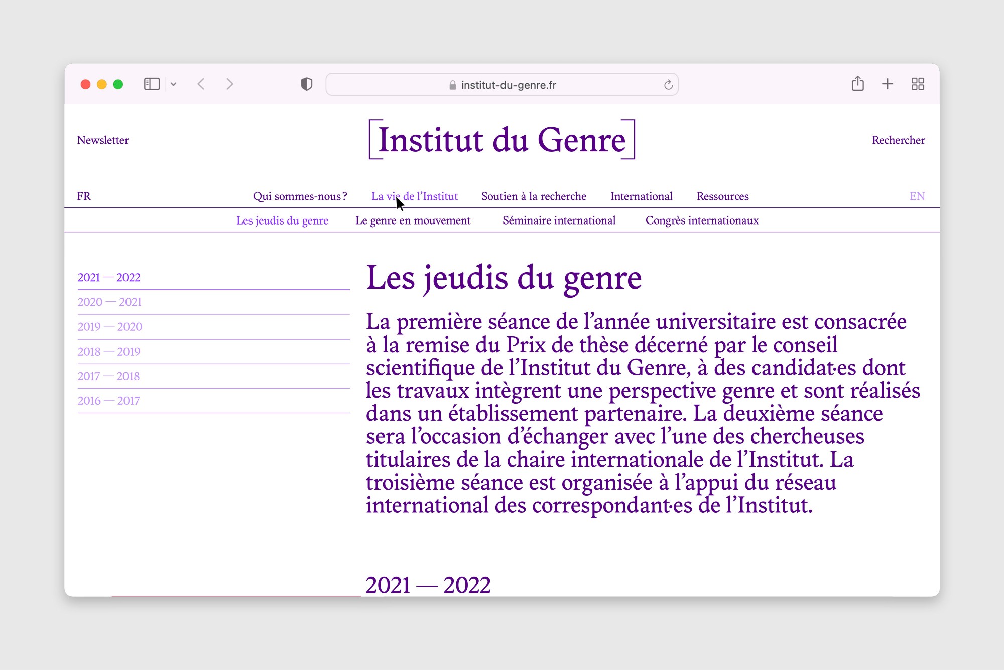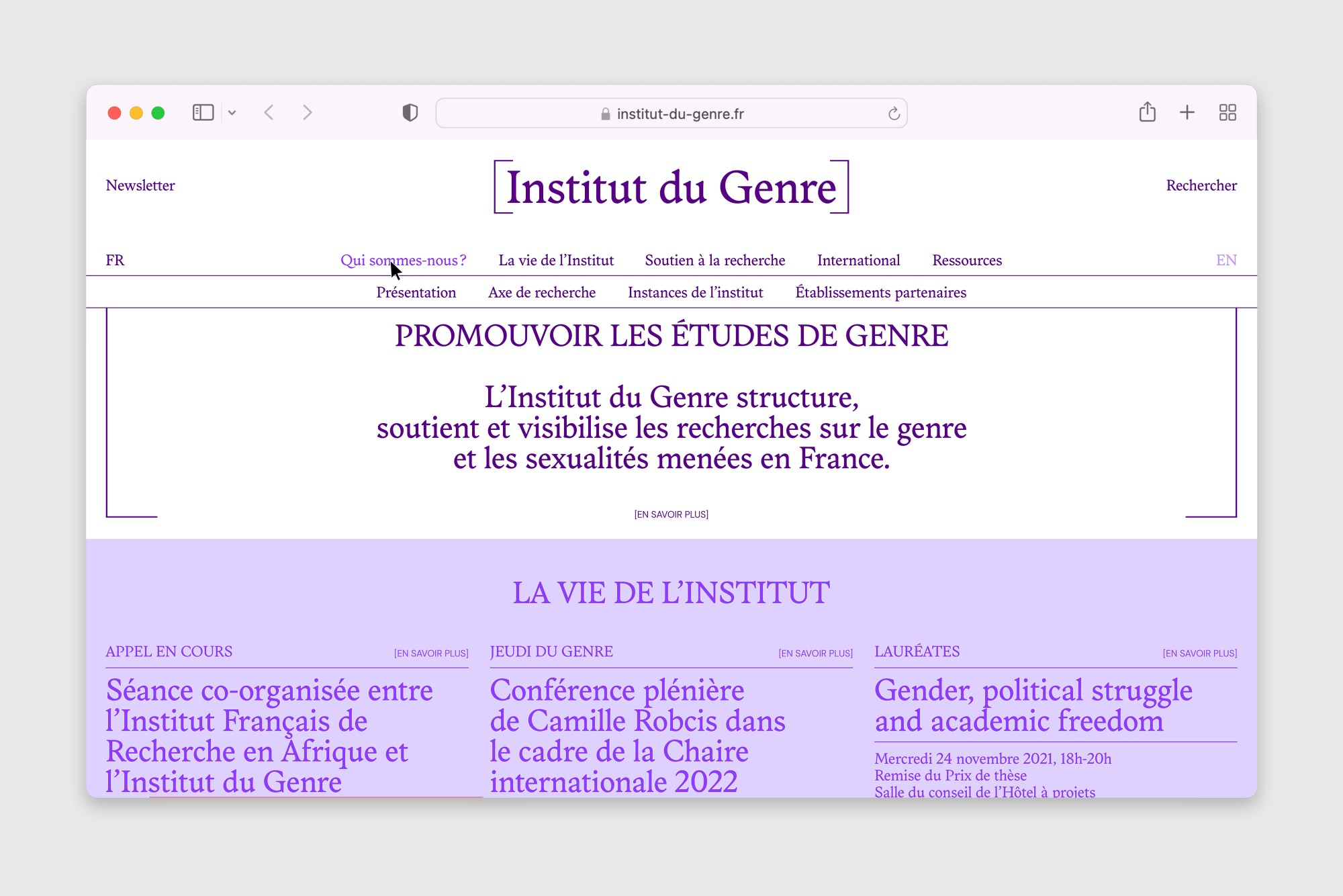 Fondé en 2012 à l'initiative du CNRS, l'Institut du Genre est un Groupement d'Intérêt Scientifique (GIS) dont la mission est de structurer, soutenir, et visibiliser les recherches sur le genre et les sexualités en France. Nous avons choisi de structurer l’identité visuelle autour de l’Adelphe, un caractère inclusif créé par Eugénie Bidaut en 2022 dans le cadre de sa recherche à l’ANRT. Ce caractère a la particularité de préserver l’homogénéité visuelle du texte long en petits corps et d’offrir plusieurs systèmes d’écriture inclusive, contribuant ainsi à leur appropriation dans la sphère institutionnelle. Son nom, qui signifie à la fois frère et sœur, est très utilisé au sein des communautés militantes queers. Avec ce caractère nous avons réalisé un logotype sobre et élégant ponctué de deux crochets évoquant l’étude scientifique, le ralliement, l’encadrement et le soutient. Il suggère aussi l'espace ouvert du plan d'architecture et positionne l'Institut comme un lieu d’innovation, où se croisent différent.e.s acteur.ice.s de la recherche. L’ergonomie du site internet a été totalement repensée autour d’une ligne graphique assez radicale, permettant une expérience de navigation fluide, une bonne accessibilité de l'information et un confort de lecture.