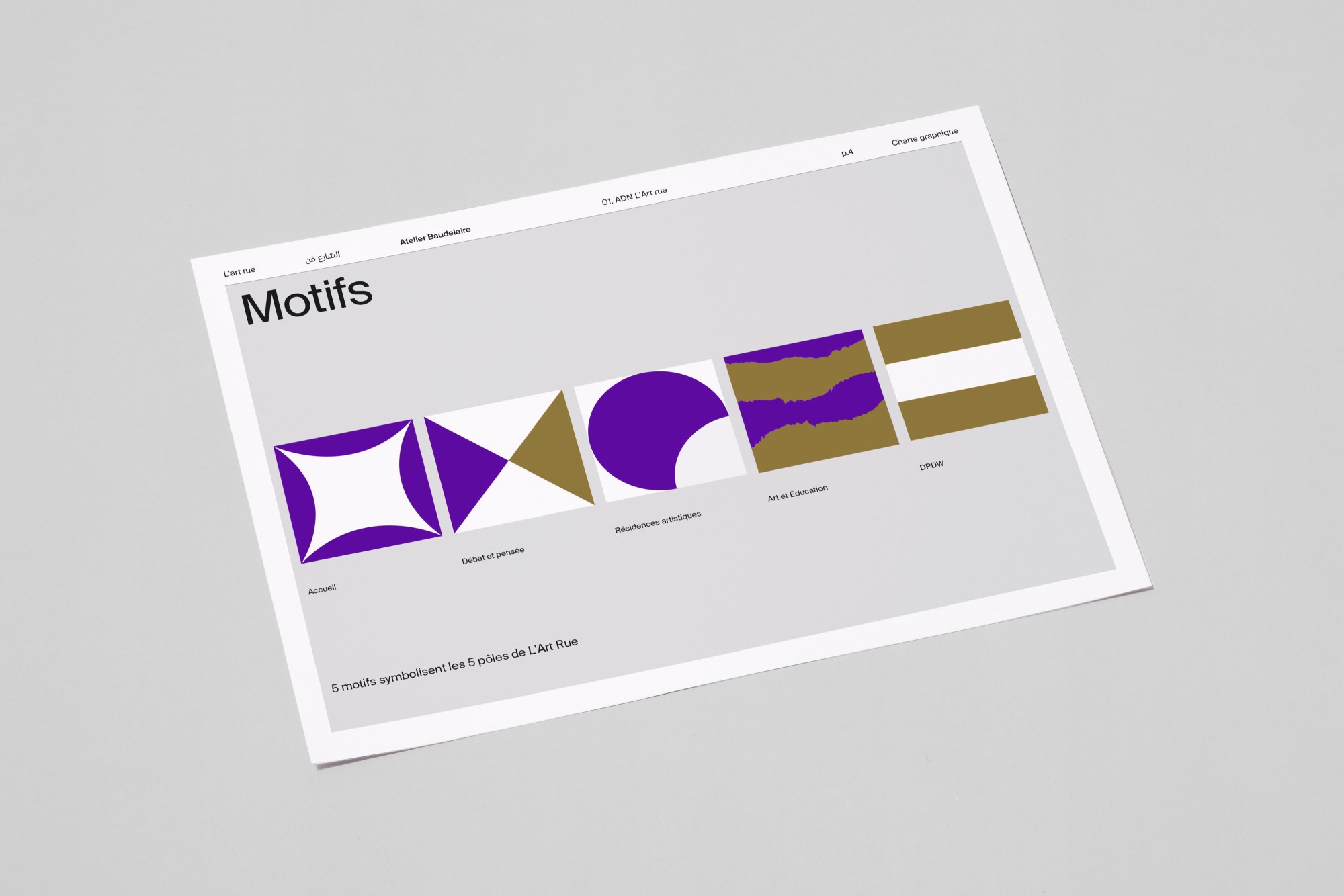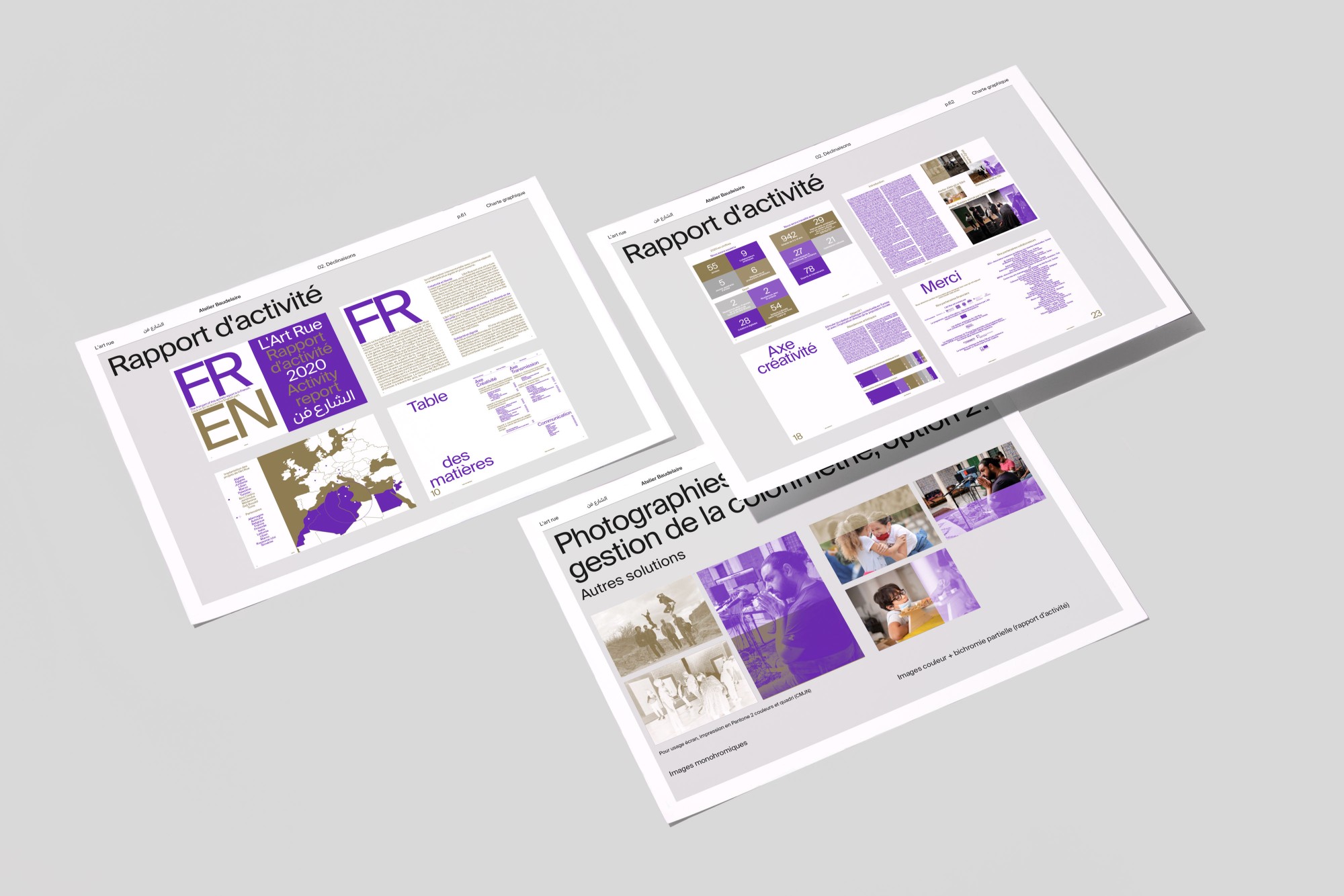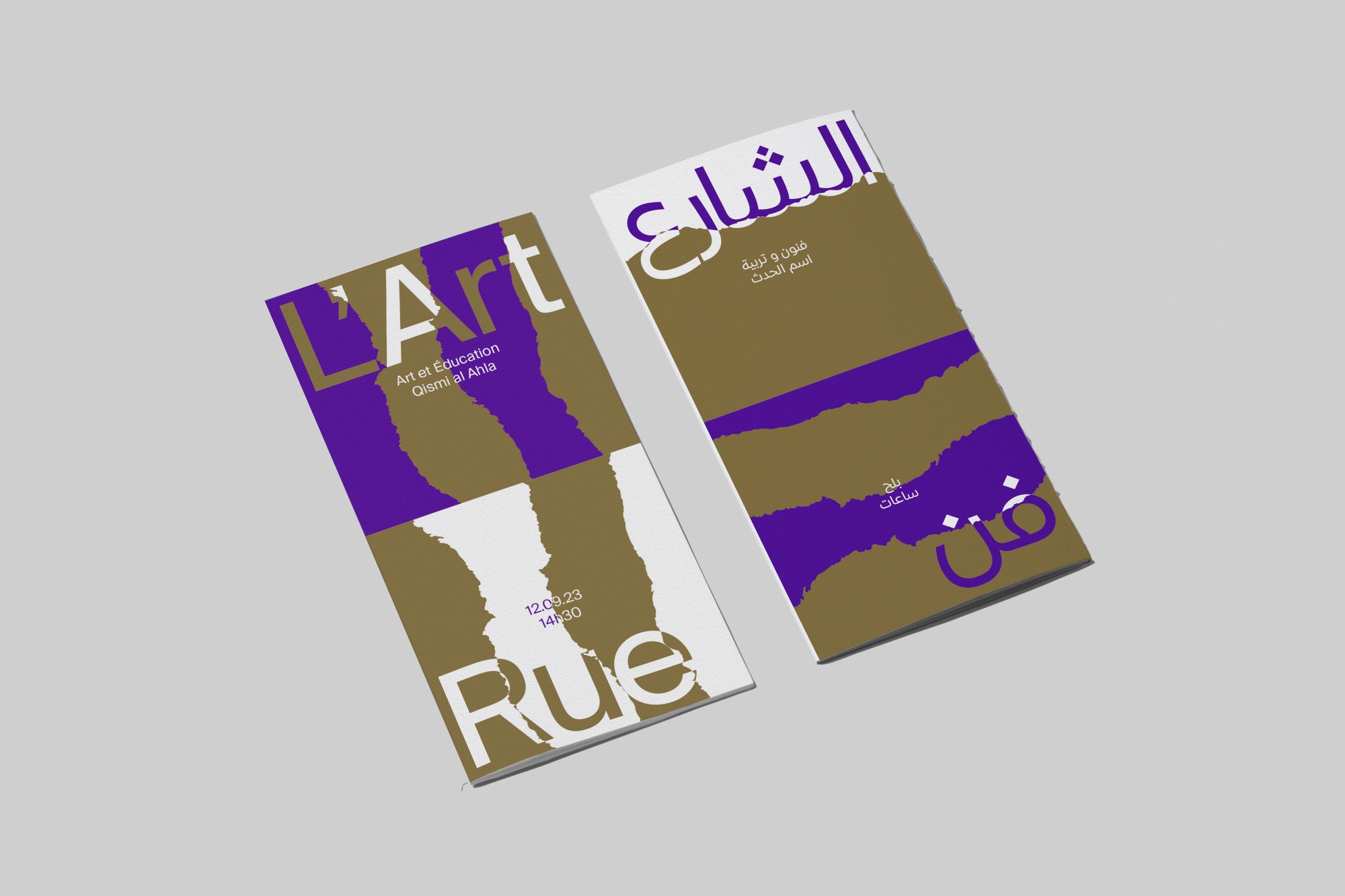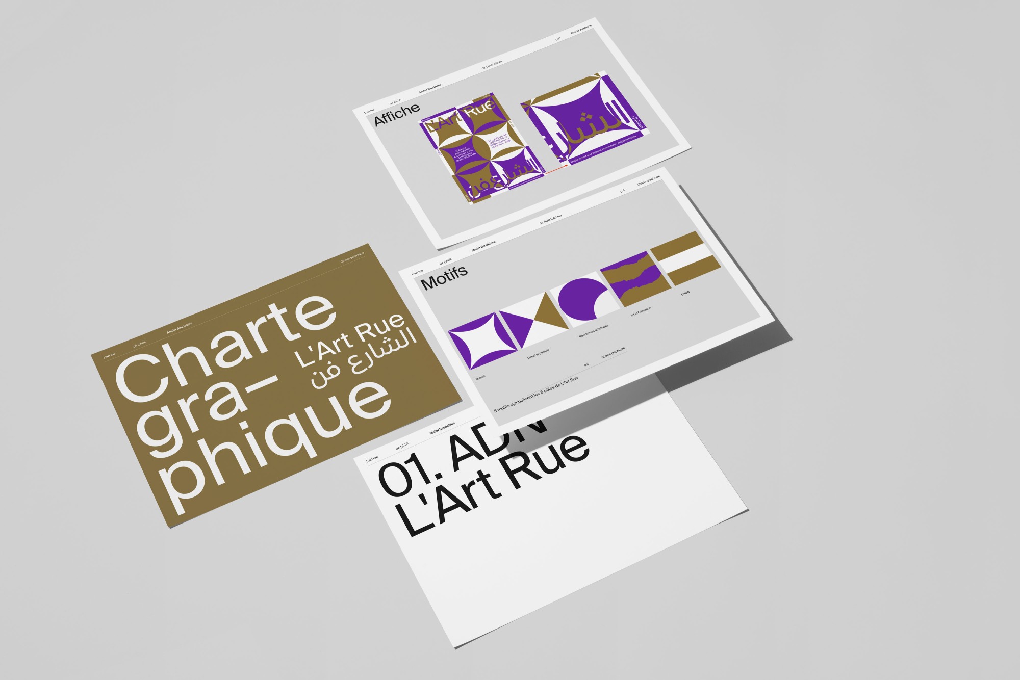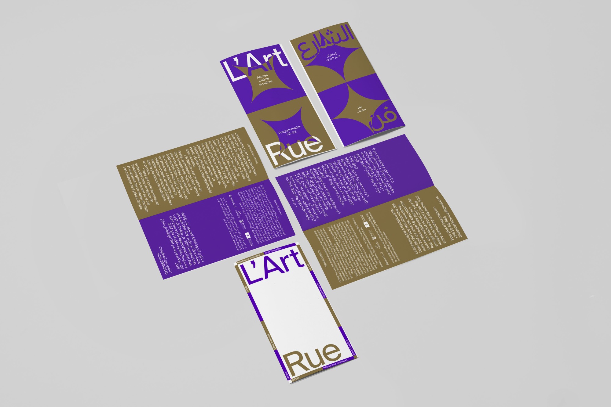 Porté par les chorégraphes Selma et Sofiane Ouissi, L'Art Rue est un espace de création, d’expérimentation et de recherche entre les pratiques et les cultures. Depuis la Médina de Tunis, l'association rayonne d’un territoire, d’une ville, d’un pays, d’une langue et d’une discipline à l’autre à travers une programmation transdisciplinaire et internationale. Nous avons conçu une charte graphique modulaire, trilingue (anglais, français, arabe), qui se décline avec différents motifs pour chaque pôle d’activité de l’association. Repérable facilement, ludique et évolutive, cette charte graphique se ré-invente tous les deux ans autour d’un duo de couleur différentes.