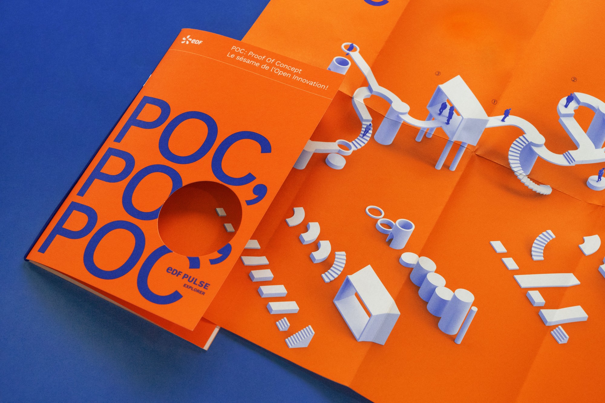 Plus qu’une charte éditoriale, nous proposons un ADN fort, reposant sur un agencement typographique radical, deux couleurs contrastées, et une gamme d’illustrations en 3D sur mesure. Les process de recherche, dont chaque boussole fait l’objet, se traduisent par une déclinaison de micro-architectures inspirées de la folie de jardin. D’une boussole à l’autre, ces structures insolites en 3D sont constituées à partir des mêmes modules géométriques, dont l’ensemble se décompose à la faveur de quelques pages. Au centre du fascicule, rattaché par un élastique coloré, est offert au lecteur un poster, qui déplié, résume au travers d’une représentation détaillée de l’architecture en volume, le contenu de la boussole. Les modes de représentation visuels qui s’y déploient, s’appuient sur les conventions usitées en architecture et les process de conception 3D.