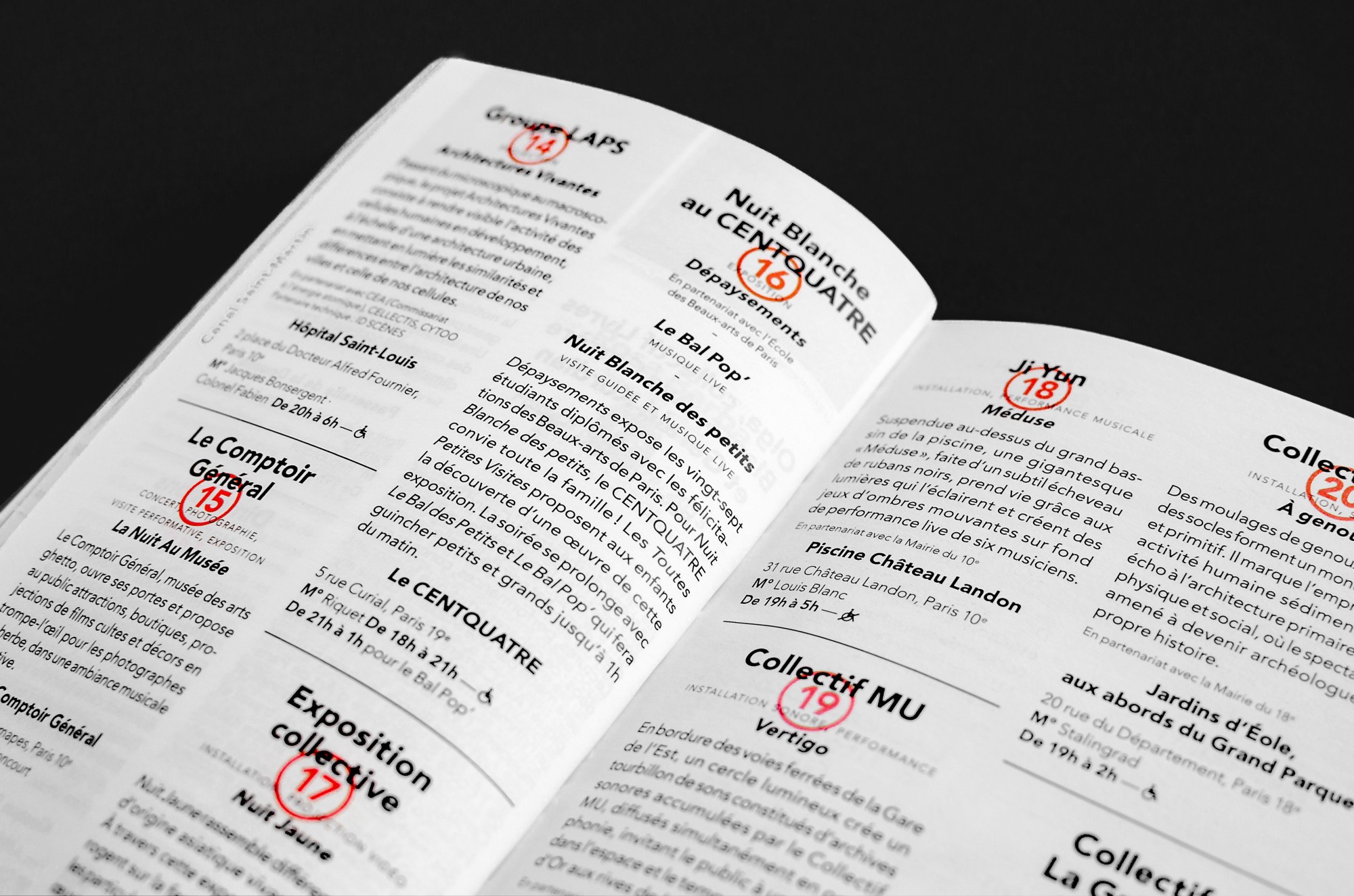 Sous la direction artistique de Chiara Parisi et Julie Pellegrin, l’édition 2013 de Nuit Blanche se déploie sur les Berges de Seine, le canal Saint-Martin, les quartiers de la République, du Marais, de Belleville et de Ménilmontant. Cette typographie faite de coups de pinceaux en trois dimensions semble flotter dans la nuit. La grande échelle typographique contraste avec l’effet de lumière noire, qui donne à l’événement un caractère confidentiel et crée une complicité avec les visiteurs.