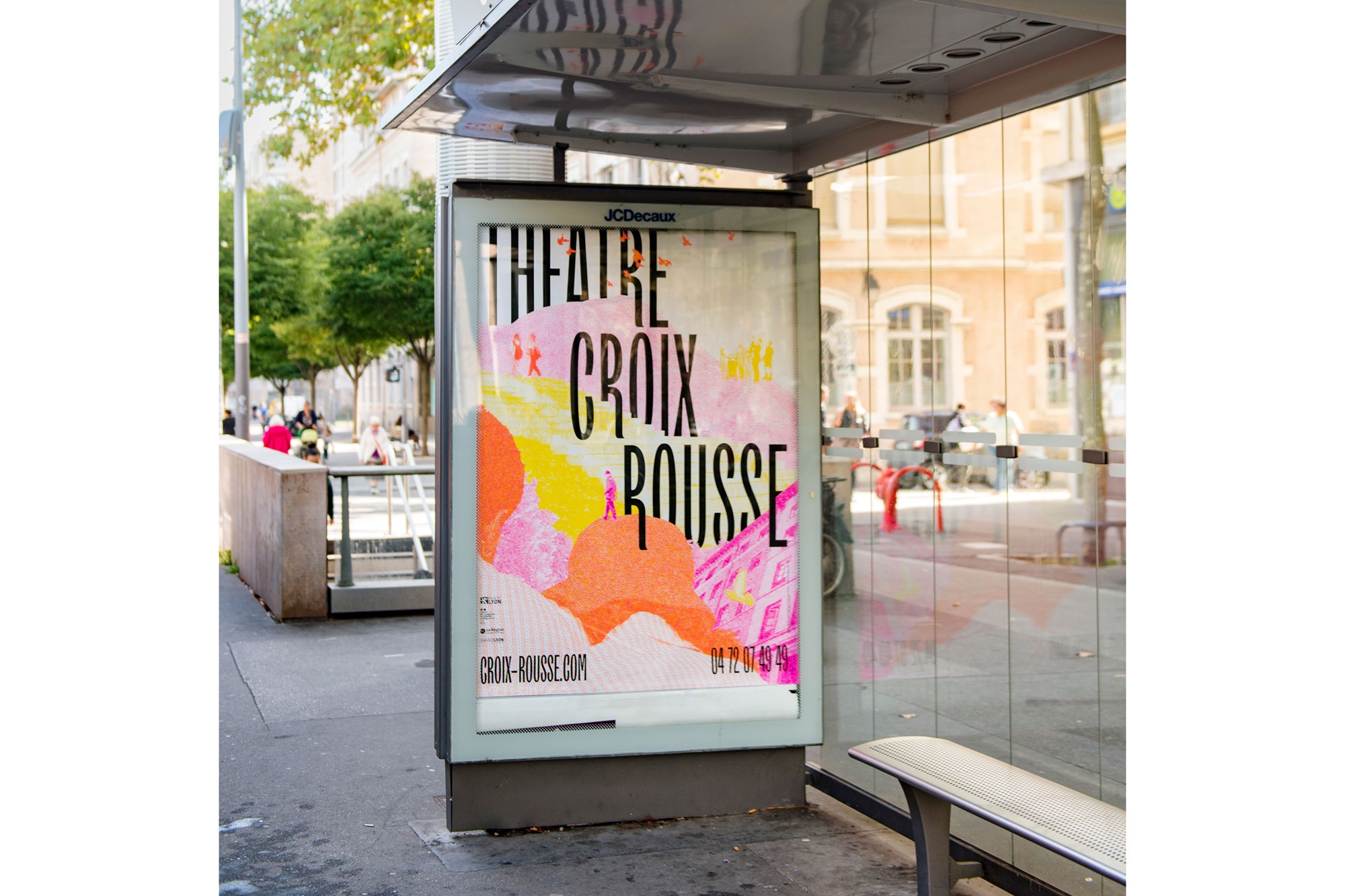 Pour cette saison nous conservons la ligne en place et recomposons un paysage à partir des couleurs et repères emblématiques du quartier de la Croix-Rousse. Par ses collages colorés, ses jeux d’échelle et de fausses perspectives inspirées du décor de théâtre, l’affiche se regarde de loin comme une peinture abstraite et de près comme une fresque de petites scènettes à interpréter. La typographie, autour d’une composition dessus-dessous, surjoue la verticalité pour dynamiser la composition, donner du volume à l’affiche et se muer en personnage. Sa mise en page en escalier, élément indissociable de La Croix-Rousse est le socle de l’identité du théâtre.