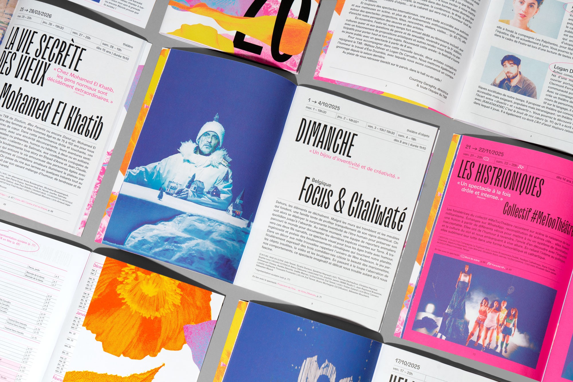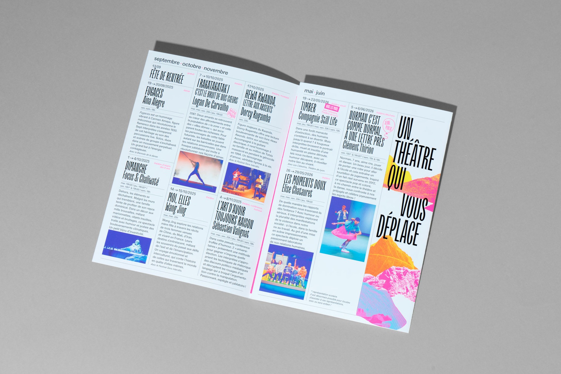 Dans la continuité des saisons précédentes, l’affiche est un enchevêtrement en cascade de typographie, paysages et formes abstraites. Jeux d’échelle et de trames composent un décor coloré de près et de loin une peinture abstraite. La mise en page en escalier, qui fait écho aux collines de la Croix-Rousse, est un repère fort au sein de l’identité du théâtre.