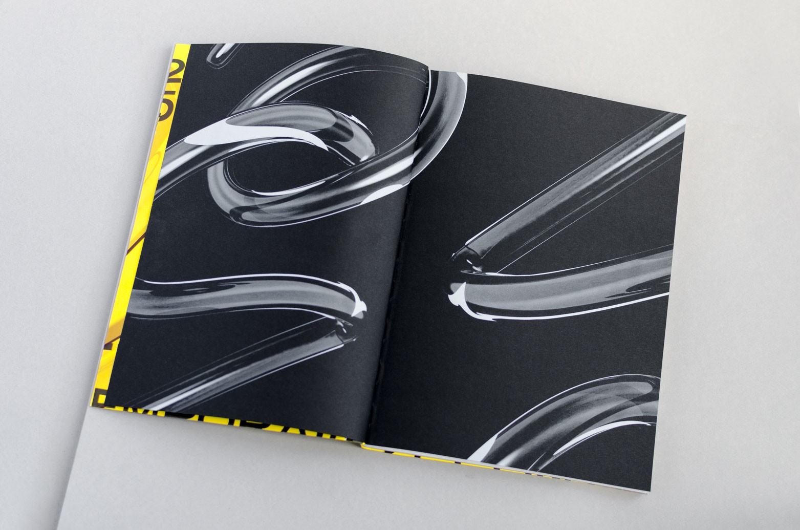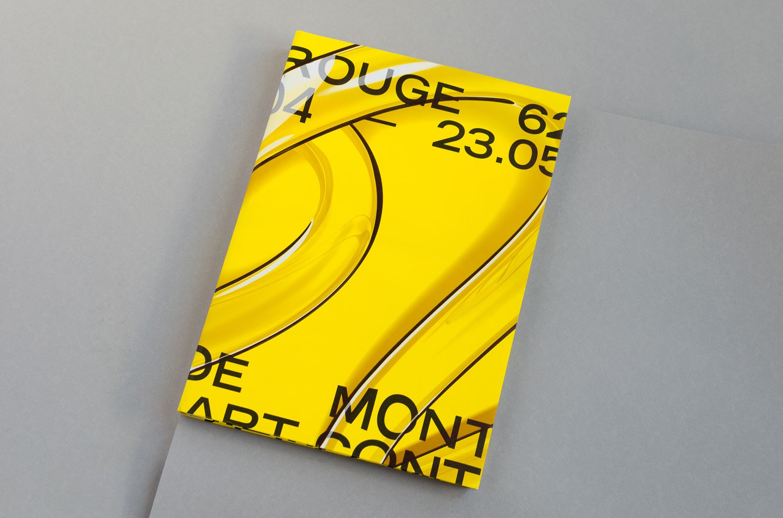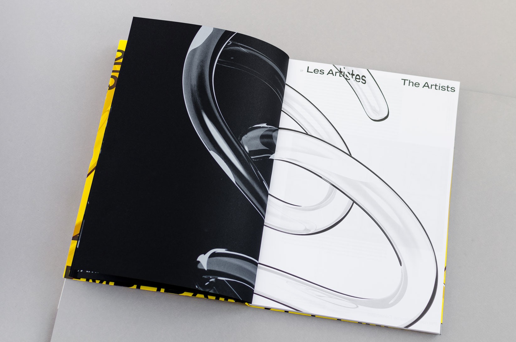 The exhibition number is still the main visual reference point for this event promoting young artists, but this year it has taken on a more sculptural appearance. With its bold shadow, it stands out from the background of the poster like an object of ambiguous materiality. Somewhere between 3D and drawing, the visual navigates through murky waters, magnifying and distorting the typography as it winds its way. From this playful script, a whole repertoire of dancing typographic motifs is deployed on the catalogue cover and as wallpaper. A new technical challenge was taken on for this visual, which combines the full range of the graphic designer's tools and is printed in an extravagant combination of Pantone neon yellow and black.