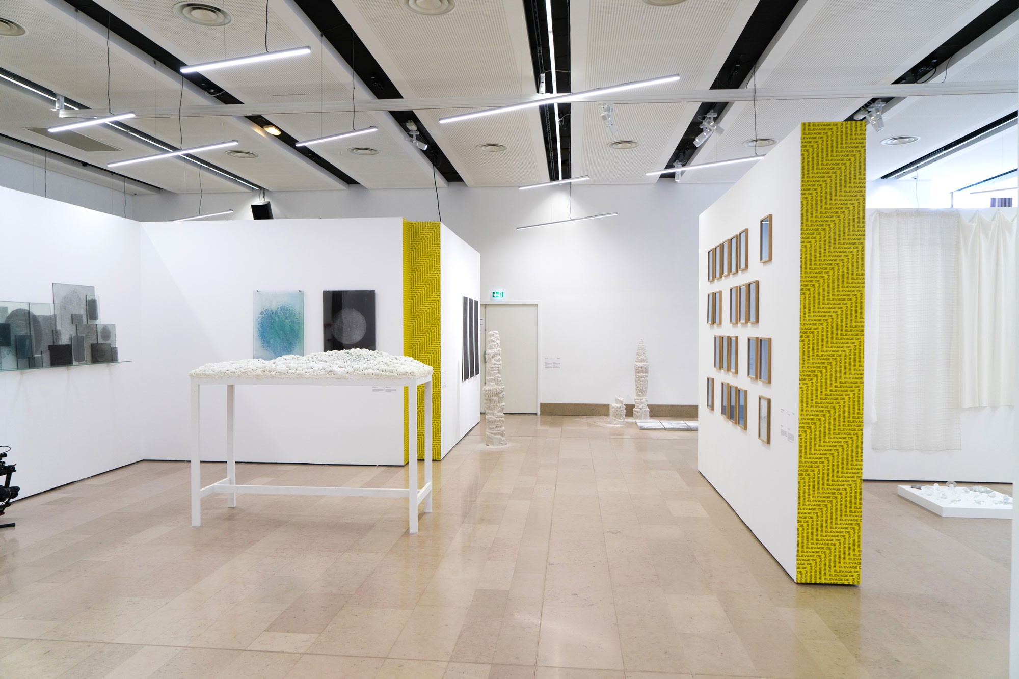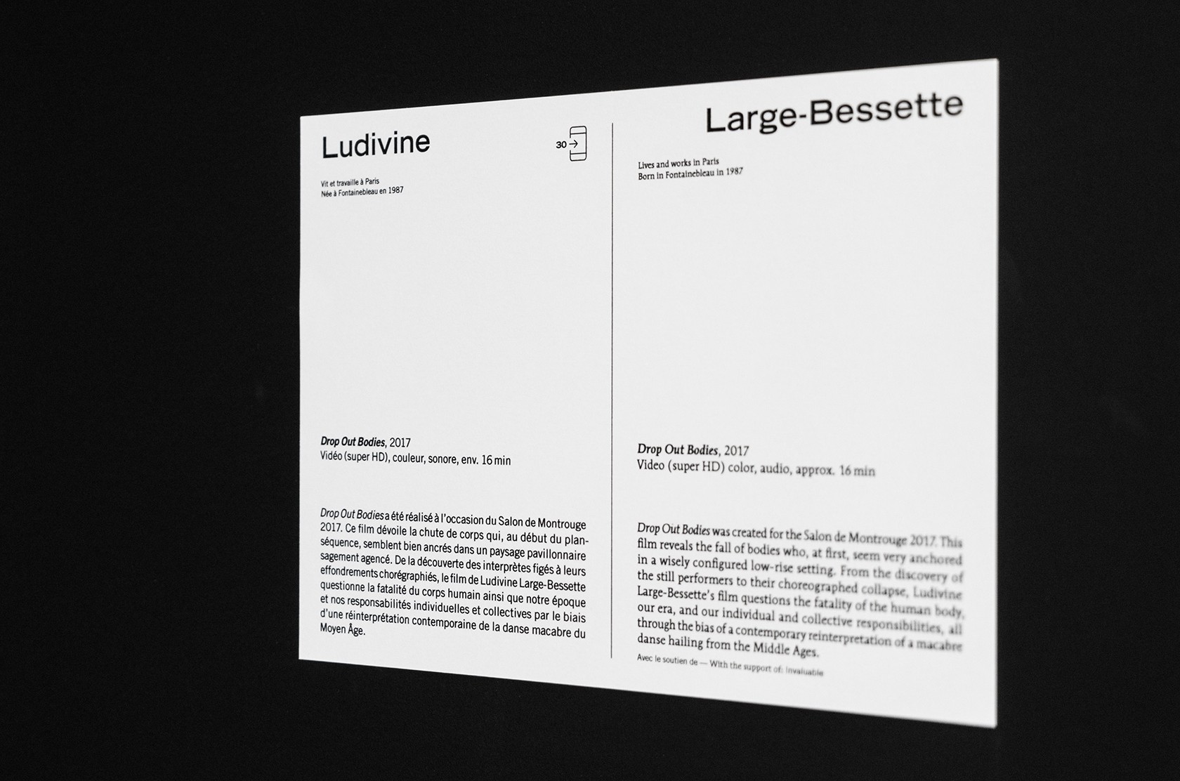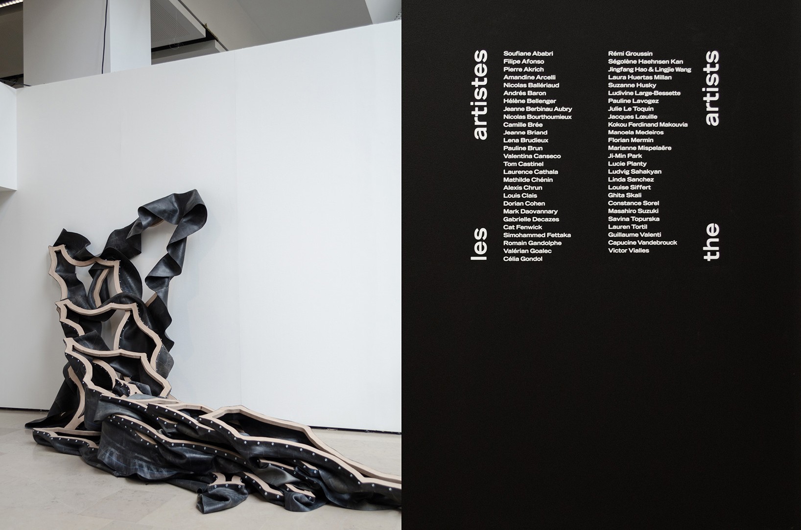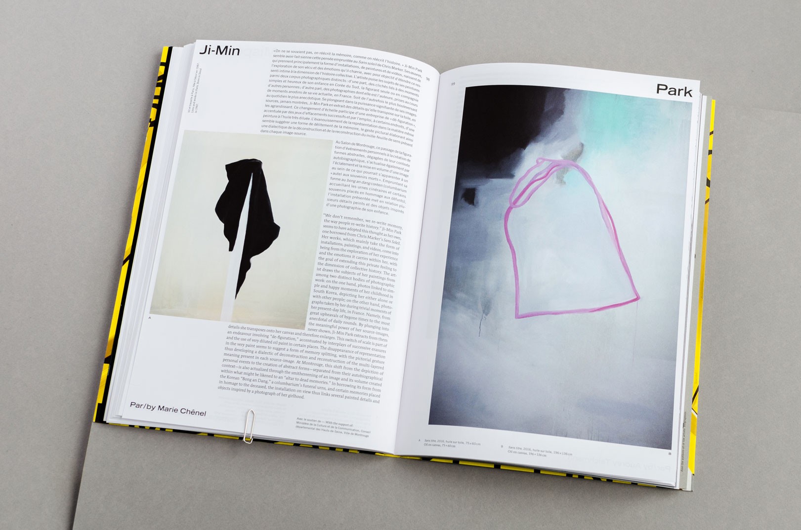 The exhibition number is still the main visual reference point for this event promoting young artists, but this year it has taken on a more sculptural appearance. With its bold shadow, it stands out from the background of the poster like an object of ambiguous materiality. Somewhere between 3D and drawing, the visual navigates through murky waters, magnifying and distorting the typography as it winds its way. From this playful script, a whole repertoire of dancing typographic motifs is deployed on the catalogue cover and as wallpaper. A new technical challenge was taken on for this visual, which combines the full range of the graphic designer's tools and is printed in an extravagant combination of Pantone neon yellow and black.