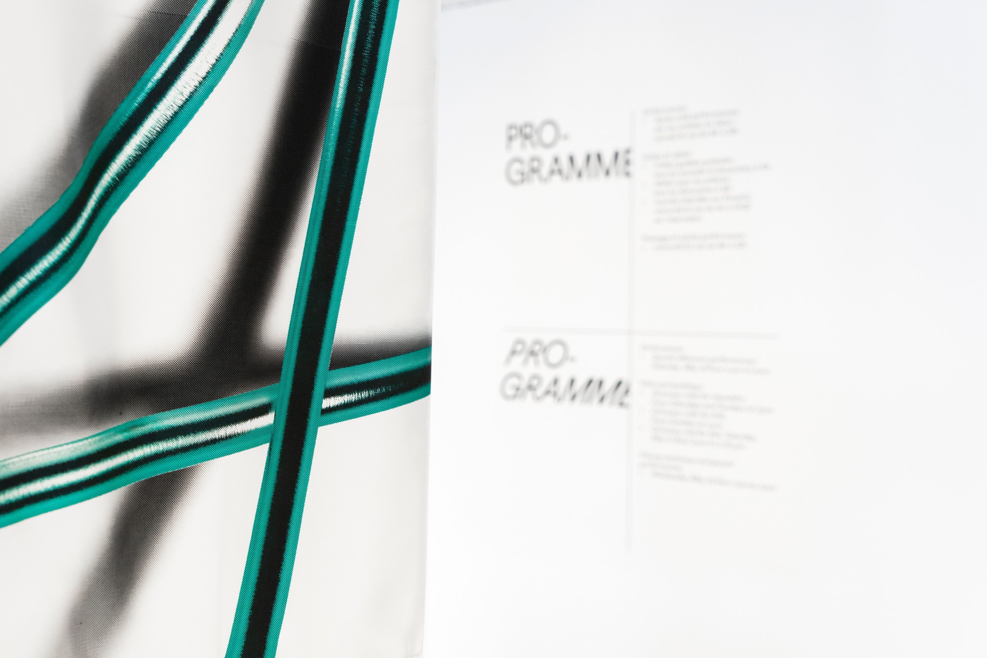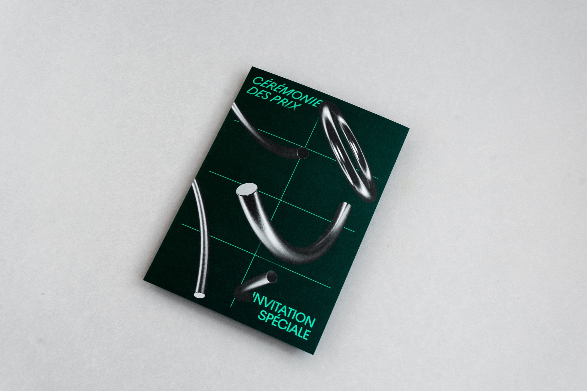 The large number, the hallmark of this fair dedicated to emerging artists, is once again the occasion for a formal exploration in 3D. This time we're proposing an anamorphic figure made up of several geometric modules, which we imagine resting on a gridded support. Following on from the poster, this geometric alphabet is presented in all its forms on the various media. A subtle palette of black, green and silver contrasts with the warm colours of previous years. For the scenography, the team collaborated with two craftsmen to design bespoke, efficient and economical flag holder furniture.