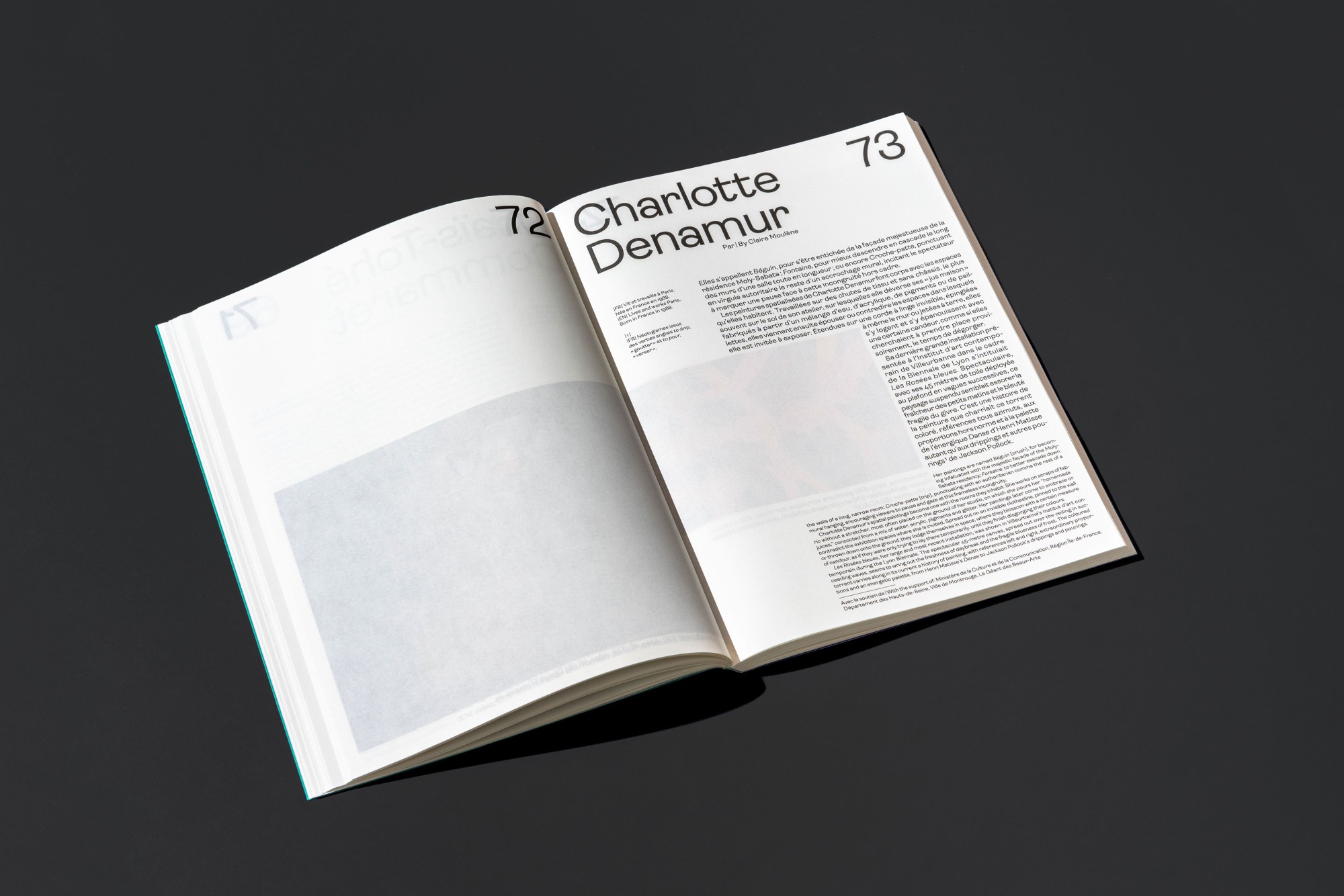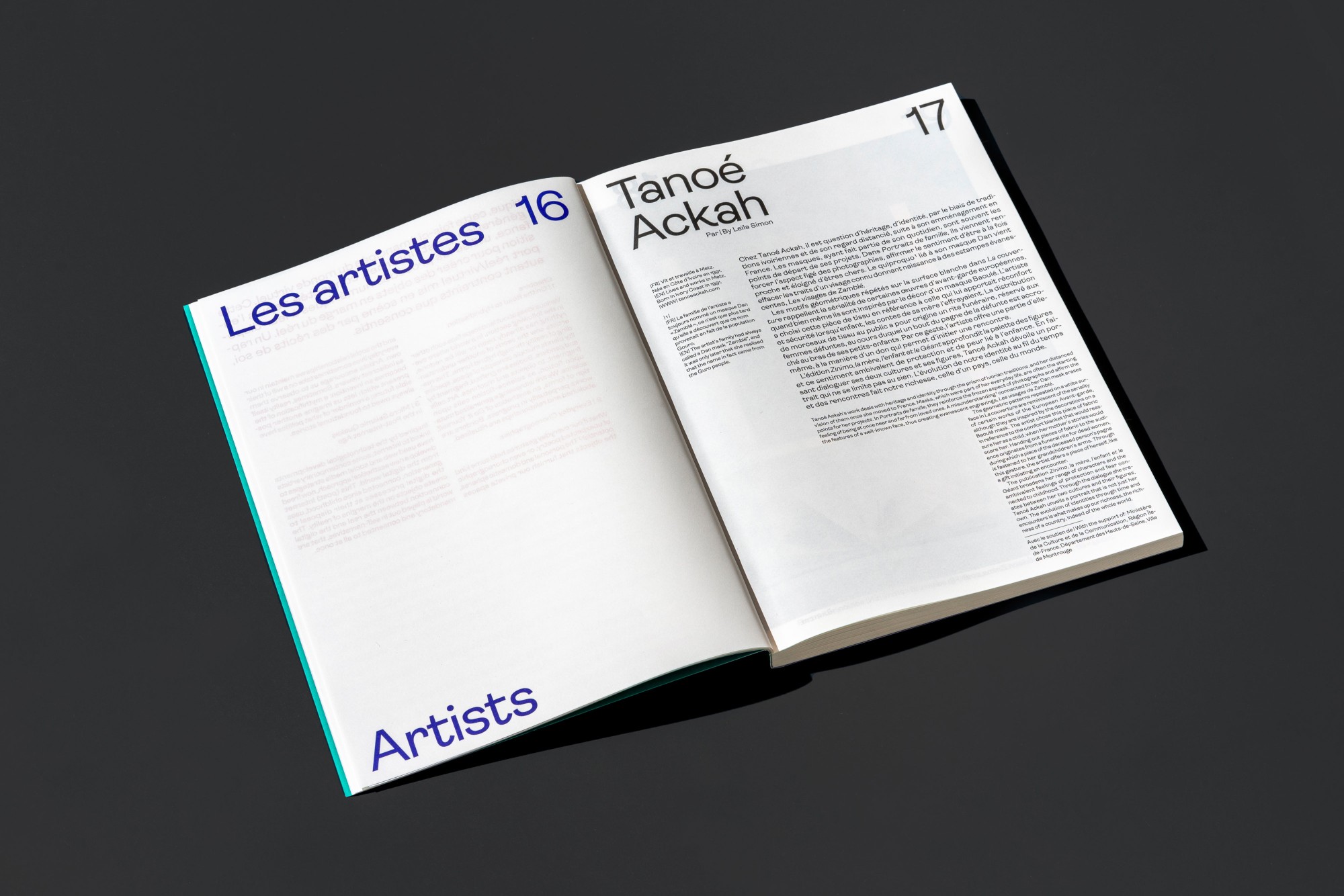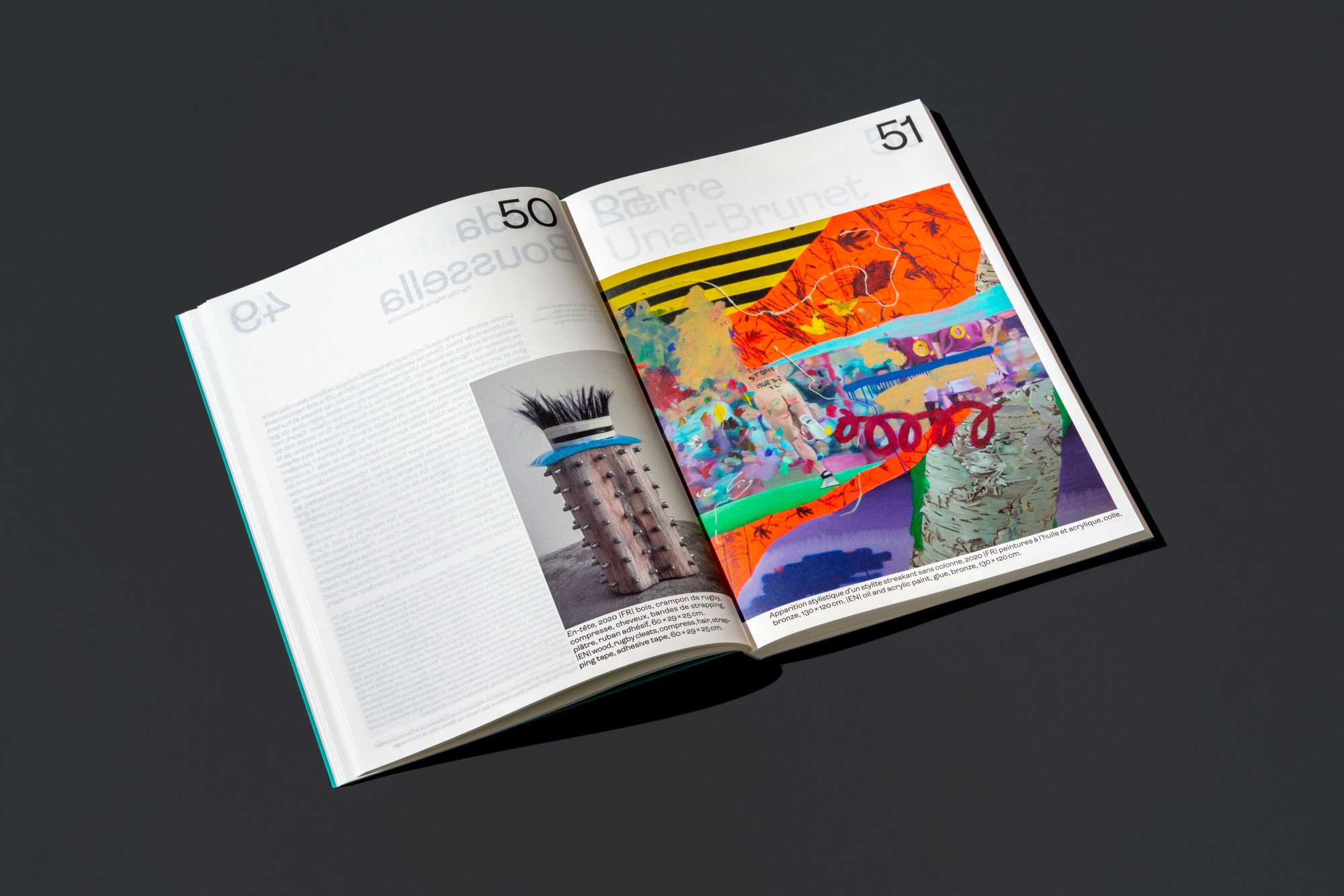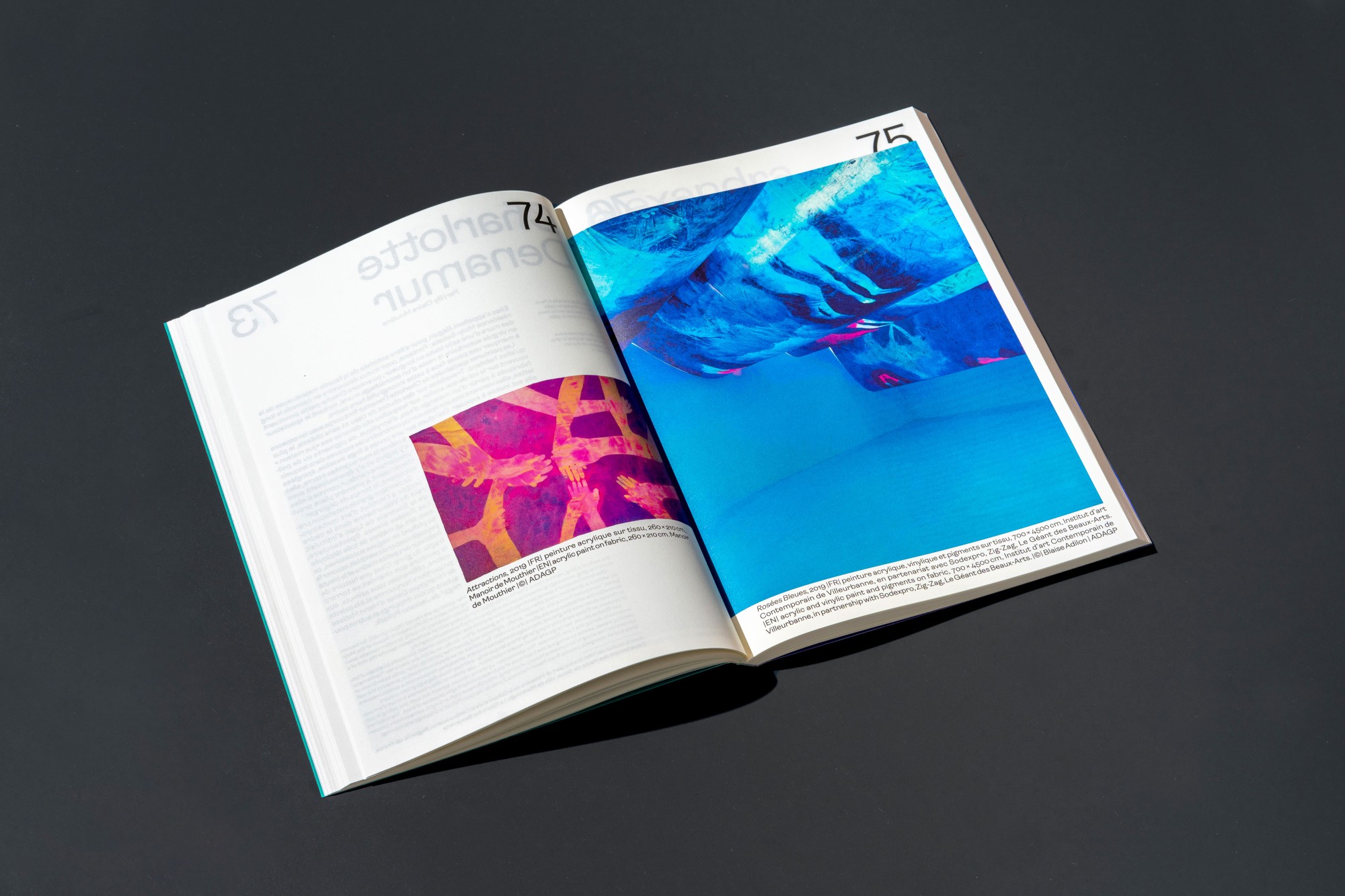 The catalogue was designed using ultra-thin paper, doubling the book’s volume and creating transparent overlays between the double-page artist texts and the facing image spreads. The layout adapts to the images seen in watermark, while generous type sizes animate the reading pages and draw the eye. Text and image respond to one another in a compact, dynamic composition, offering a harmonious rhythm to this bold editorial object.