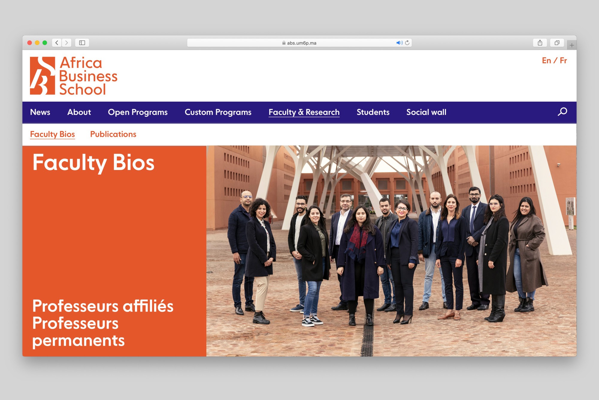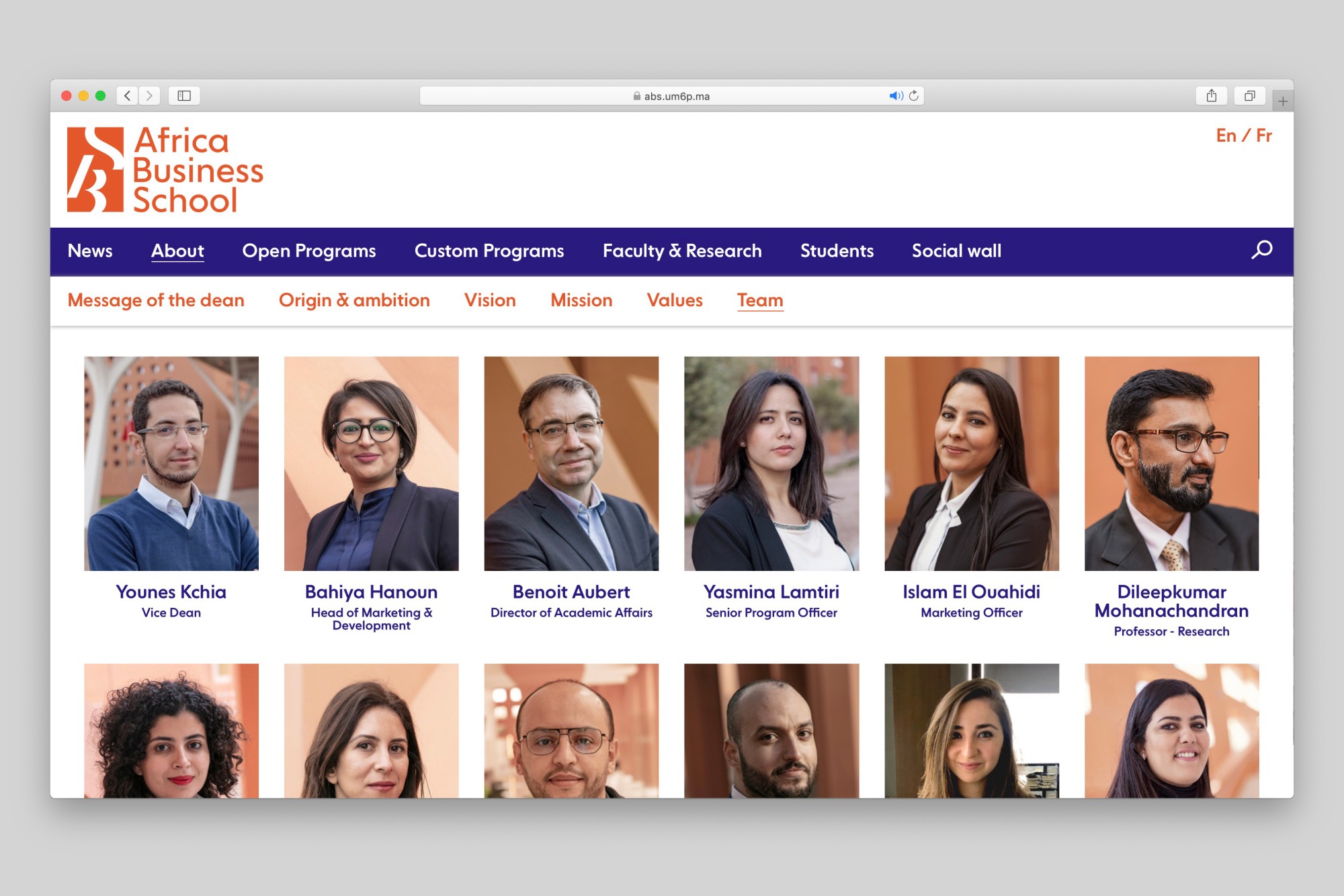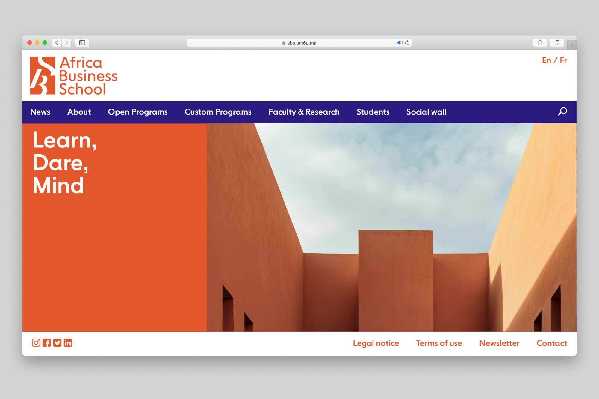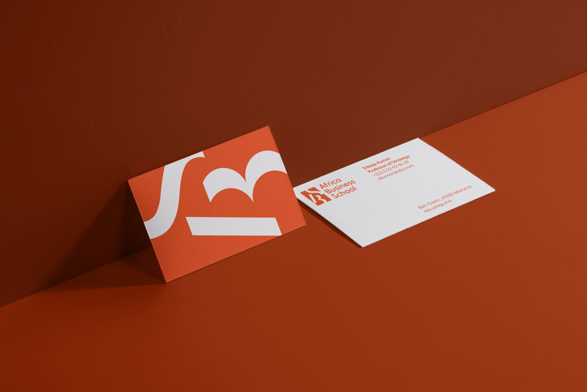 The logo consists of an original monogram based on the three letters A, B and S. The overall shape of the logo and the acronym is set in a strong, stable and ergonomic rectangle. It refers not only to the "setting" of the course, but also to the building of the Mohammed VI University, designed by Ricardo Bofill, a key element in the ABS environment. The colour of the building was the basis for the design of a bespoke range, including blue, which is very present in Morocco from the sea to the land, ochre, which is reminiscent of the desert, and the red of the saffron fields and African countries.
