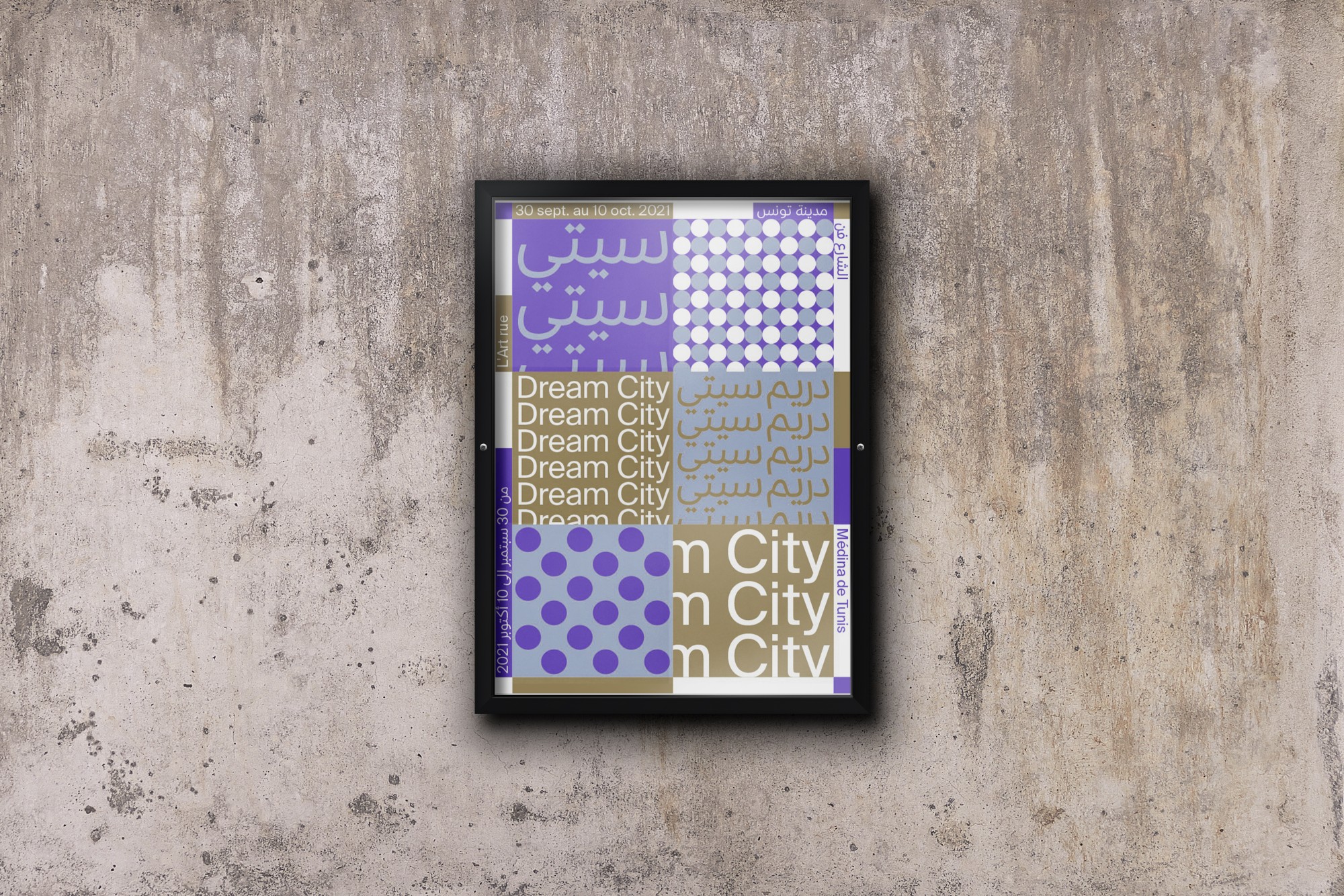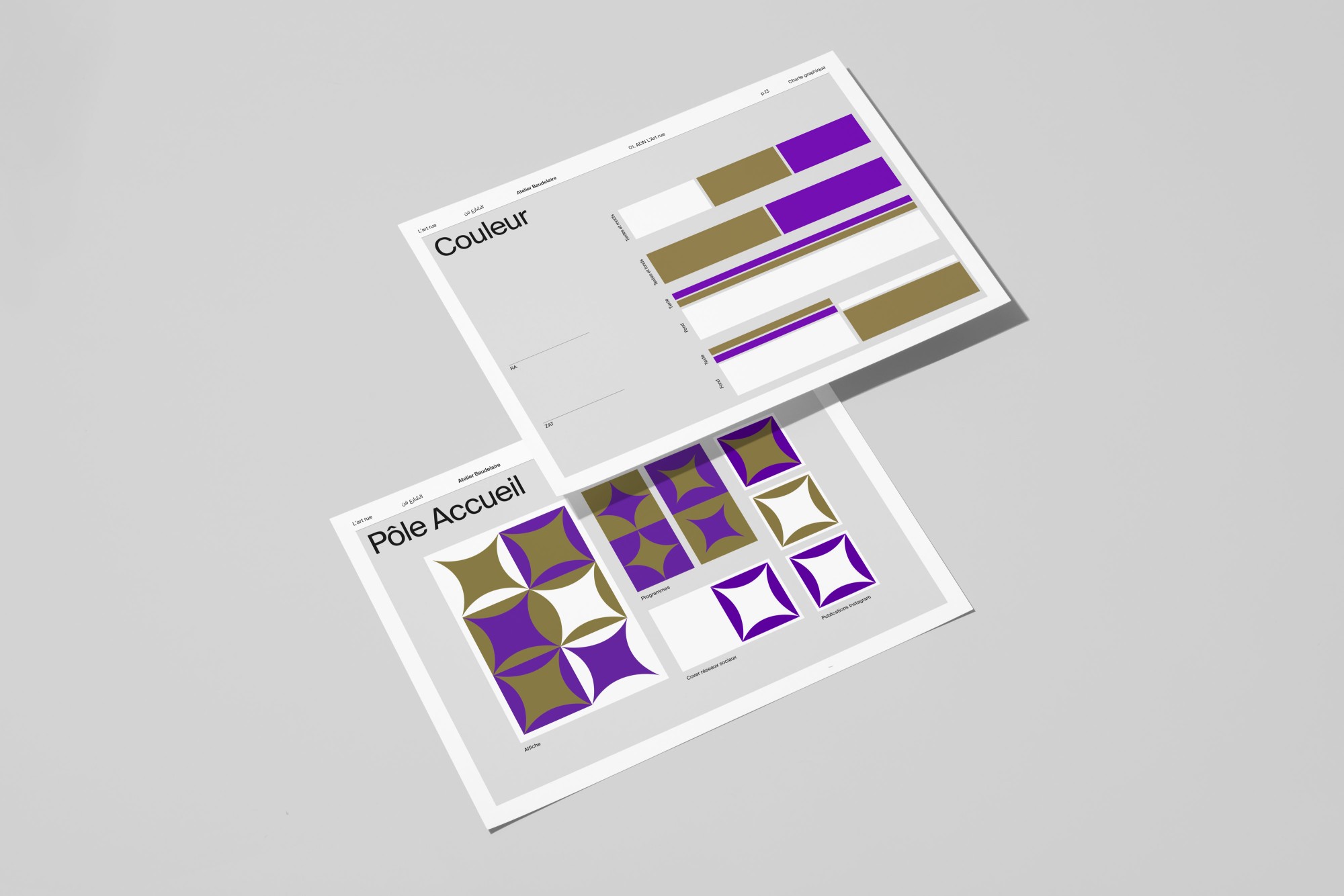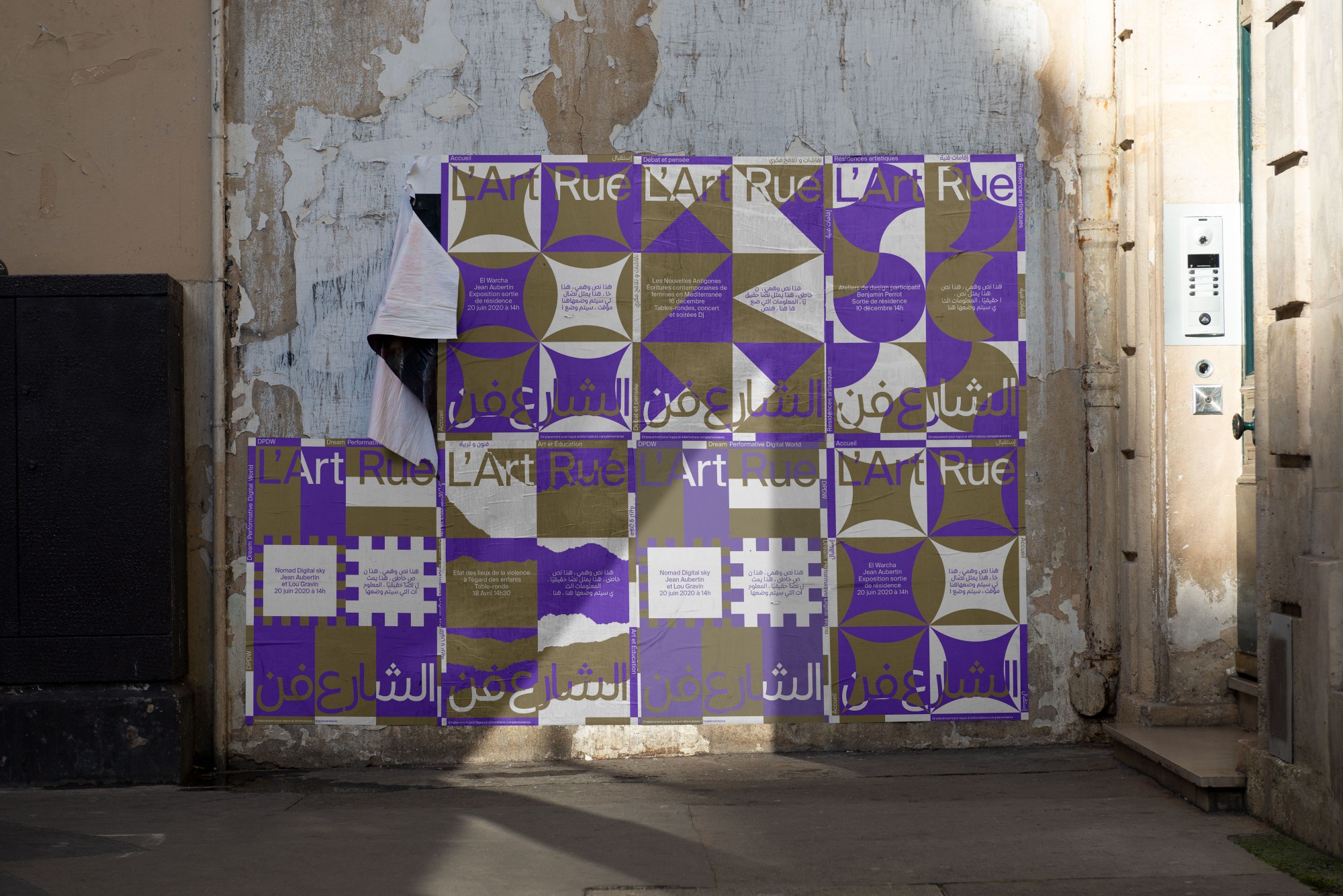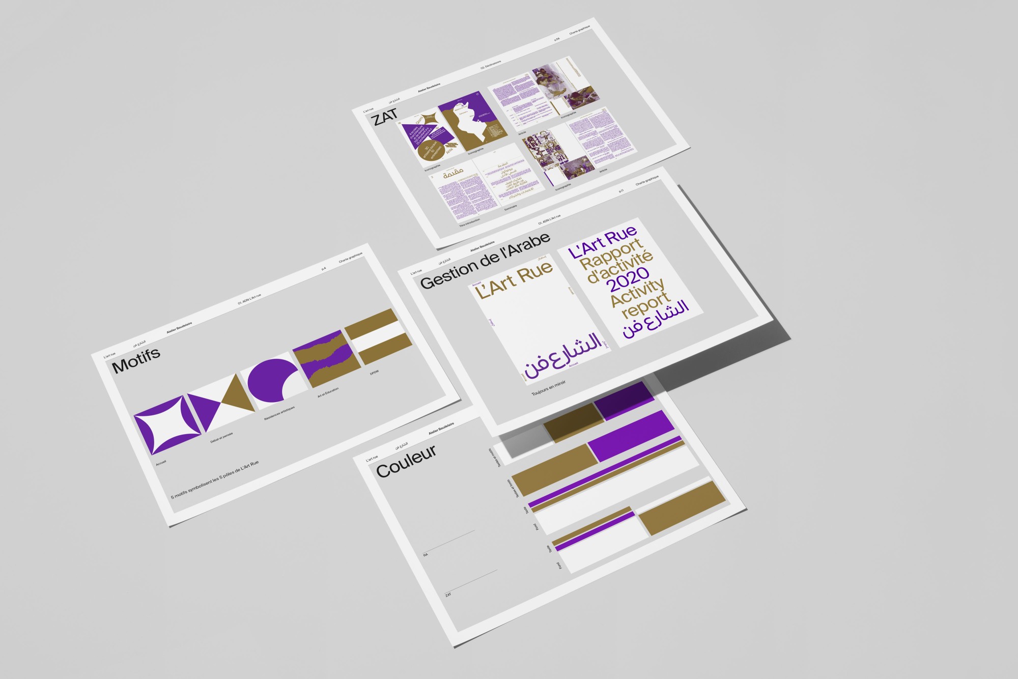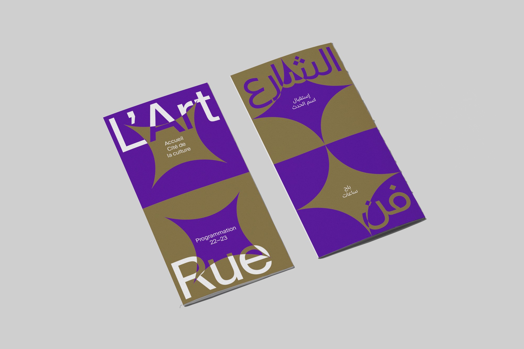 Led by choreographers Selma and Sofiane Ouissi, L’Art Rue is a space for creation, experimentation, and research across practices and cultures. Based in the Medina of Tunis, the association extends its reach — from one territory, city, language, discipline to another — through a transdisciplinary and international program. We developed a modular, trilingual (Arabic, French, English) visual identity system that unfolds through distinct patterns representing each of the organization’s activity areas. Easily recognizable, playful, and adaptable, this identity is redesigned every two years around a new duo of colors.