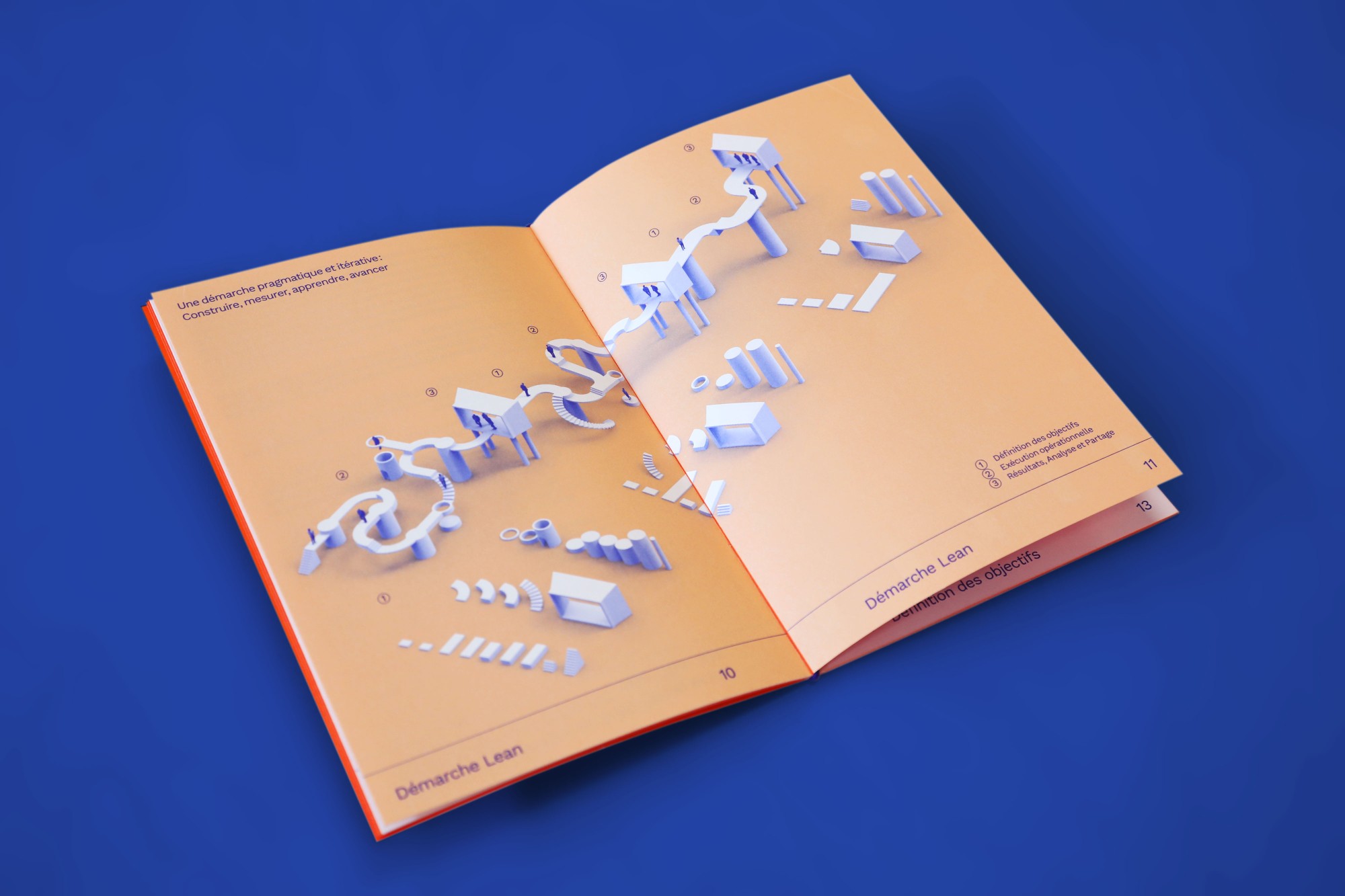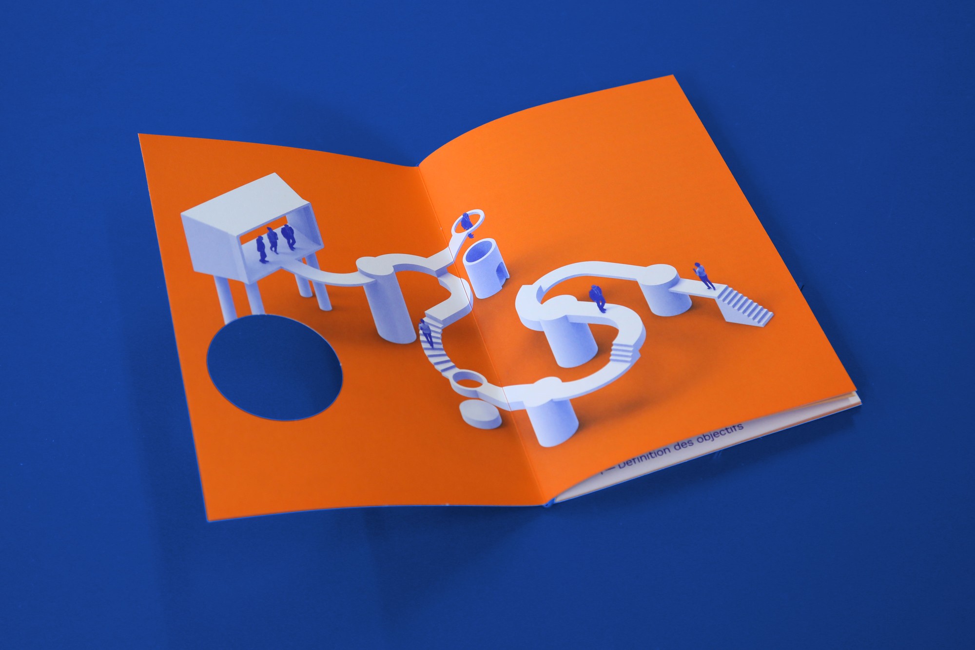 More than an editorial charter, we propose a strong DNA based on a radical typographic layout, two contrasting colours and a series of bespoke 3D illustrations. The research process behind each compass results in a series of micro-architectures inspired by garden madness. From one compass to the next, these unusual 3D structures are made up of the same geometric modules, which can be broken down over the course of a few pages. In the centre of the booklet, attached by a coloured elastic band, the reader is offered a poster which, when unfolded, summarises the contents of the compass through a detailed representation of the architecture in volume. The visual representations are based on conventions used in architecture and 3D design processes.