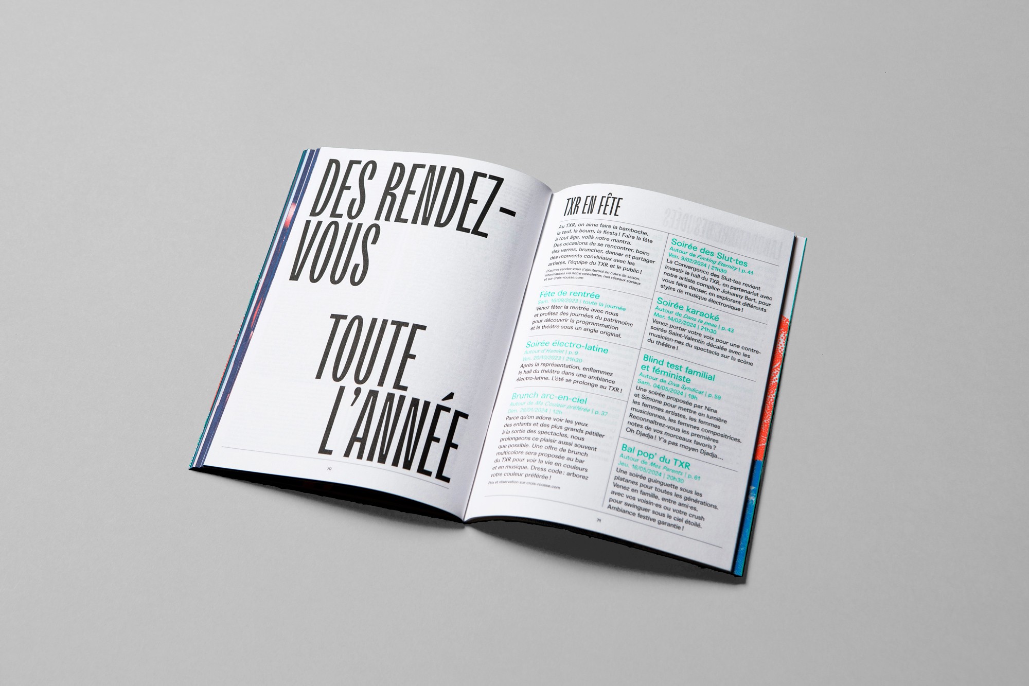 The visuals for this 2023-24 season retain the principle of overlapping planes and layers between typography, landscapes and colorful characters. The play of scale and perspective creates a poetic landscape, somewhere between abstract and figurative. The staircases, which echo the hills of the Croix-Rousse, are a key part of the theater's identity, which we will continue to bring to life throughout the seasons.