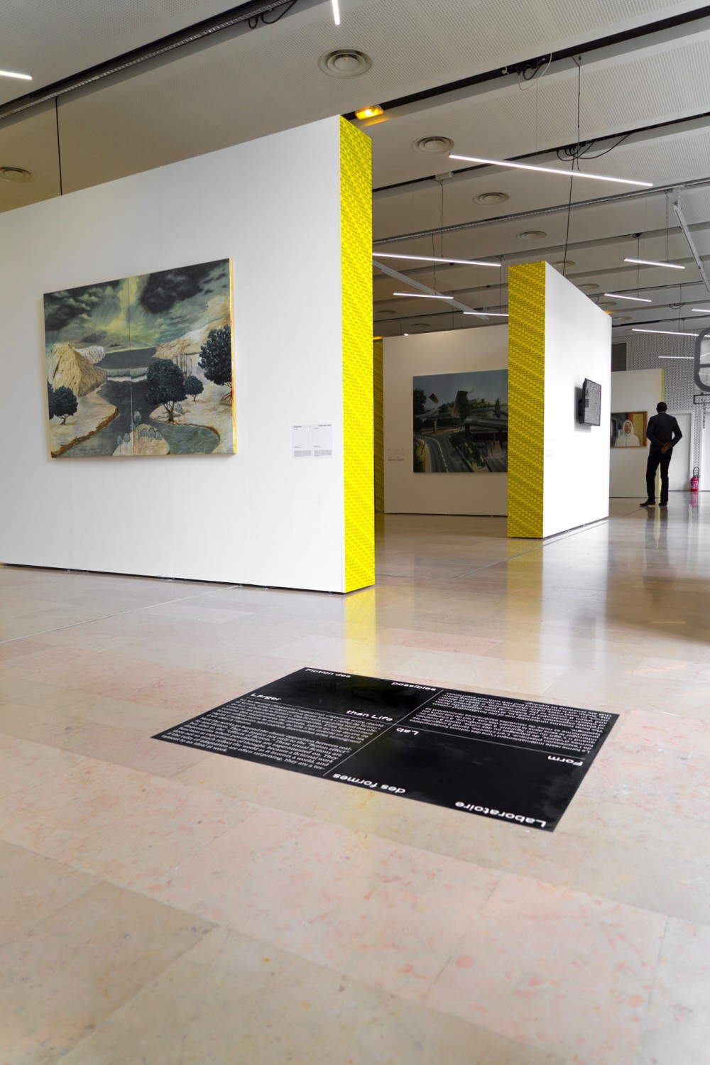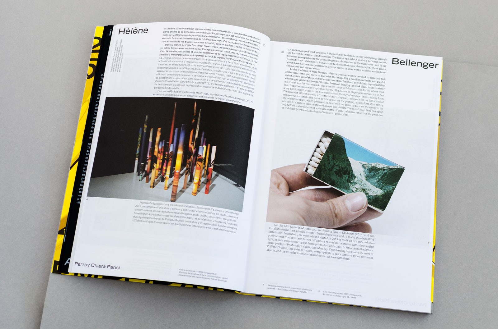 Le numéro du salon s’impose toujours comme principal repère visuel dans la communication de cet événement en faveur de la jeune création artistique, et prends cette année une tournure plus sculpturale. Pourvu d’une ombre franche, il se détache du fond de l’affiche comme une véritable objet à la matérialité ambiguë. Entre 3D et dessin, le visuel navigue en eau trouble, grossissant et déformant les typographies au travers de son parcours sinueux. A partir de cette écriture ludique se déploie en sur-couverture du catalogue et en papiers-peints, tout un répertoire de motifs typographiques dansants. Un nouveau défi technique est relevé pour ce visuel qui combine toute la palette des outils du graphiste, et s’imprime dans une combinaison flamboyante de Pantone jaune fluo et de noir.