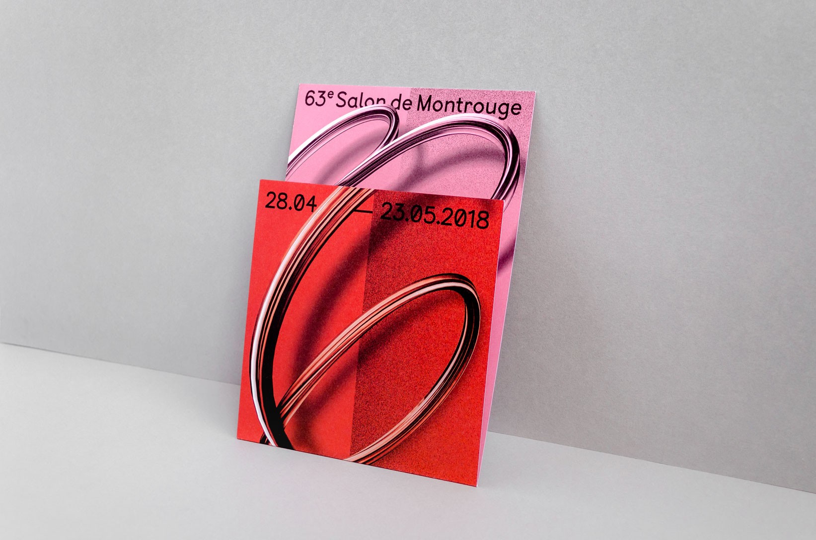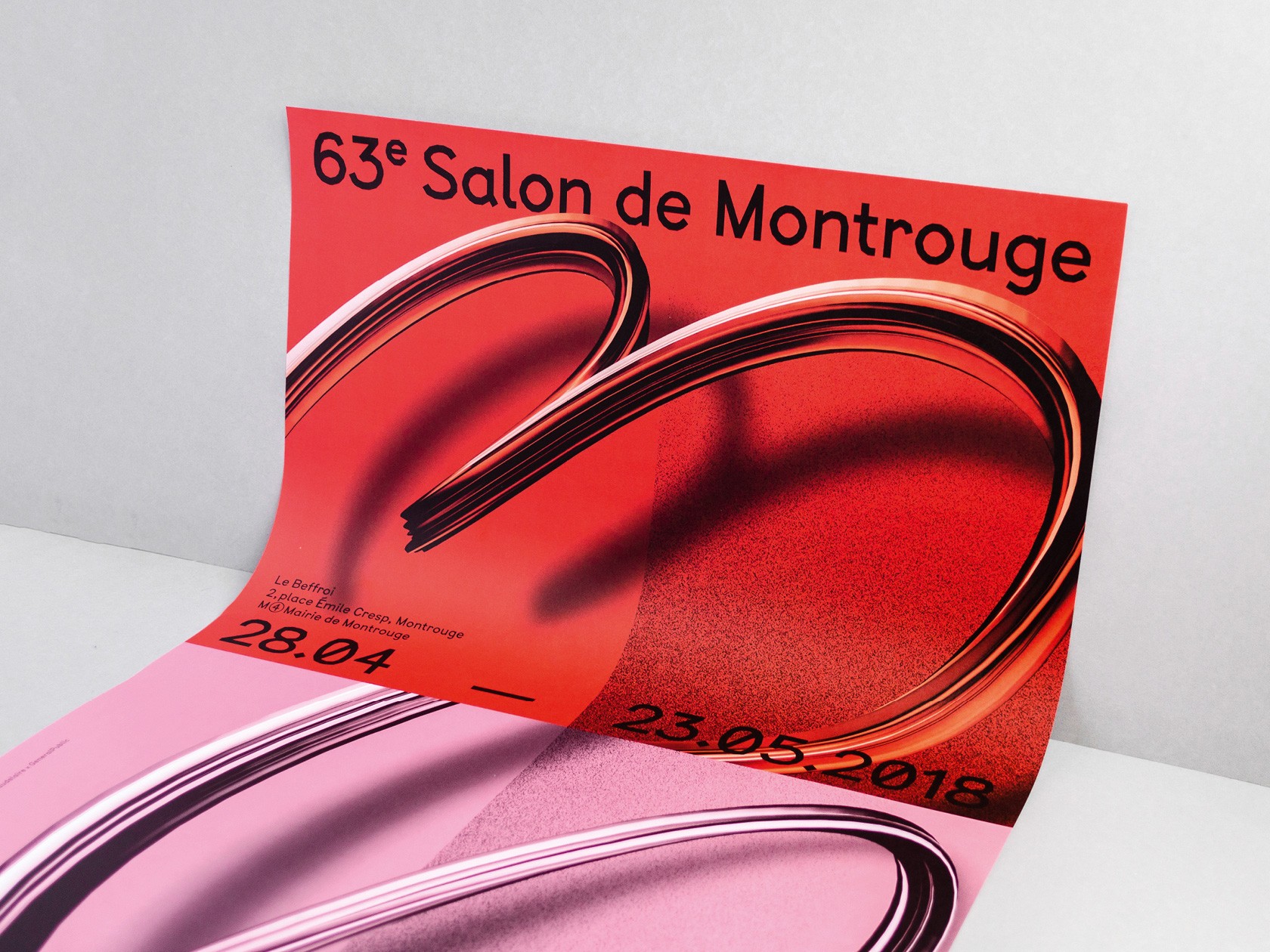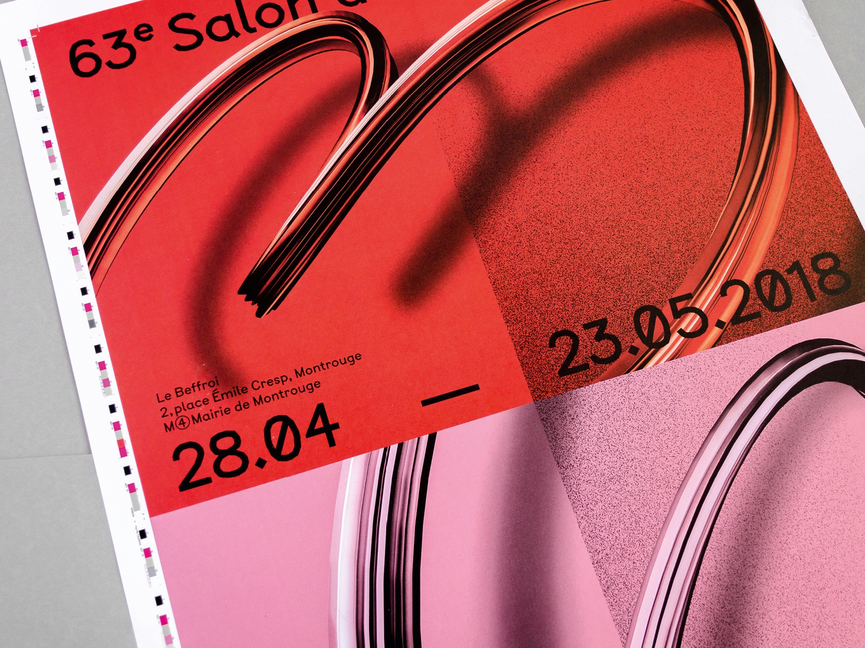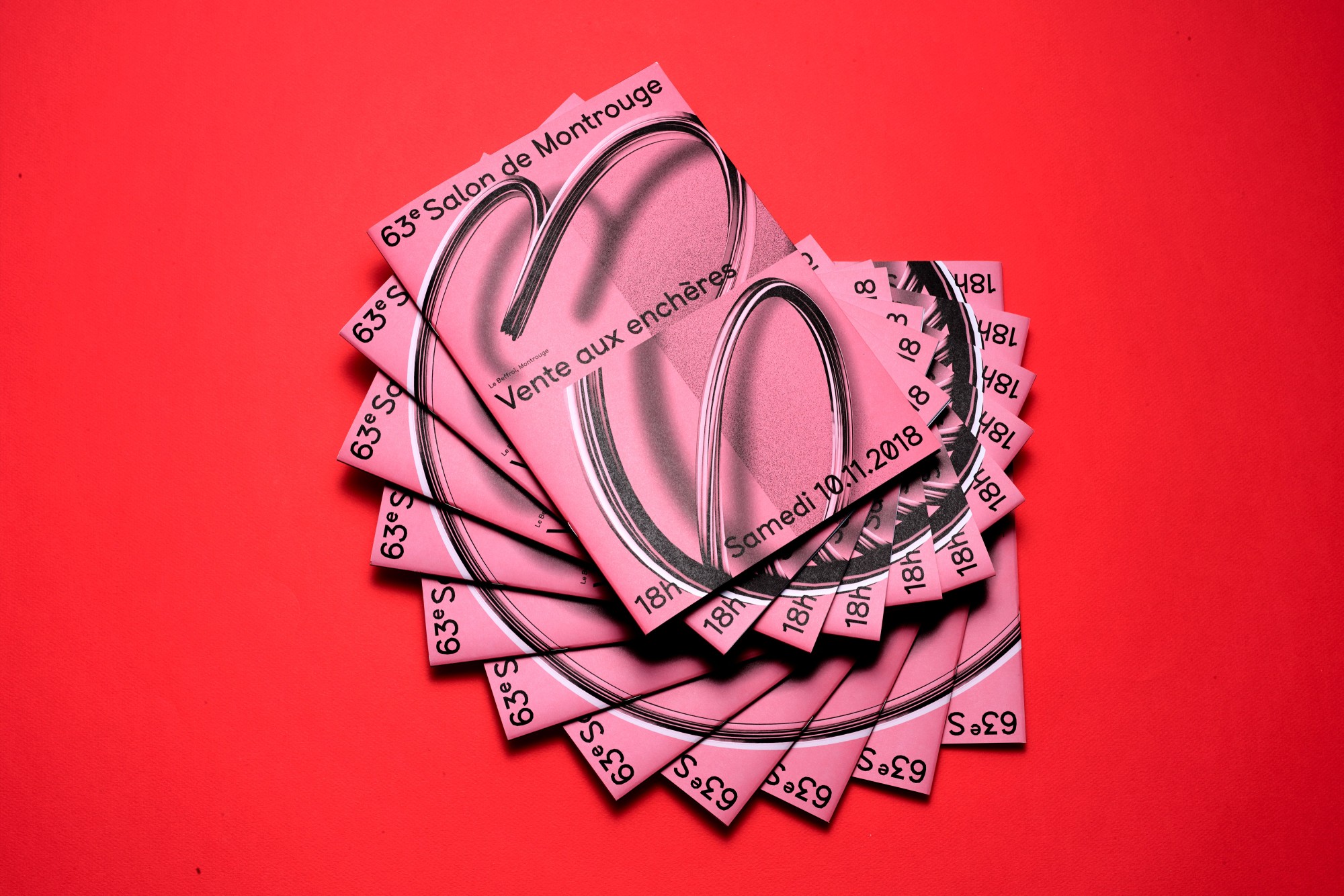 Le système de subdivisions et de cadrages, l’emploi de textures de « bruit », ainsi que les différentes combinaisons de rouges vif et rose, permettent un large déploiement de cette identité aux accents irréels. Entre peinture, sculpture, et objet numérique, le 63 représente la diversité des médiums présentés au salon. La signalétique déploie elle aussi une grande variété de médiums : des affiches collées sur les murs peints en rose et rouge et recouverts de sprays de peinture réalisés manuellement.