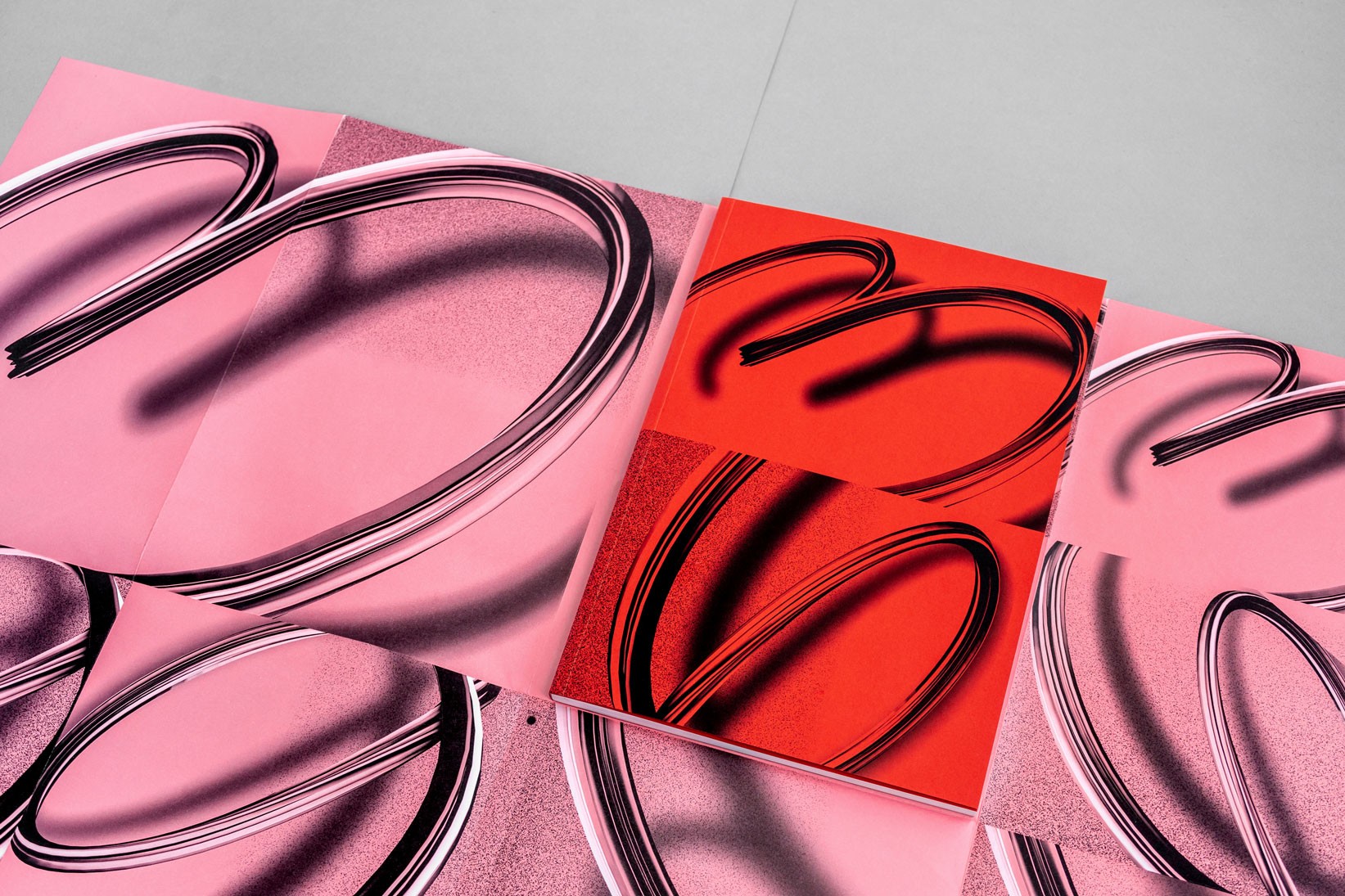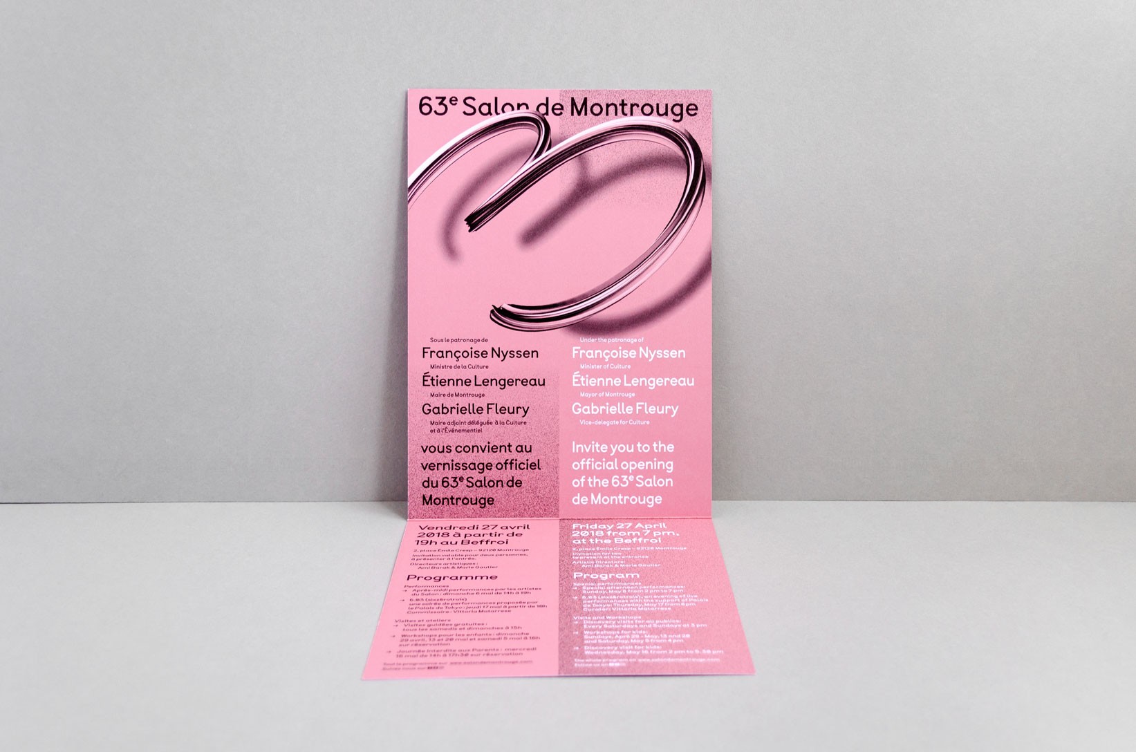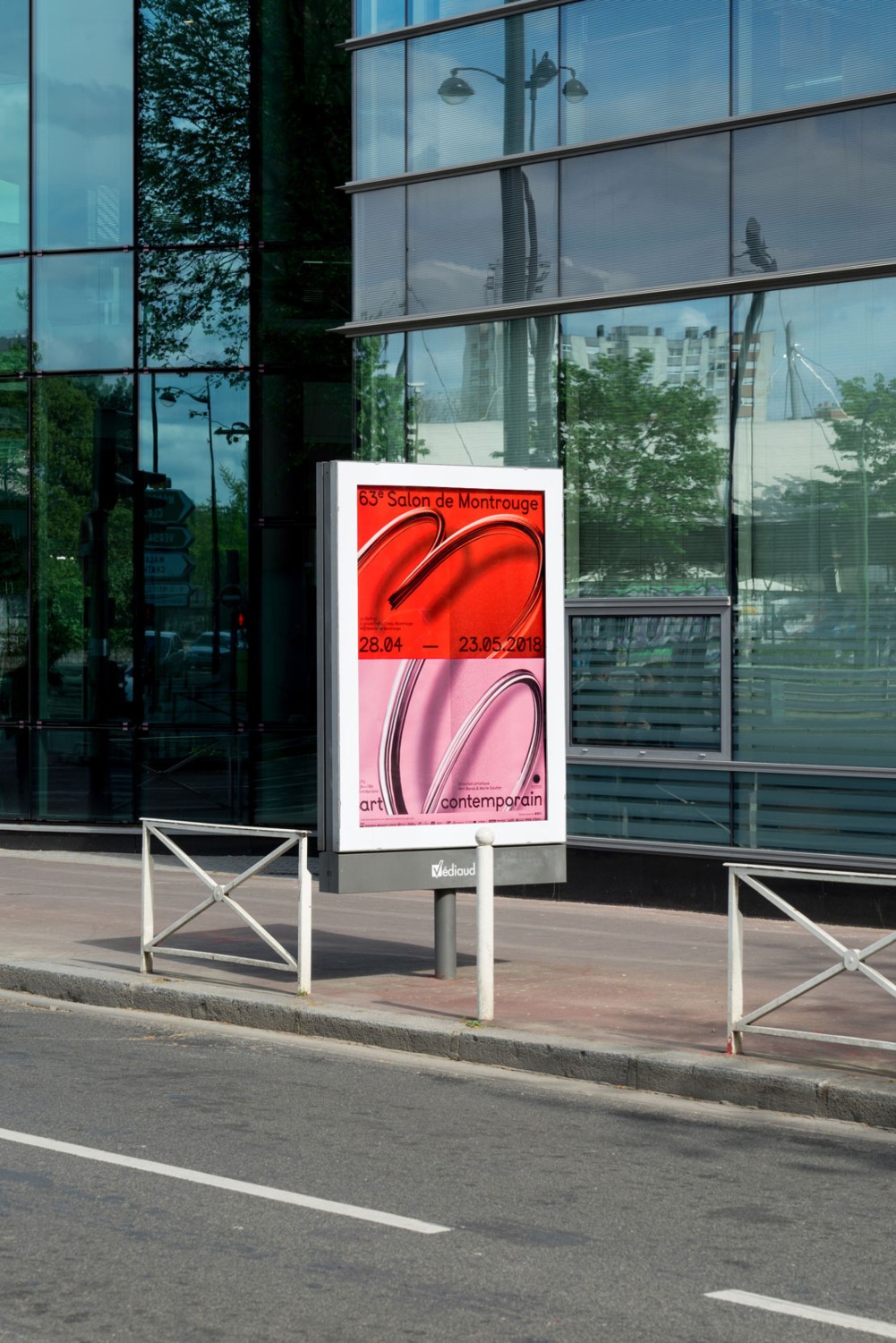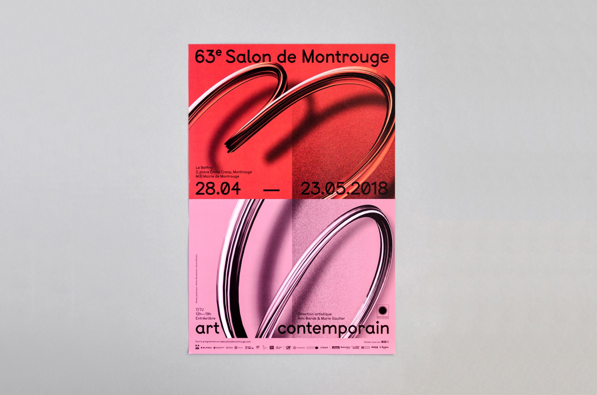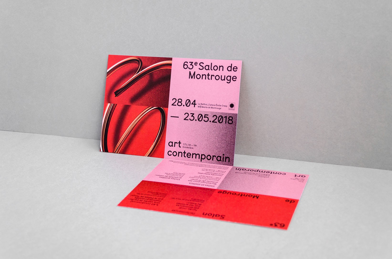 Le système de subdivisions et de cadrages, l’emploi de textures de « bruit », ainsi que les différentes combinaisons de rouges vif et rose, permettent un large déploiement de cette identité aux accents irréels. Entre peinture, sculpture, et objet numérique, le 63 représente la diversité des médiums présentés au salon. La signalétique déploie elle aussi une grande variété de médiums : des affiches collées sur les murs peints en rose et rouge et recouverts de sprays de peinture réalisés manuellement.