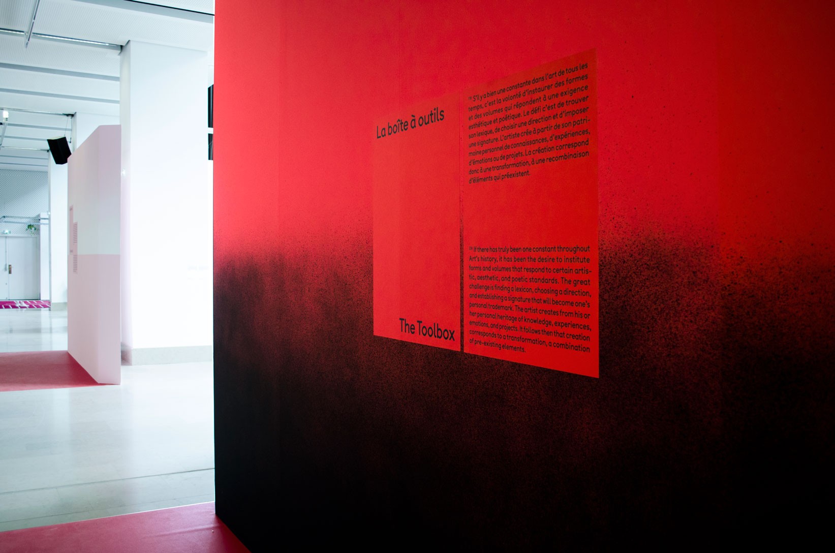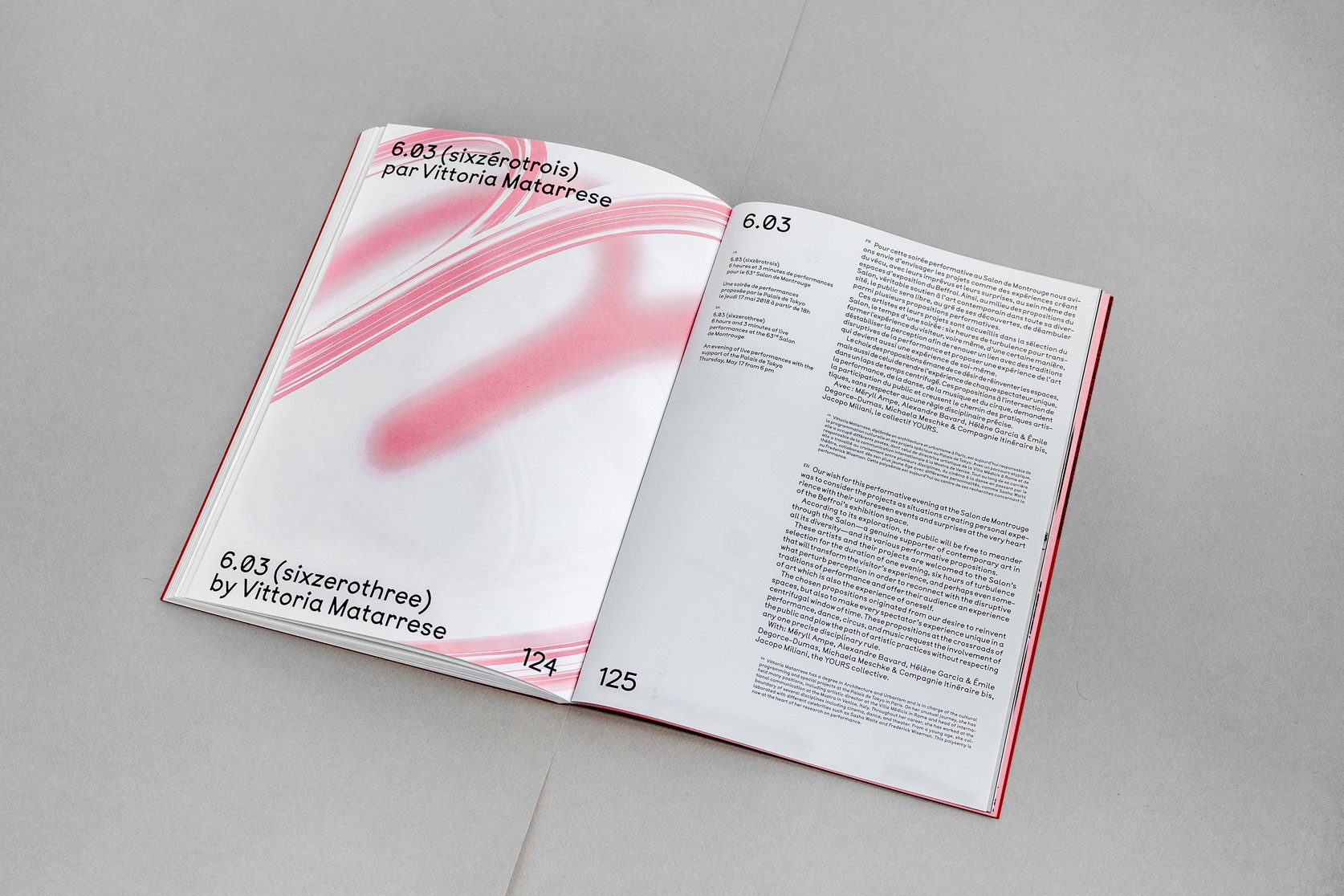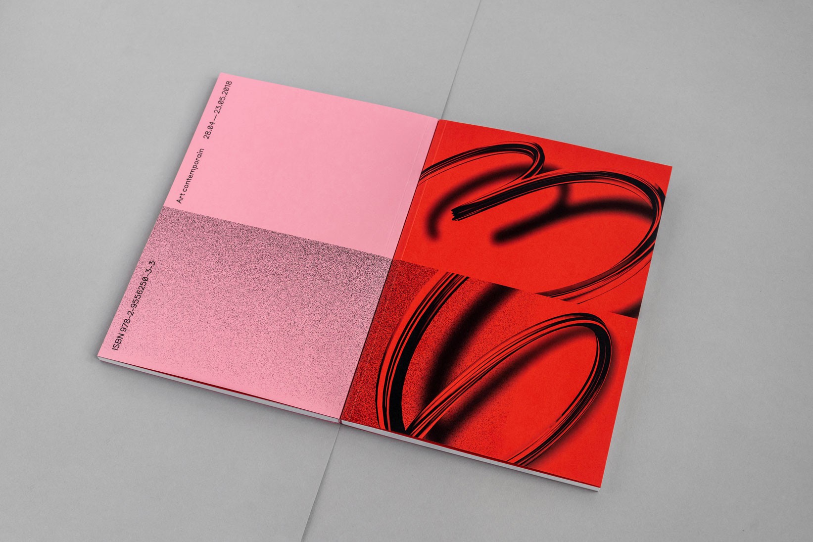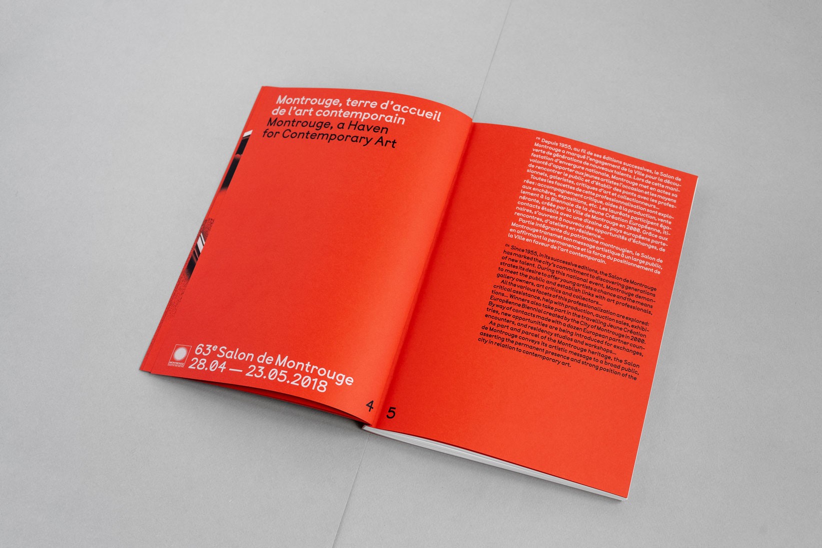 Le système de subdivisions et de cadrages, l’emploi de textures de « bruit », ainsi que les différentes combinaisons de rouges vif et rose, permettent un large déploiement de cette identité aux accents irréels. Entre peinture, sculpture, et objet numérique, le 63 représente la diversité des médiums présentés au salon. La signalétique déploie elle aussi une grande variété de médiums : des affiches collées sur les murs peints en rose et rouge et recouverts de sprays de peinture réalisés manuellement.