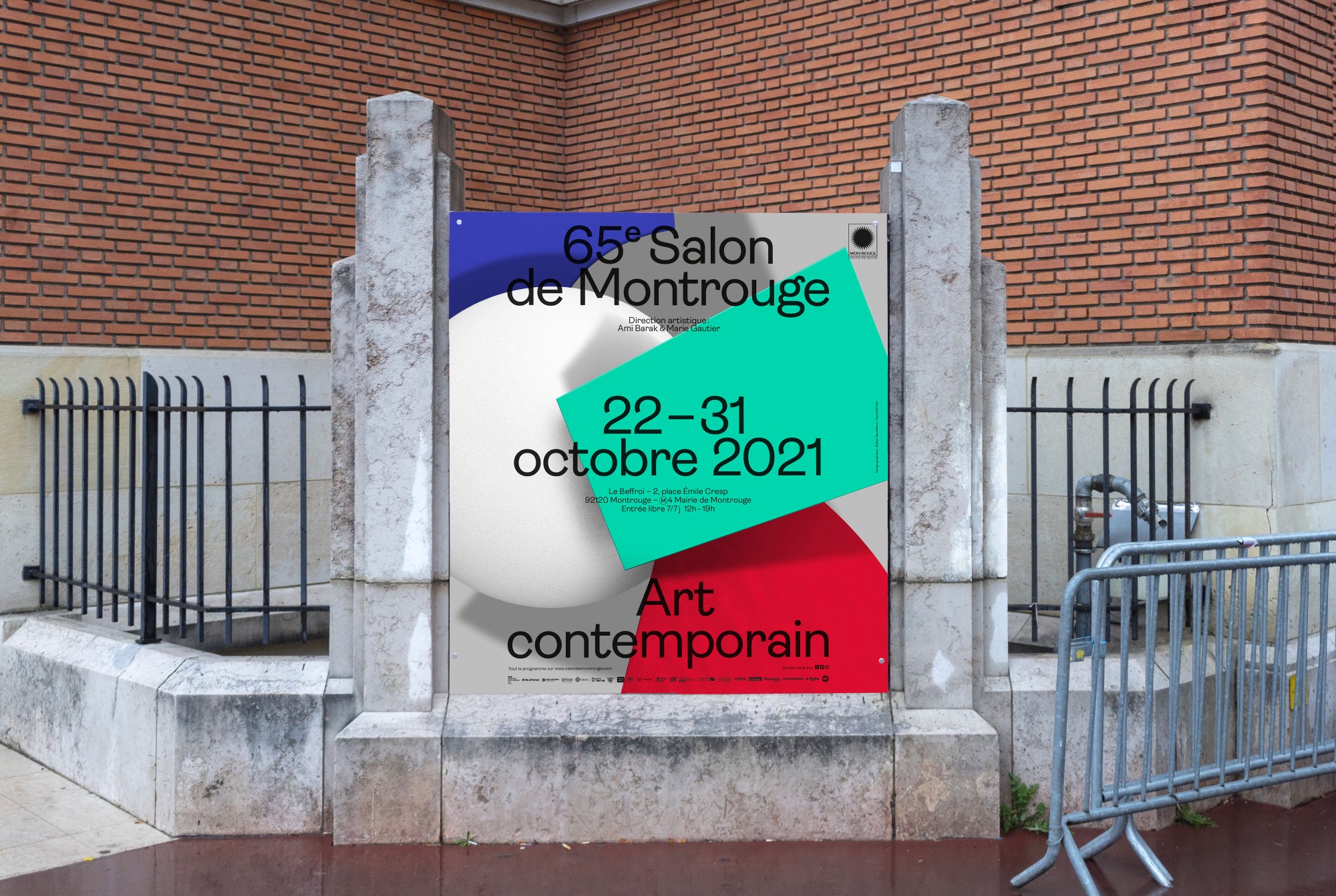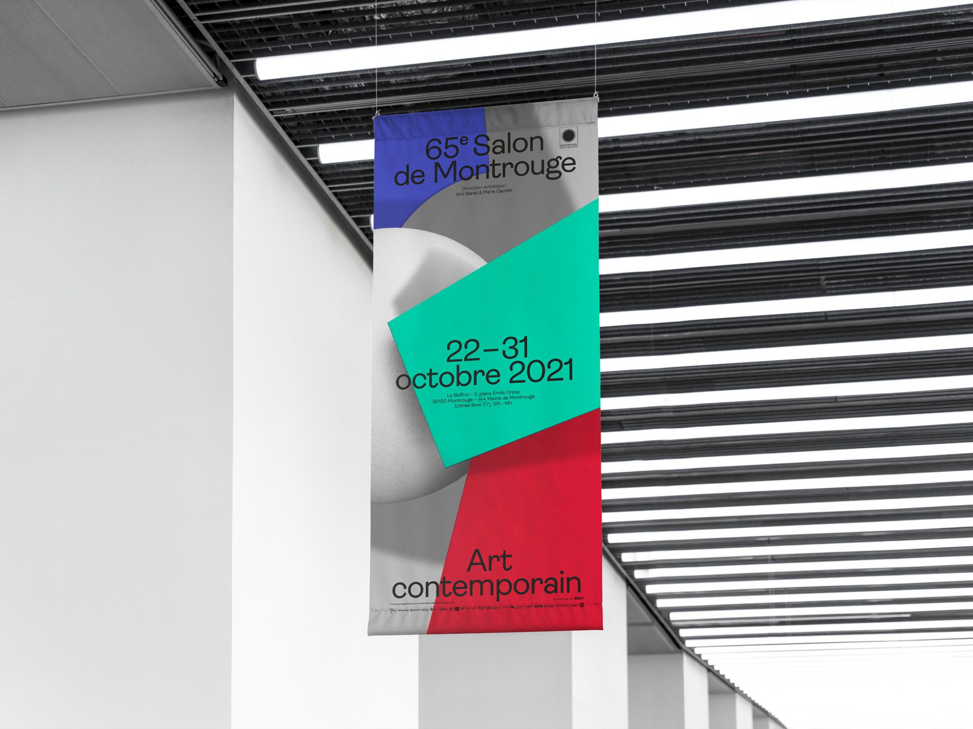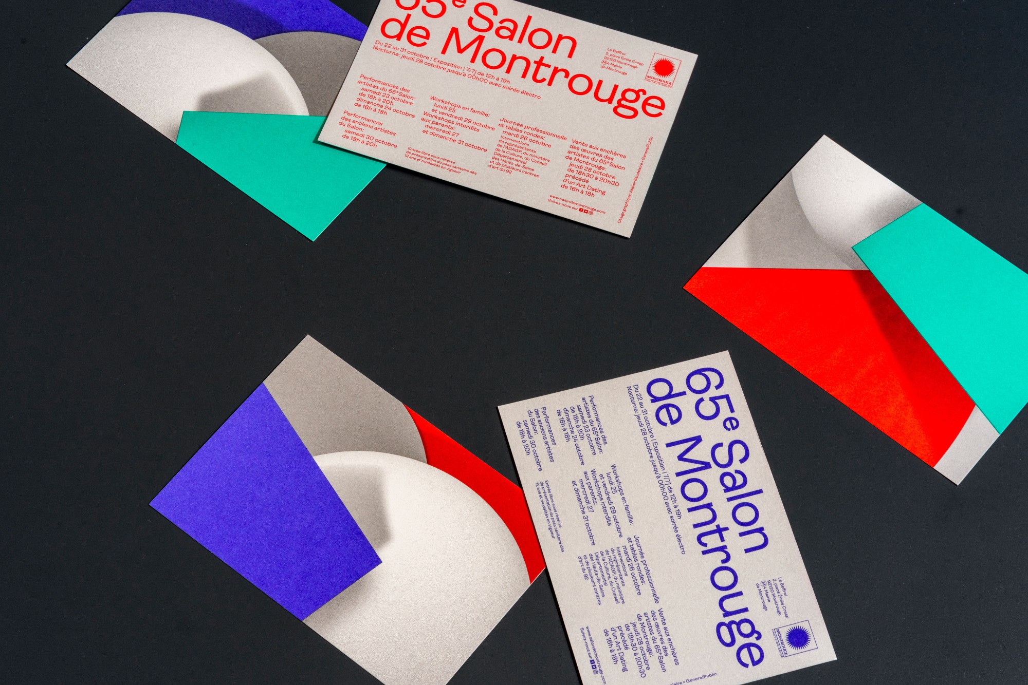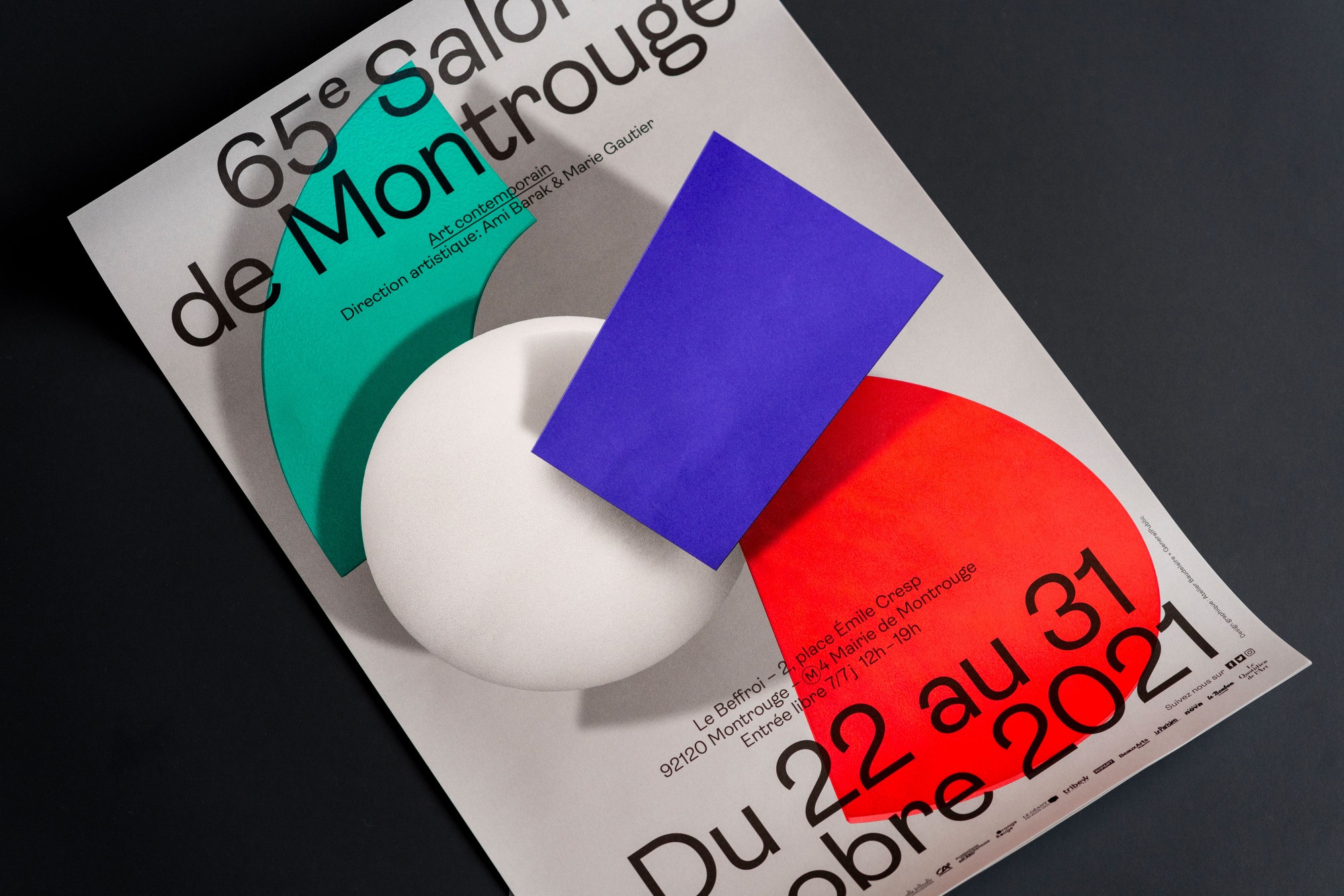 Pour la quatrième année consécutive, l’Atelier Baudelaire et le studio GeneralPublic s’associent pour signer l’identité, le catalogue et la signalétique du Salon de Montrouge, exposition d’art contemporain. En cohérence avec les saisons passées, l’identité arbore le numéro 65 en volume, dans un esprit plus sculptural encore, débordant du cadre jusqu’à devenir un jeu de formes et de couleurs. Affiches, catalogue, invitations, annonces presse, signalétique, etc déploient l’identité par des variations de cadrages et d’échelles. Pour la scénographie, les formes XXL habillent les cimaises, débordent sur le sol et structurent l’espace.