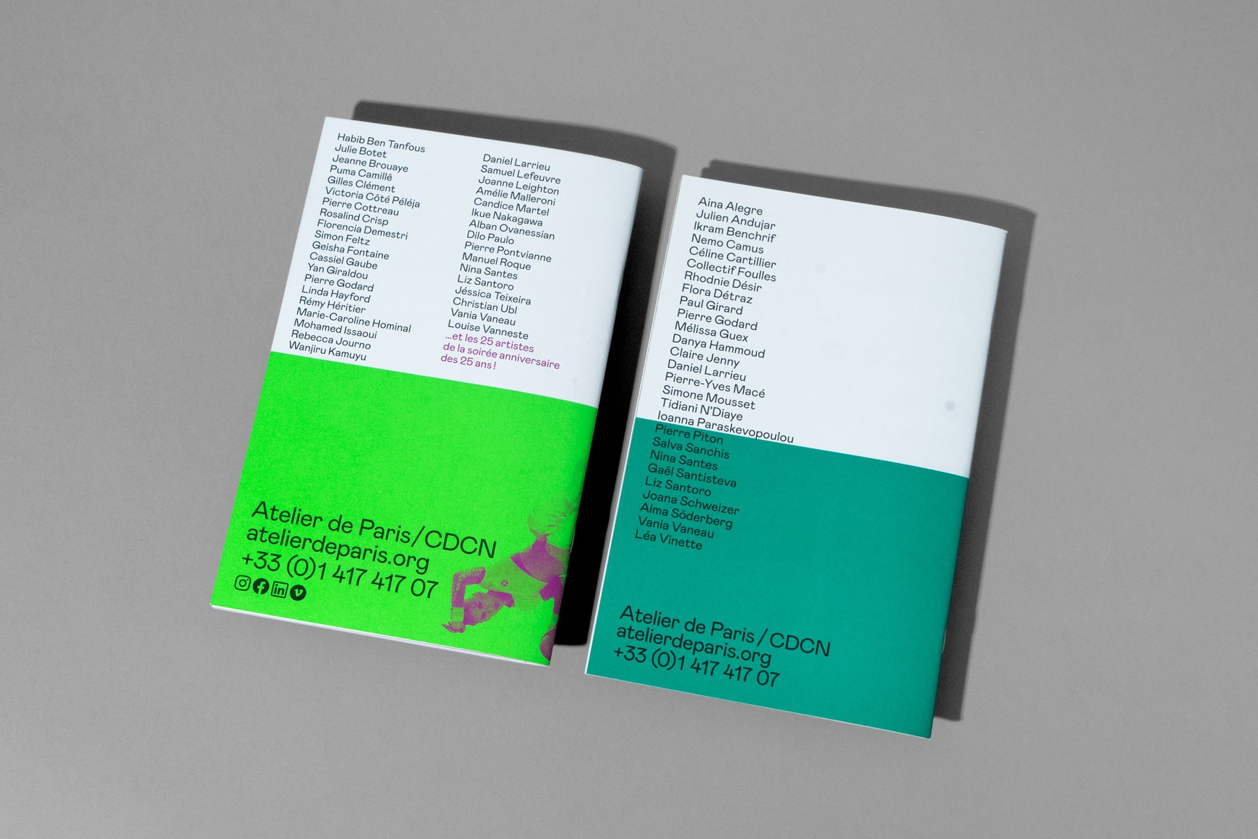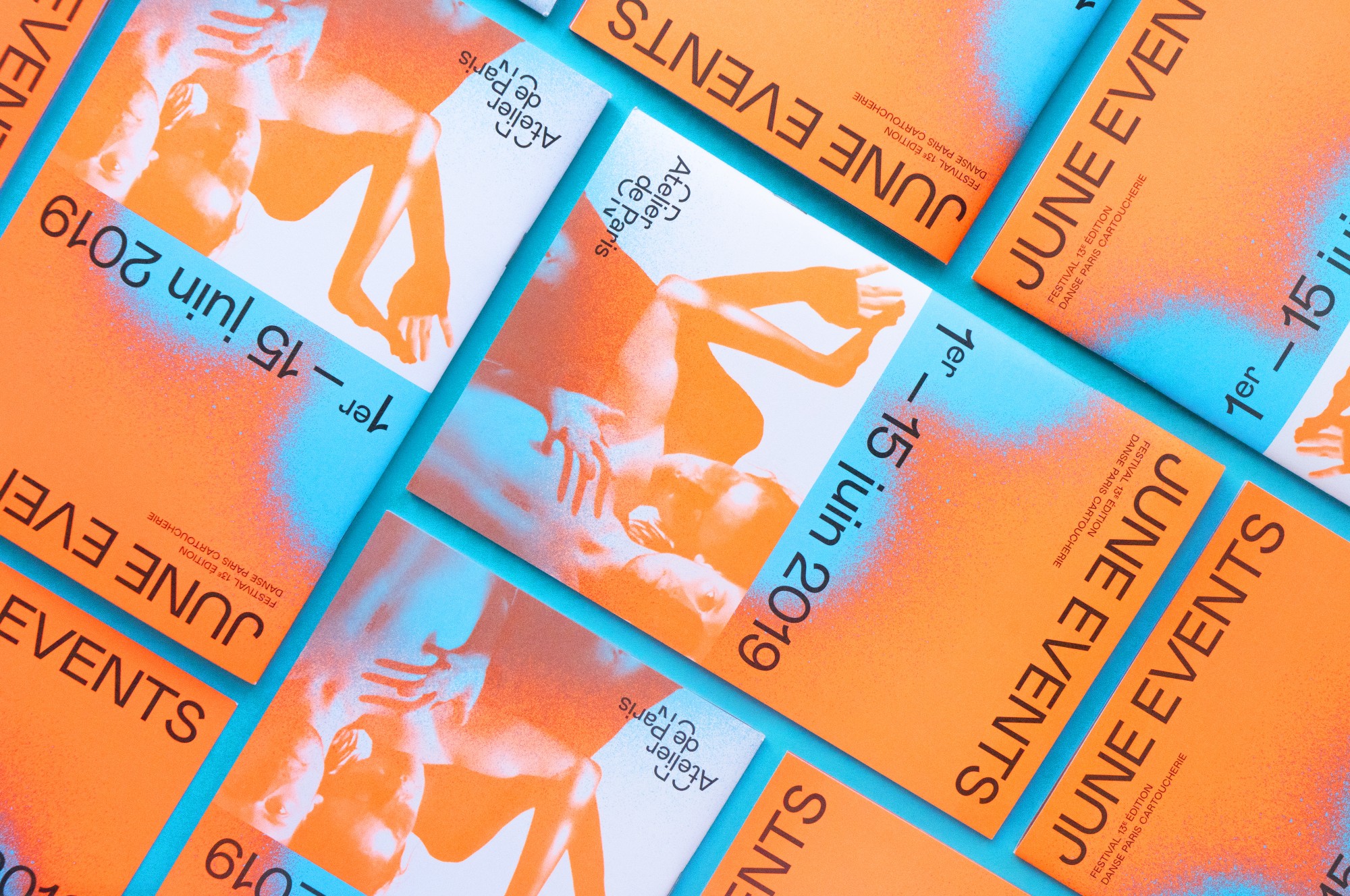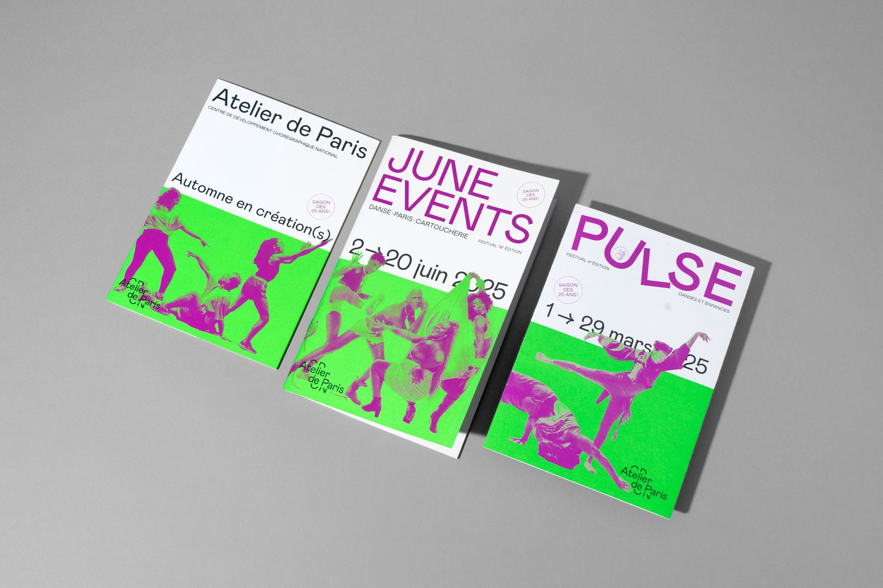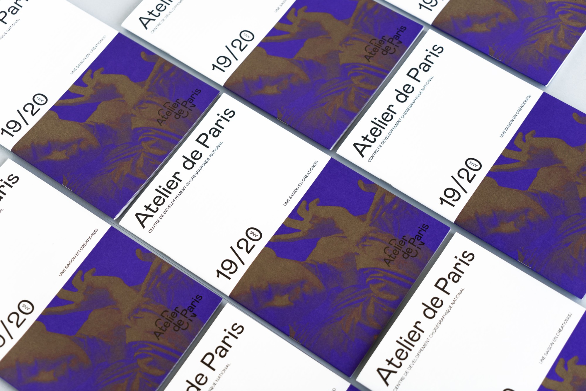 Depuis 2018 l’identité d’Atelier de Paris CDCN chemine d’une saison à l’autre au fil d’une large gamme de couleurs vives.