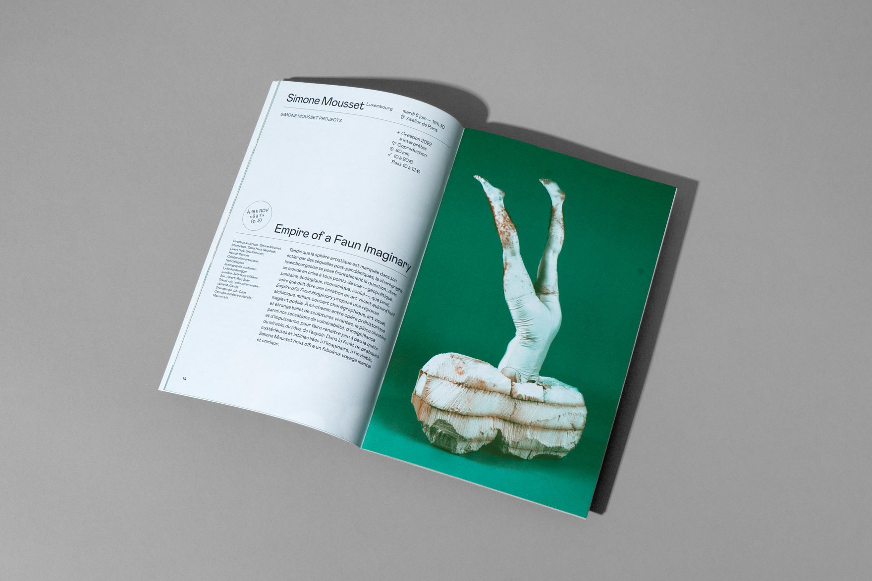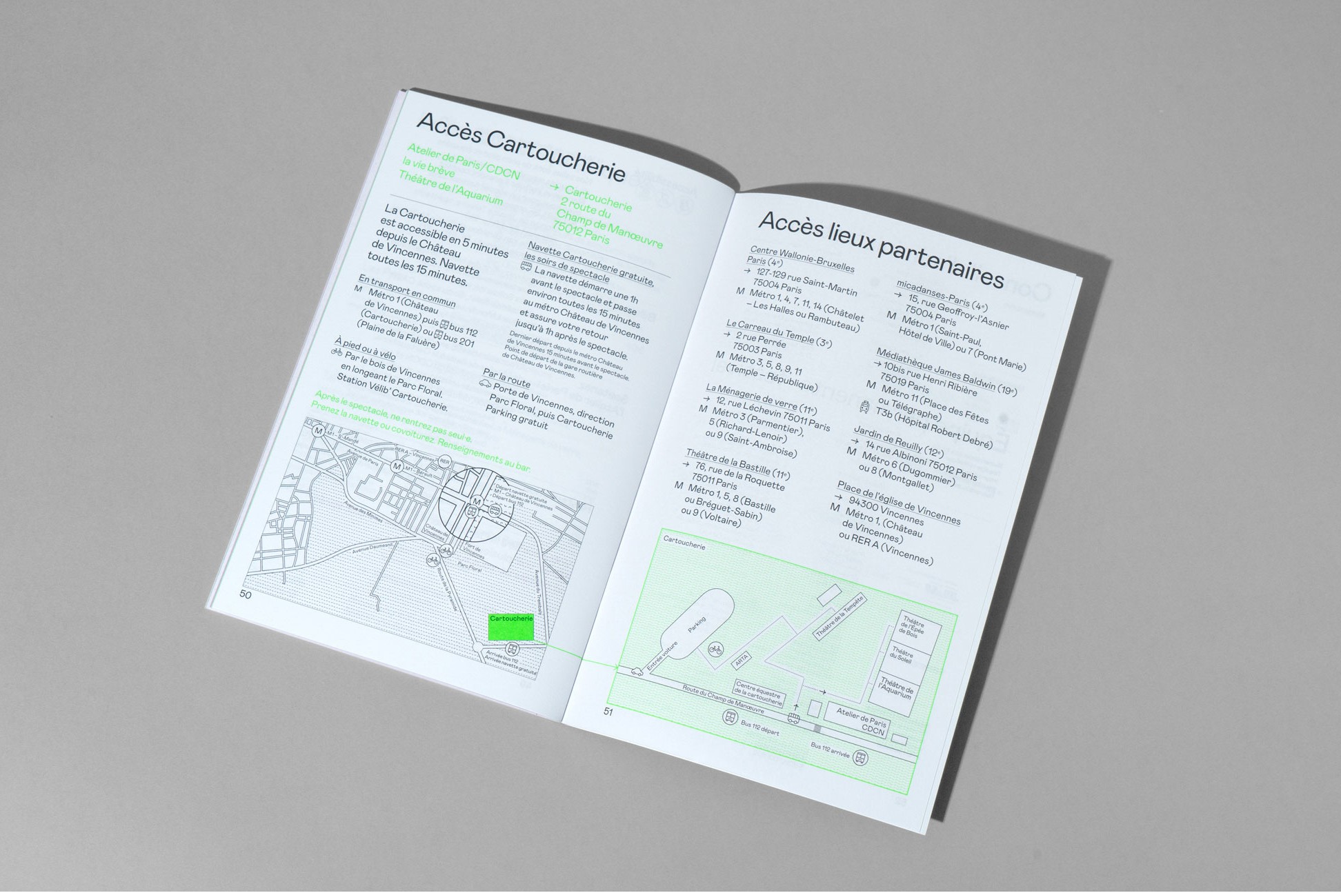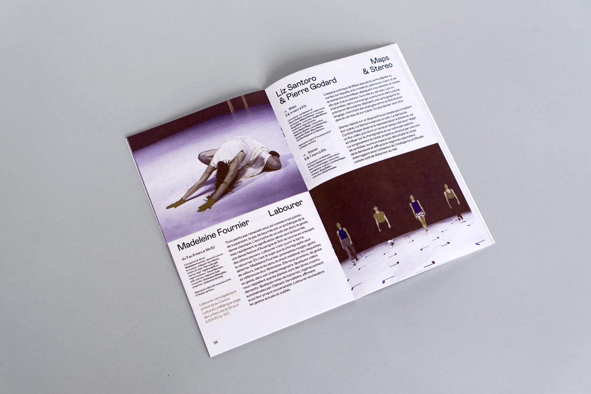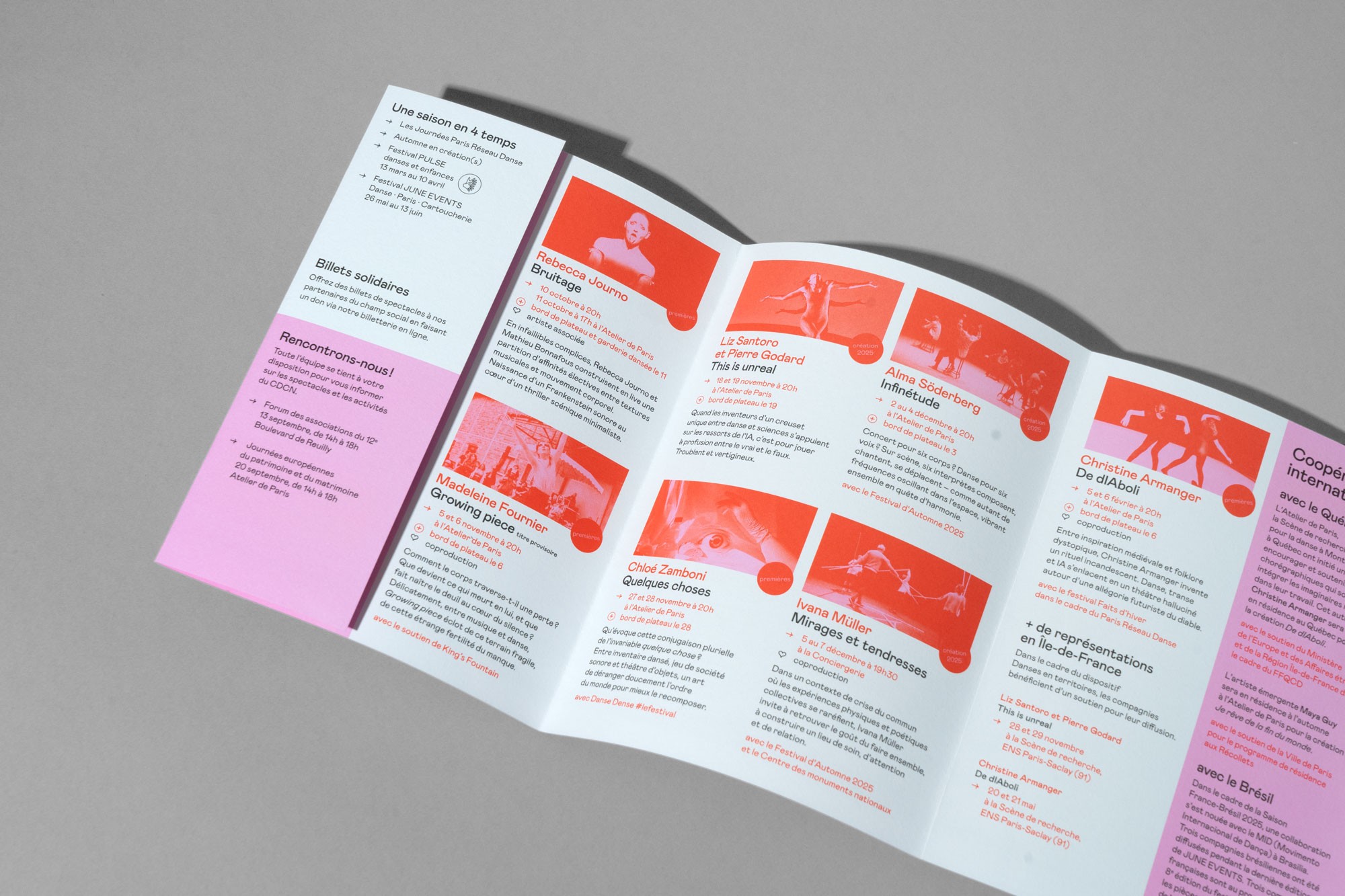 Les grands principes de la mise en page sont réemployés rigoureusement pour chaque nouvelle brochure dans un soucis de cohérence, de lisibilité et d’efficacité, permettant au public de conserver ses repères dans l'identification et la lecture des documents. Des associations de couleurs fortes et vibrantes réinventées à chaque nouvelle édition bousculent cette identité rigoureuse et pensée pour répondre à une économie de moyens et de temps dans l’élaboration des documents.