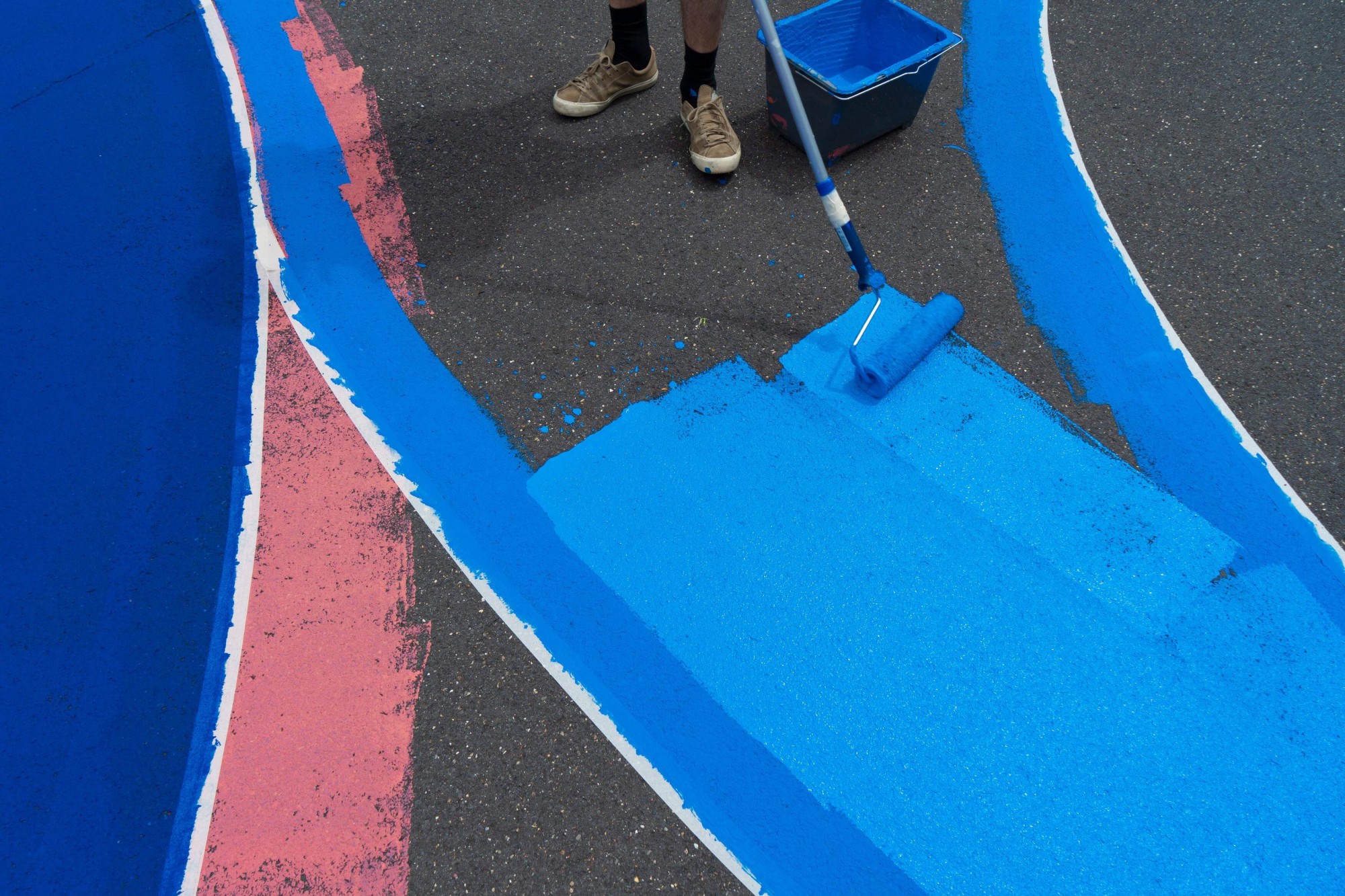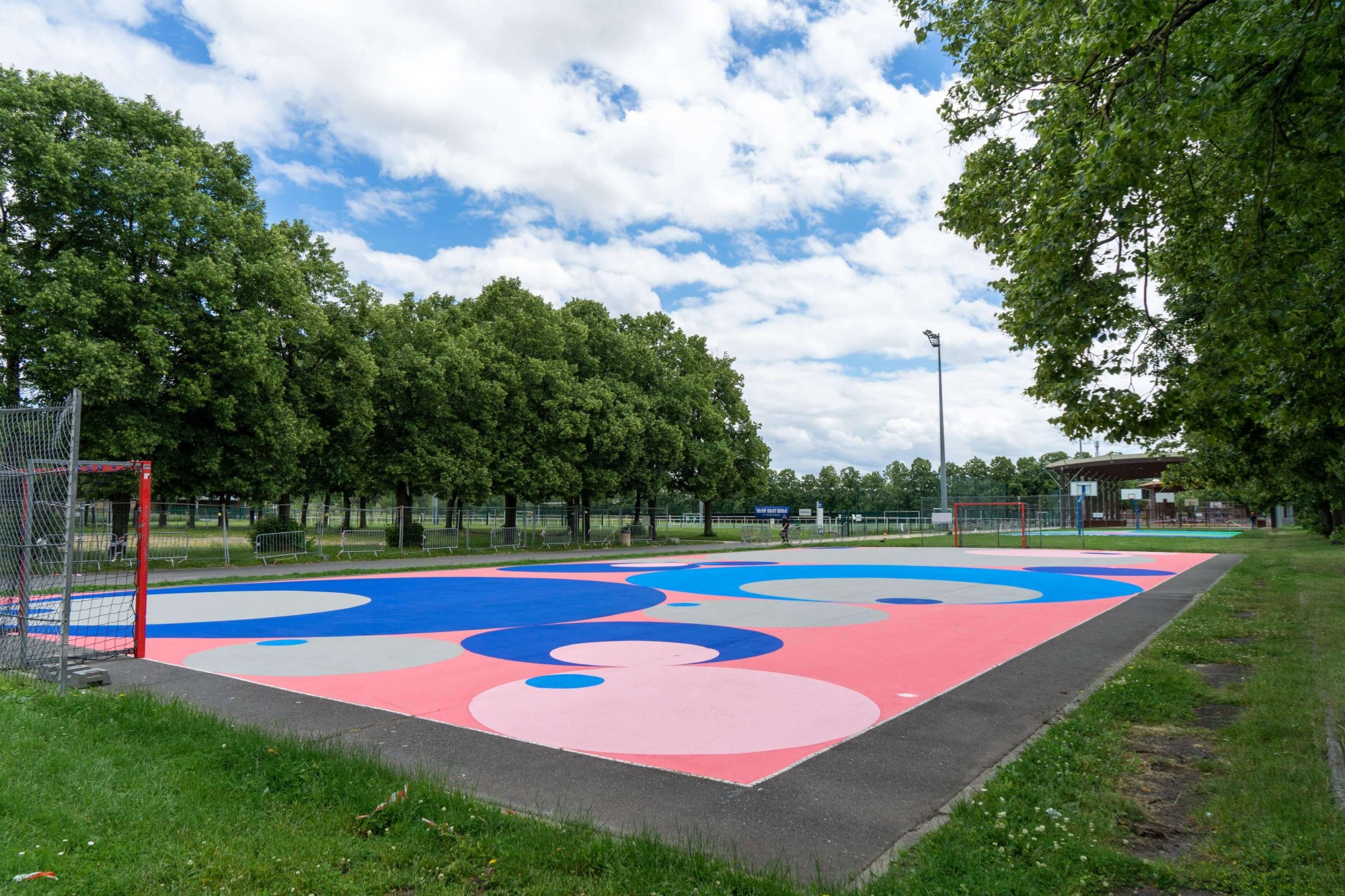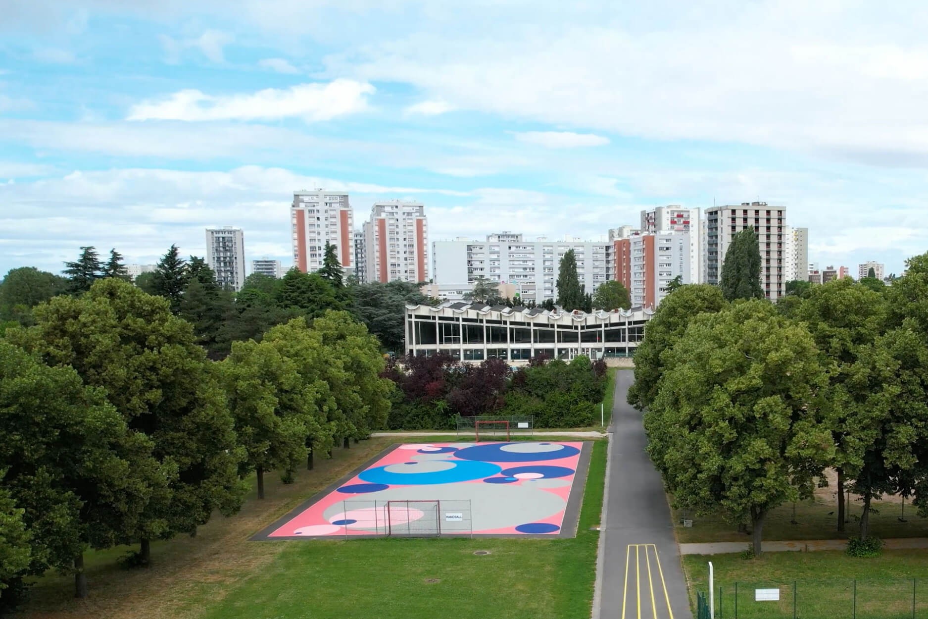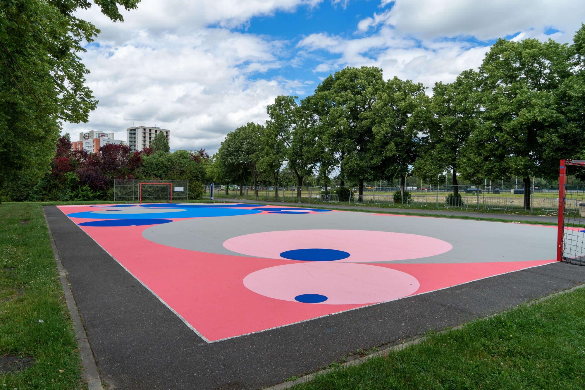 Le sport et l’Art ont le pouvoir de rassembler les gens, de créer des communautés et de favoriser le partage d’expériences. La notion de mouvement est le fil conducteur du parcours artistique commandé par la ville de la Courneuve et le département du 93. Ce dernier prend la forme d’une déambulation à travers la Ville. Dans le cadre de ce parcours, Atelier Baudelaire a été invité à proposer une œuvre monumentale à l’échelle d’un terrain de handball. Situé entre La Courneuve et Saint-Denis, ce terrain fait partie d’un vaste complexe sportif désigné site d’entraînement des Jeux Olympiques et Paralympiques de Paris 2024.