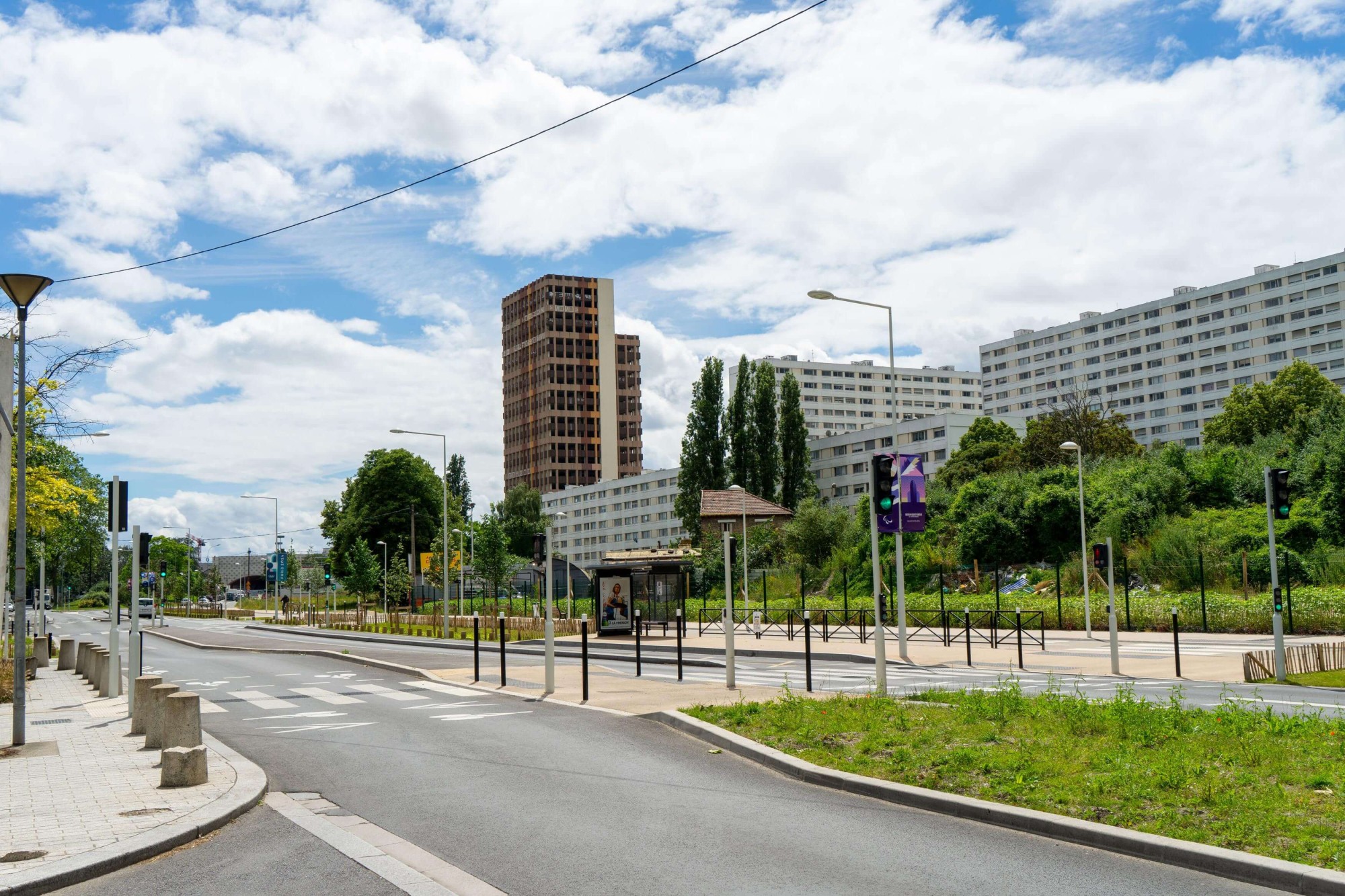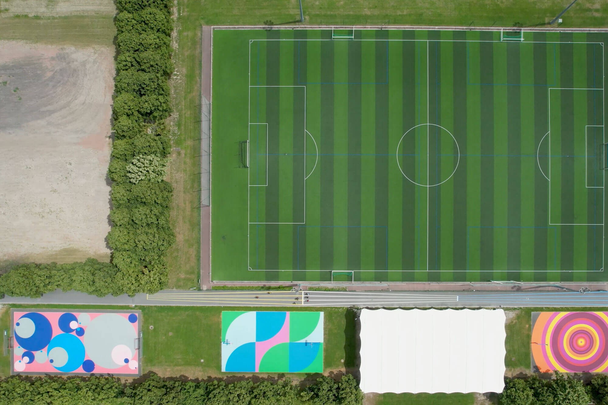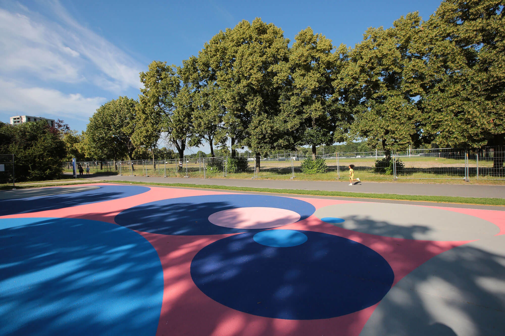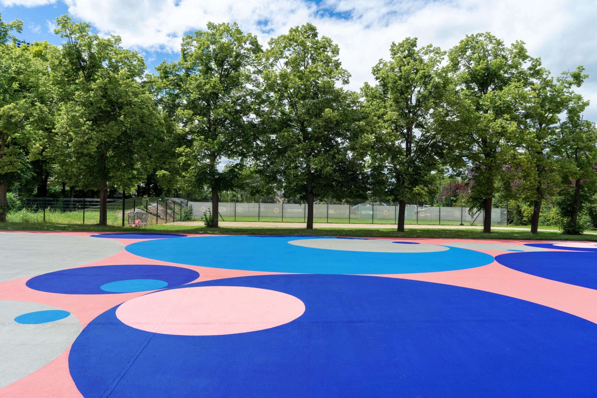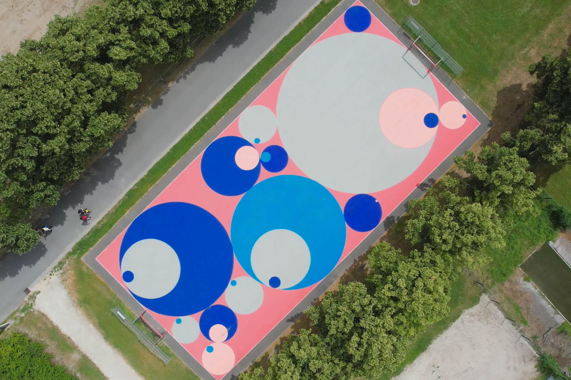 Le sport et l’Art ont le pouvoir de rassembler les gens, de créer des communautés et de favoriser le partage d’expériences. La notion de mouvement est le fil conducteur du parcours artistique commandé par la ville de la Courneuve et le département du 93. Ce dernier prend la forme d’une déambulation à travers la Ville. Dans le cadre de ce parcours, Atelier Baudelaire a été invité à proposer une œuvre monumentale à l’échelle d’un terrain de handball. Situé entre La Courneuve et Saint-Denis, ce terrain fait partie d’un vaste complexe sportif désigné site d’entraînement des Jeux Olympiques et Paralympiques de Paris 2024.