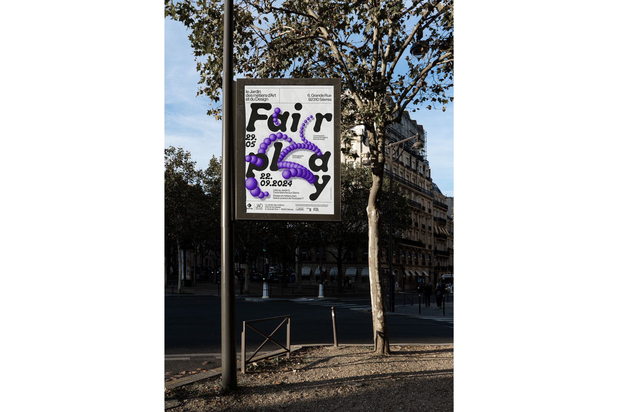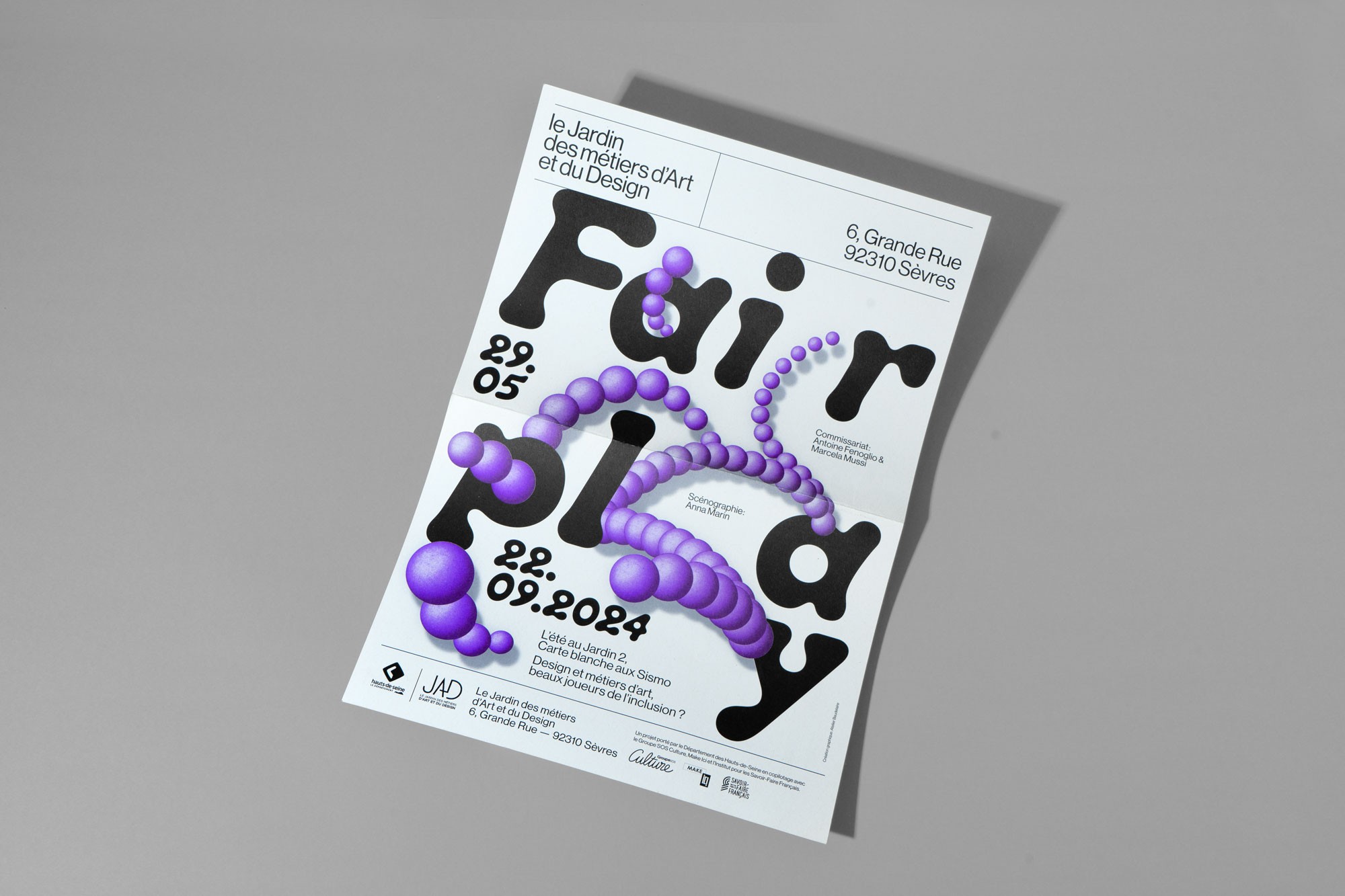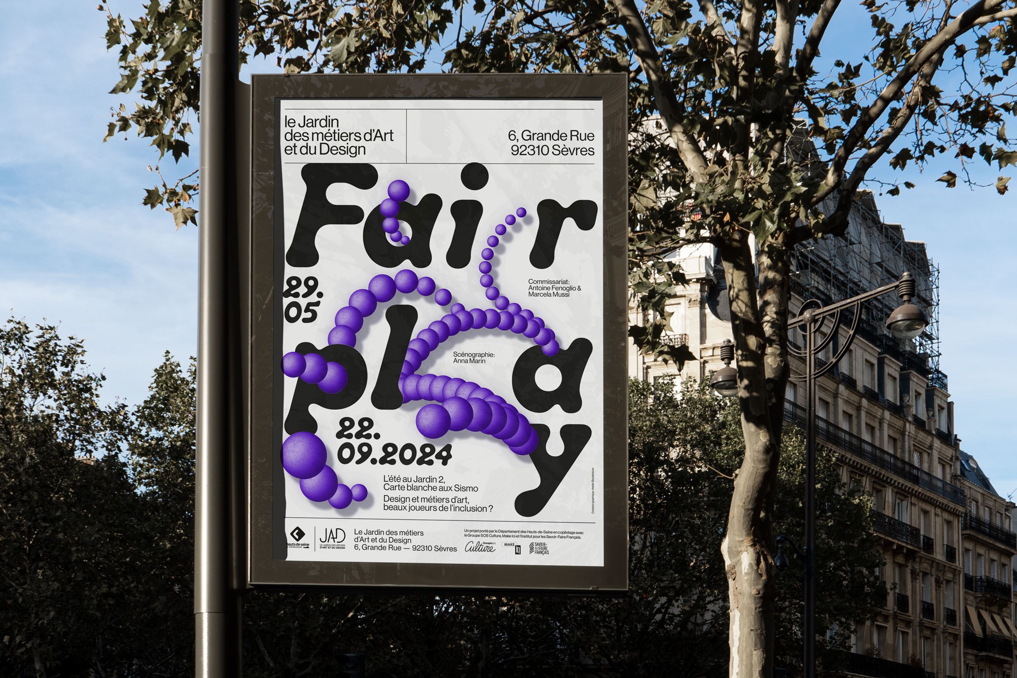 Dans le cadre de la deuxième édition de « L'été au Jardin », le JAD offre une carte blanche au collectif les Sismo et présente l'exposition « Fairplay, métiers d'art et design, beaux joueurs de l'inclusion ? » De mai à septembre 2024. Celle-ci se fait écho à l'actualité sportive de l'été, en proposant une réflexion approfondie sur les valeurs des Jeux Paralympiques : courage, détermination, inspiration et égalité. L’exposition s’interroge et interroge le public sur la manière dont les métiers de la conception et de la création contribuent à une société plus inclusive et respectueuse des singularités. Atelier Baudelaire conçoit l’affiche de l’exposition autour de l’idée de rebond, pour évoquer le jeu et le sport, mais aussi comme symbole de la résilience.