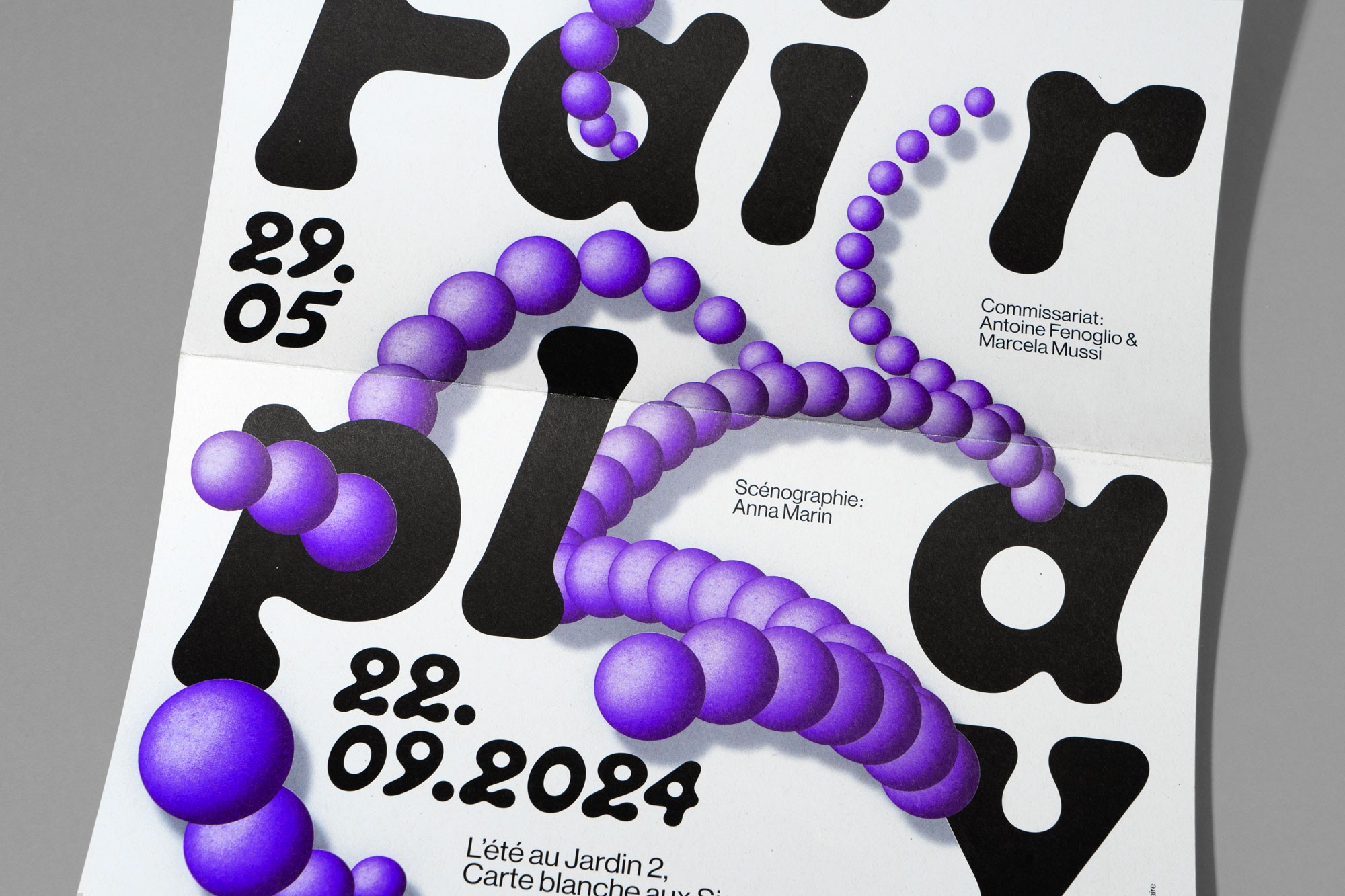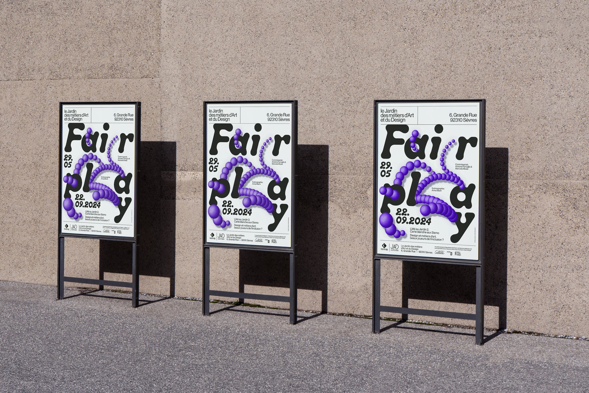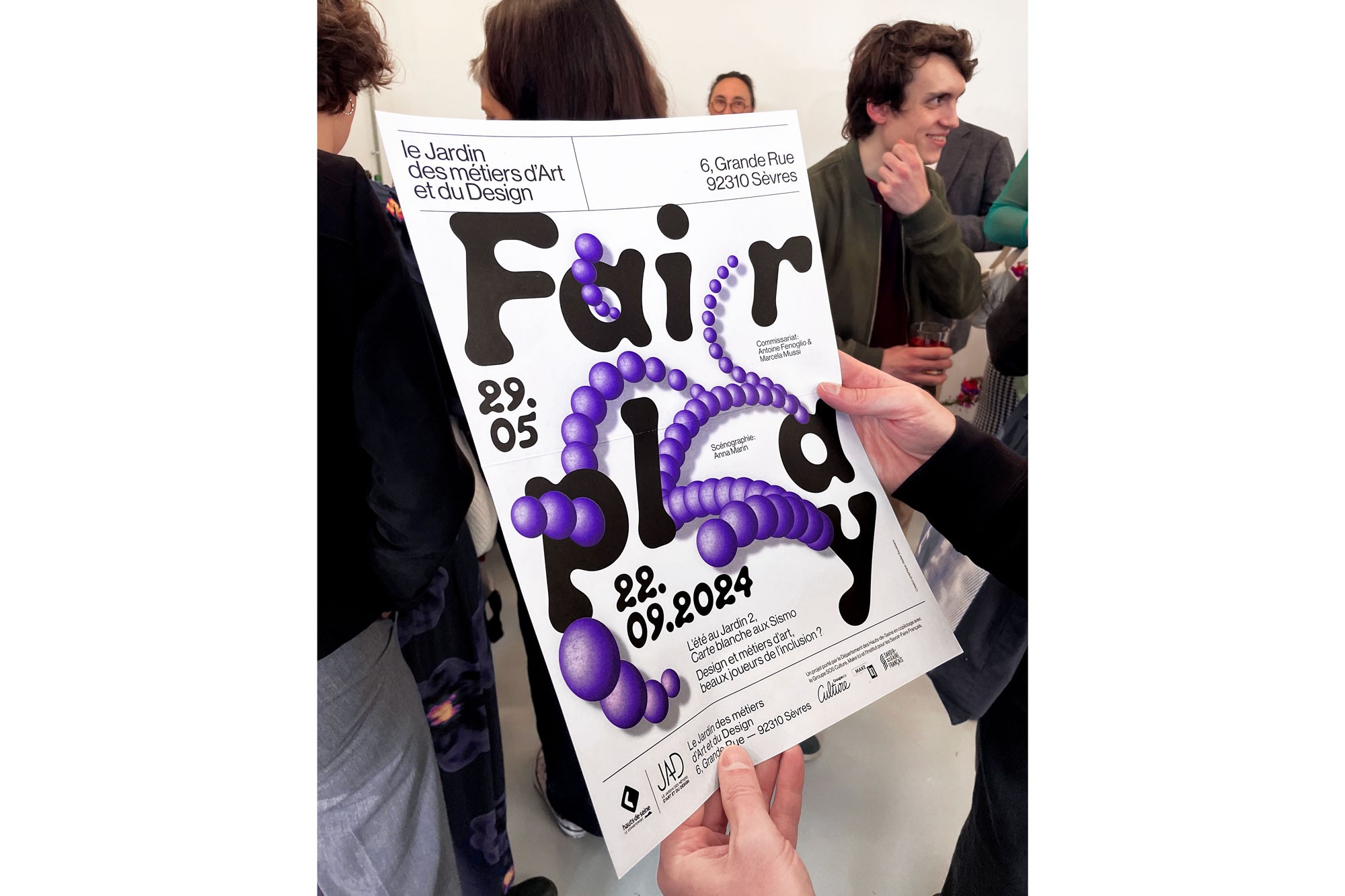 Dans le cadre de la deuxième édition de « L'été au Jardin », le JAD offre une carte blanche au collectif les Sismo et présente l'exposition « Fairplay, métiers d'art et design, beaux joueurs de l'inclusion ? » De mai à septembre 2024. Celle-ci se fait écho à l'actualité sportive de l'été, en proposant une réflexion approfondie sur les valeurs des Jeux Paralympiques : courage, détermination, inspiration et égalité. L’exposition s’interroge et interroge le public sur la manière dont les métiers de la conception et de la création contribuent à une société plus inclusive et respectueuse des singularités. Atelier Baudelaire conçoit l’affiche de l’exposition autour de l’idée de rebond, pour évoquer le jeu et le sport, mais aussi comme symbole de la résilience.