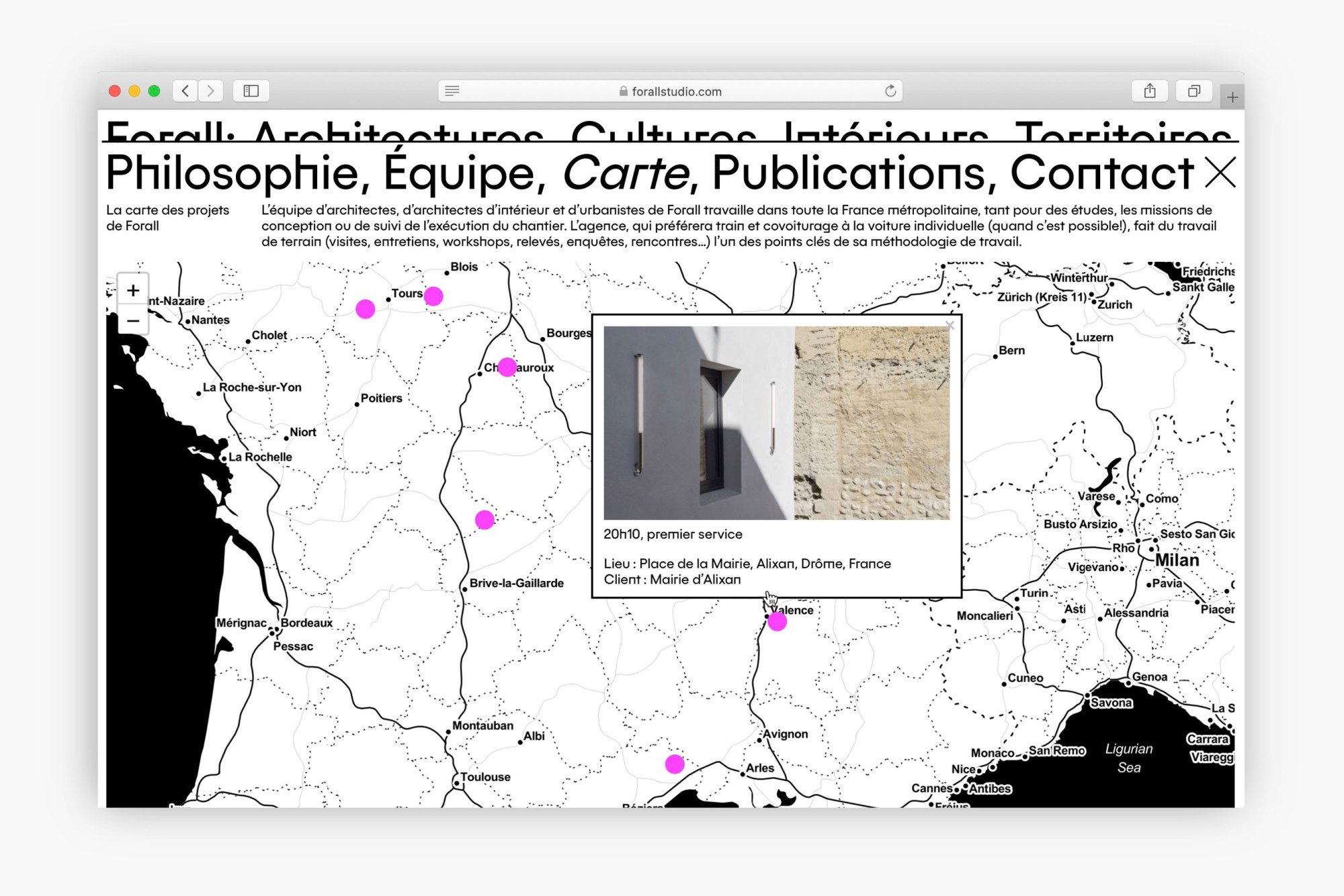 L'Atelier Baudelaire accompagne Forall Studio, agence d’architecture, d’architecture d’intérieur et d’urbanisme, depuis ses débuts. Nous avons conçu pour eux un site mettant en valeur l'aspect pluridisciplinaire de l'agence et leur réflexion, qui s'exprime souvent autant par le texte que l'image. Lauréat des AJAP20, ce studio d'architecture met la réponse à la crise climatique au cœur de ses projets quelle qu’en soit l’échelle. Les sujets sont abordés par le prisme de la ressource – durable et locale, de son utilisation raisonnée, de la culture constructive qui lui est associée, du tissu économique qu’elle fédère, du territoire qu’elle fabrique. La lettre « A » retournée à 180° est un symbole mathématique signifiant « pour tout ». L’identité visuelle joue sur la mobilité et l’hybridité de cette lettre qui devient à la fois signe et signature.