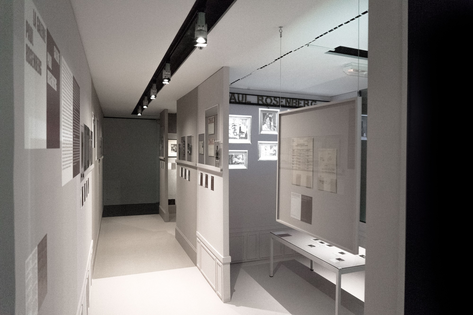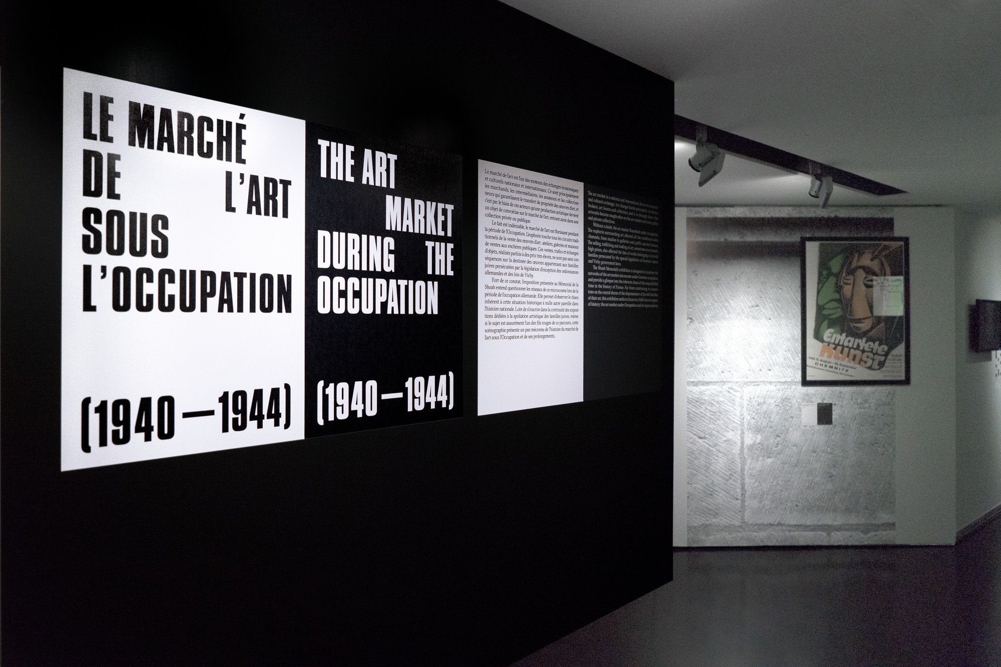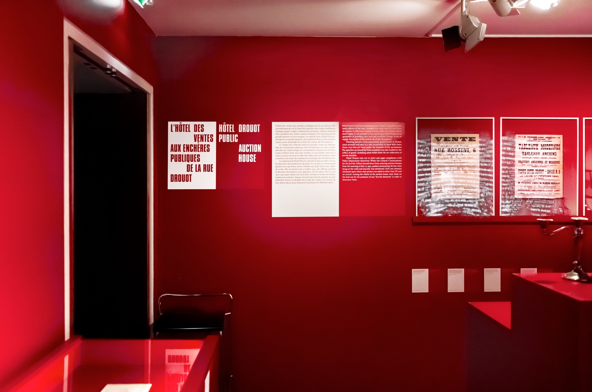 En contrepoint de cette écriture visuelle très directe, le code couleur signalétique se fond dans l'ambiance tamisée des décors, dans la continuité du projet scénographique. Riche d'une grande diversité de documents, l'exposition retrace l'histoire des galeristes et biens juifs spoliés ou aryanisés sous l'occupation, à travers une très large sélection d'objets d'œuvres et de documents. La scénographie oscille entre reconstitution de décors d'époque modernisés, et muséographie plus traditionnelle autour d'archives diverses.