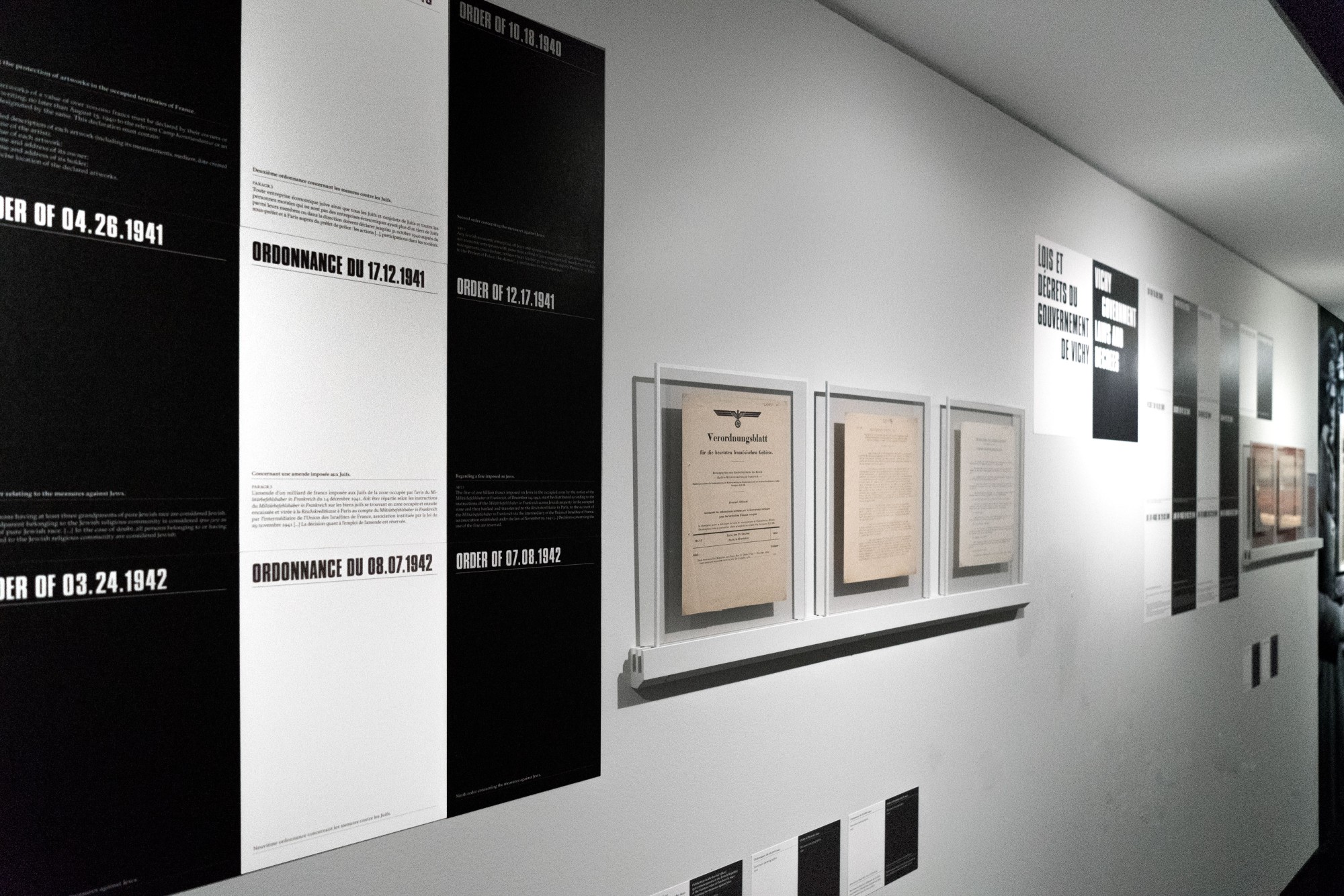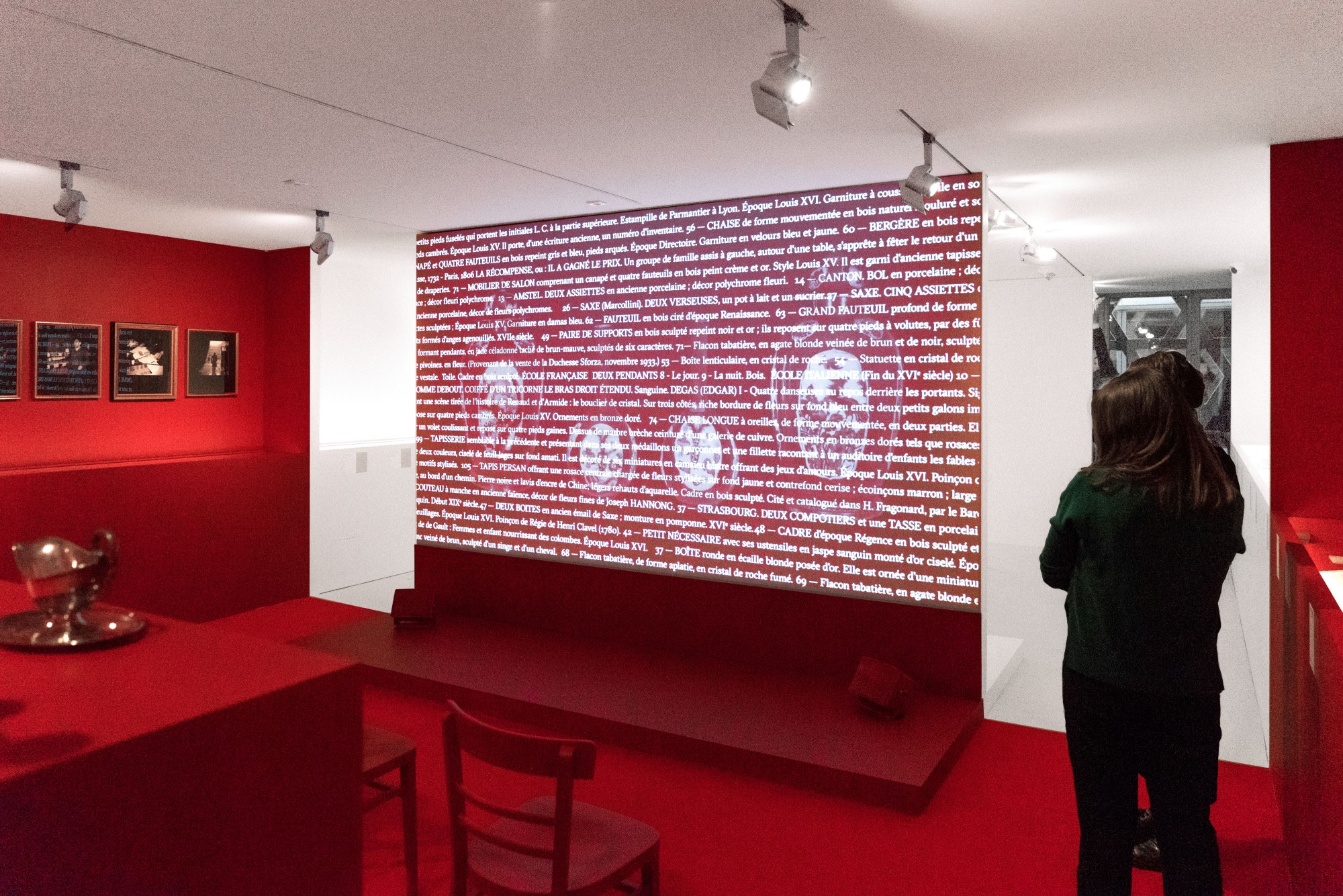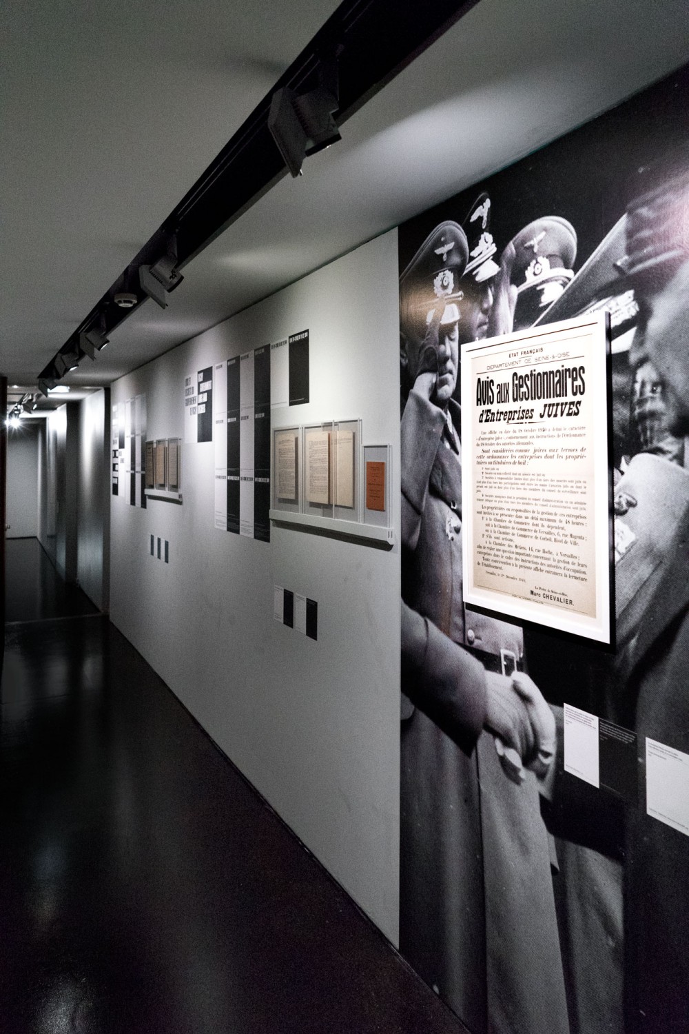 En contrepoint de cette écriture visuelle très directe, le code couleur signalétique se fond dans l'ambiance tamisée des décors, dans la continuité du projet scénographique. Riche d'une grande diversité de documents, l'exposition retrace l'histoire des galeristes et biens juifs spoliés ou aryanisés sous l'occupation, à travers une très large sélection d'objets d'œuvres et de documents. La scénographie oscille entre reconstitution de décors d'époque modernisés, et muséographie plus traditionnelle autour d'archives diverses.