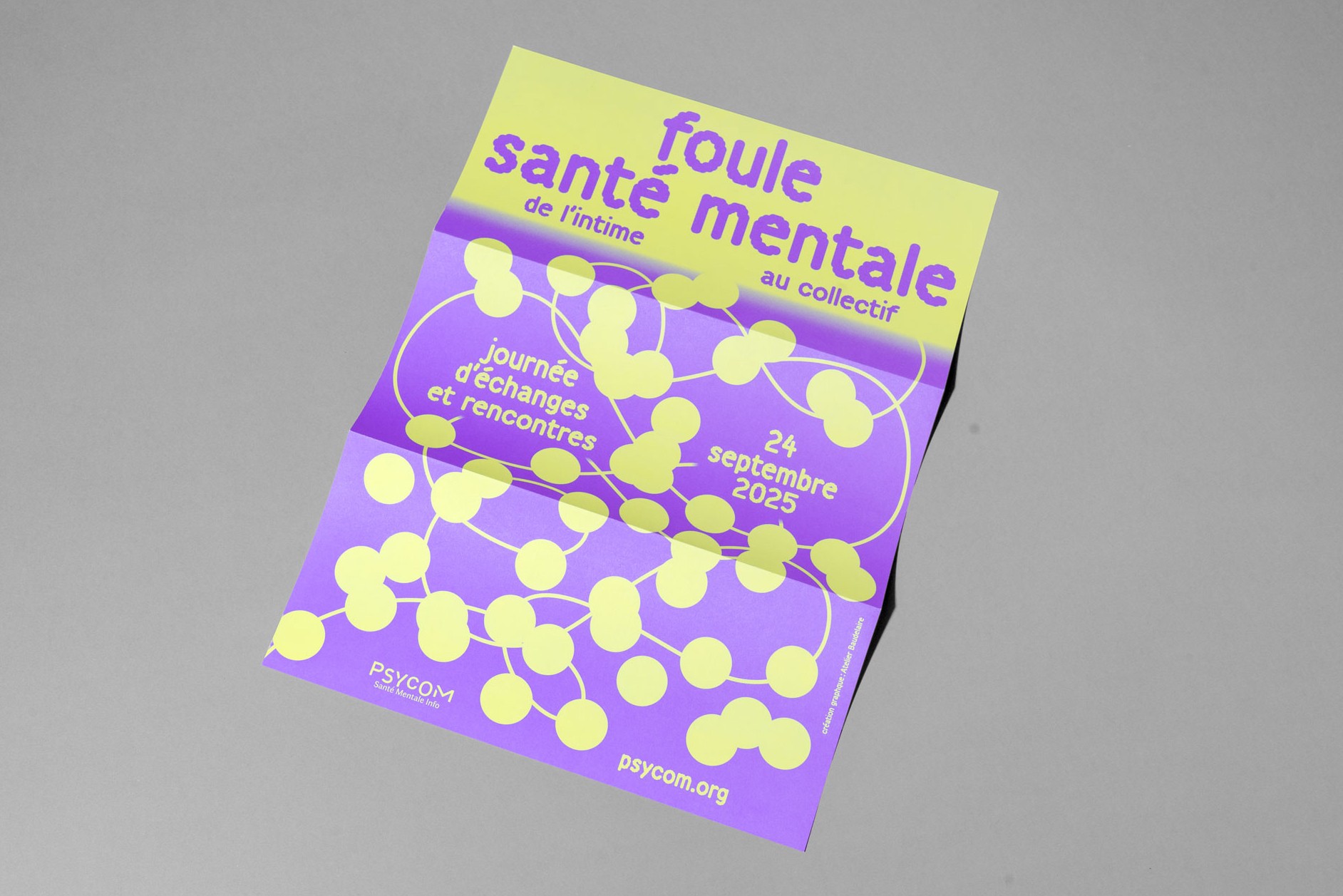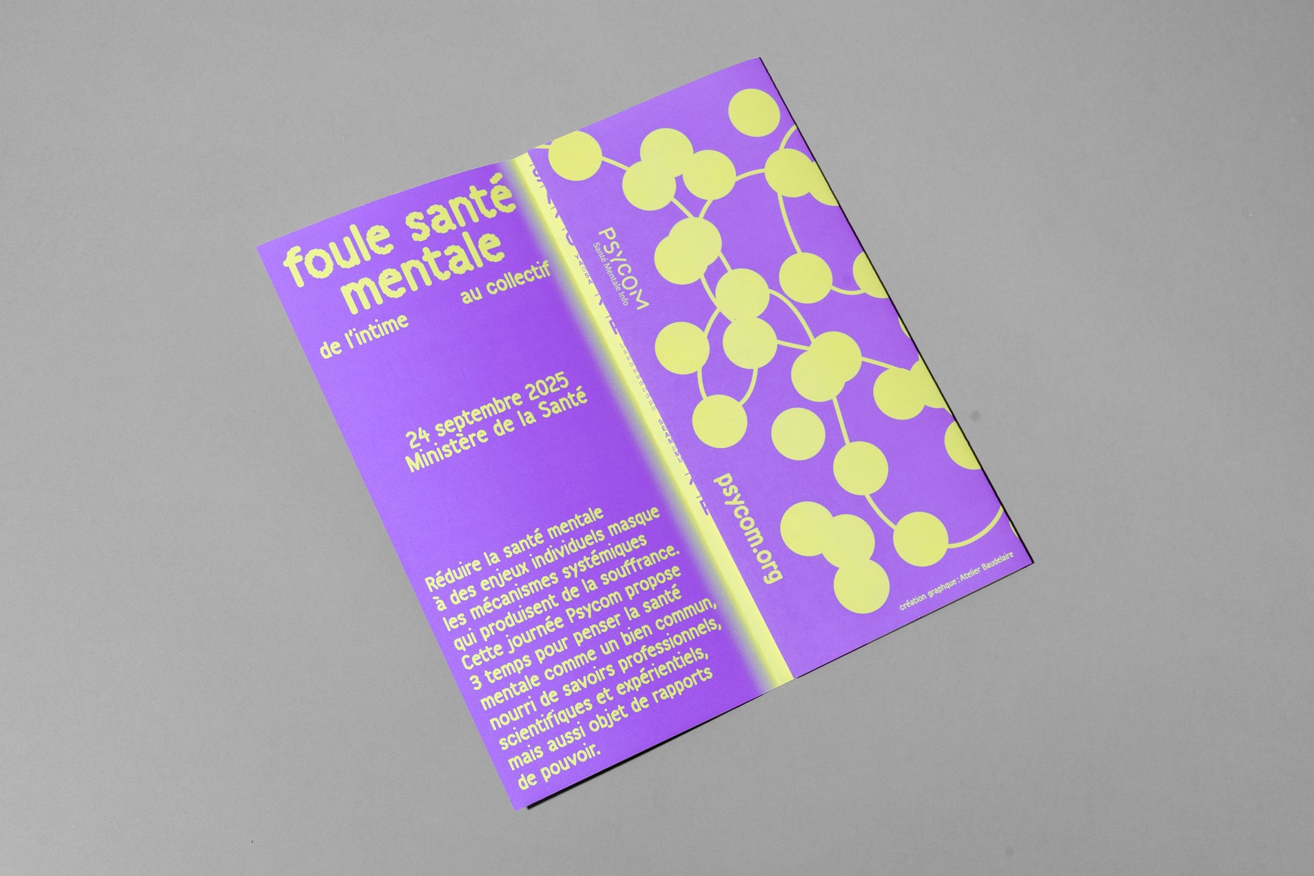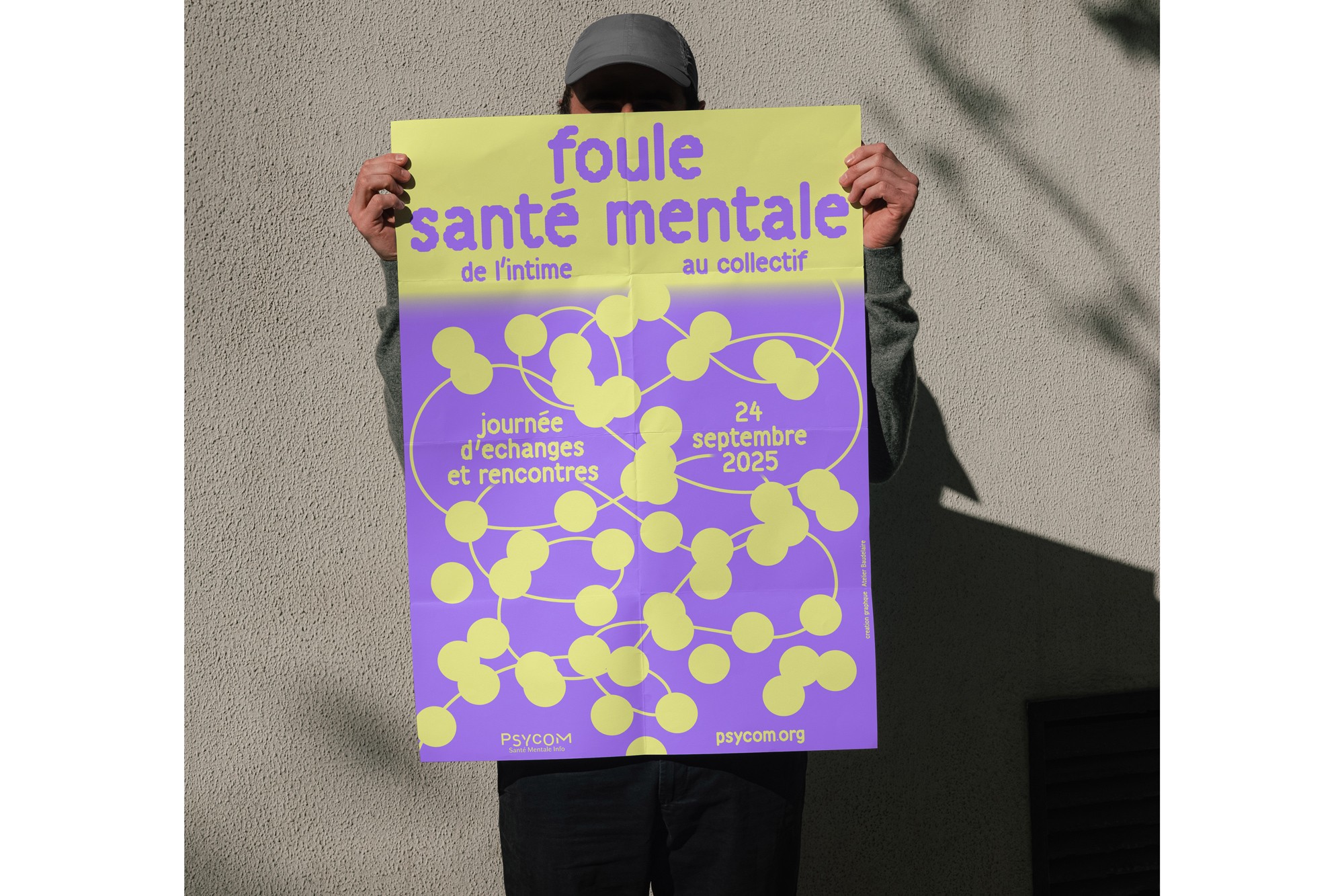 Pour promouvoir la journée d’échanges et de rencontres de l’organisme public Psycom au Ministère de la santé, nous avons travaillé une identité visuelle qui évoque subtilement la santé mentale, grâce à la métaphore du fil : parfois tendu, parfois relâché, mais toujours présent. Le fil illustre l’idée que notre équilibre mental est quelque chose de fragile, qui peut se tendre, se casser, ou se renouer… Dans un monde où la perte de repères, l'accélération de la vie numérique et la polarisation des opinions empêchent souvent de penser la complexité et de faire face aux incertitudes, Psycom informe, oriente et sensibilise afin d’aider les personnes à agir en faveur de leur santé mentale et de celle des autres.
