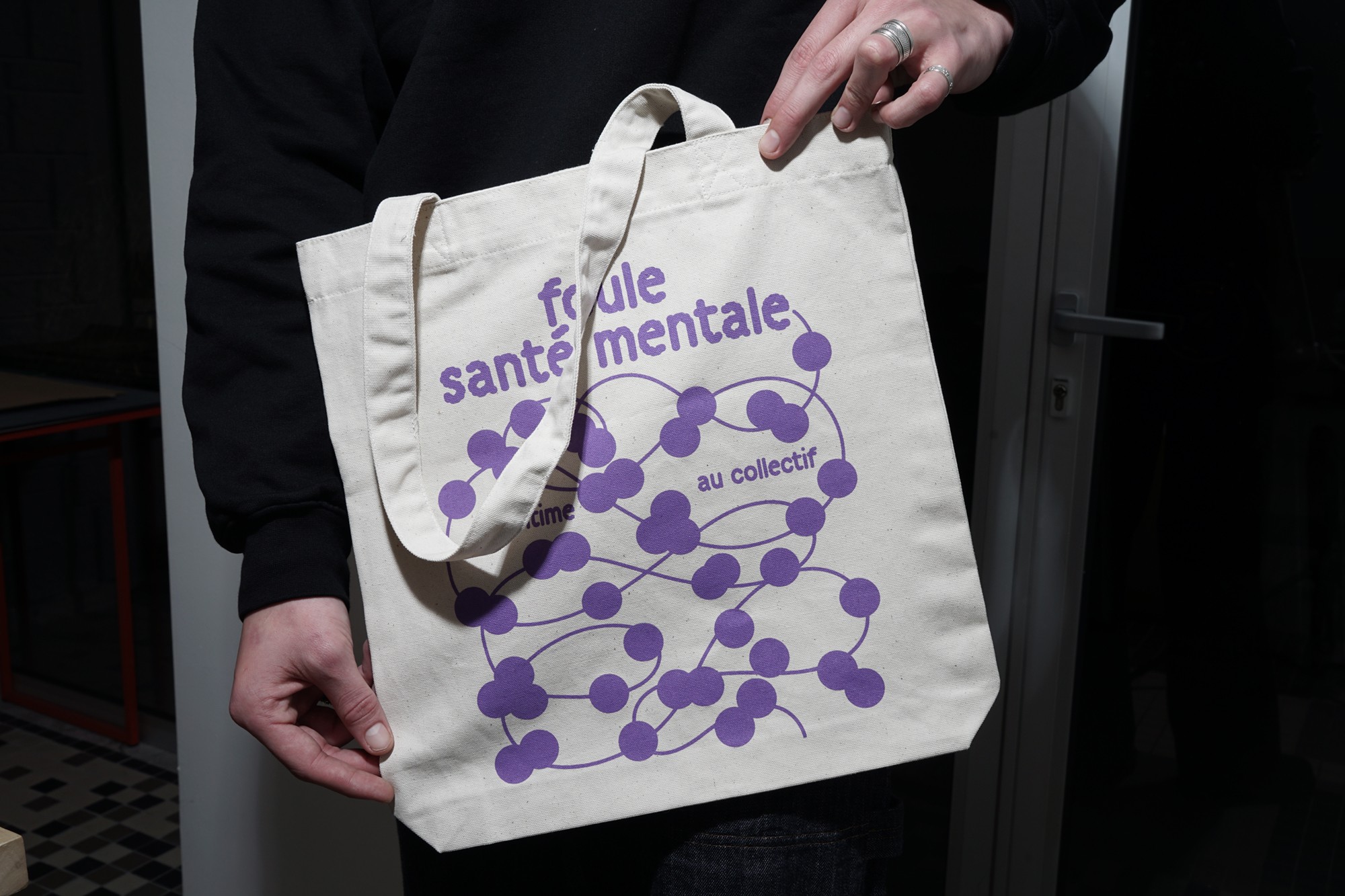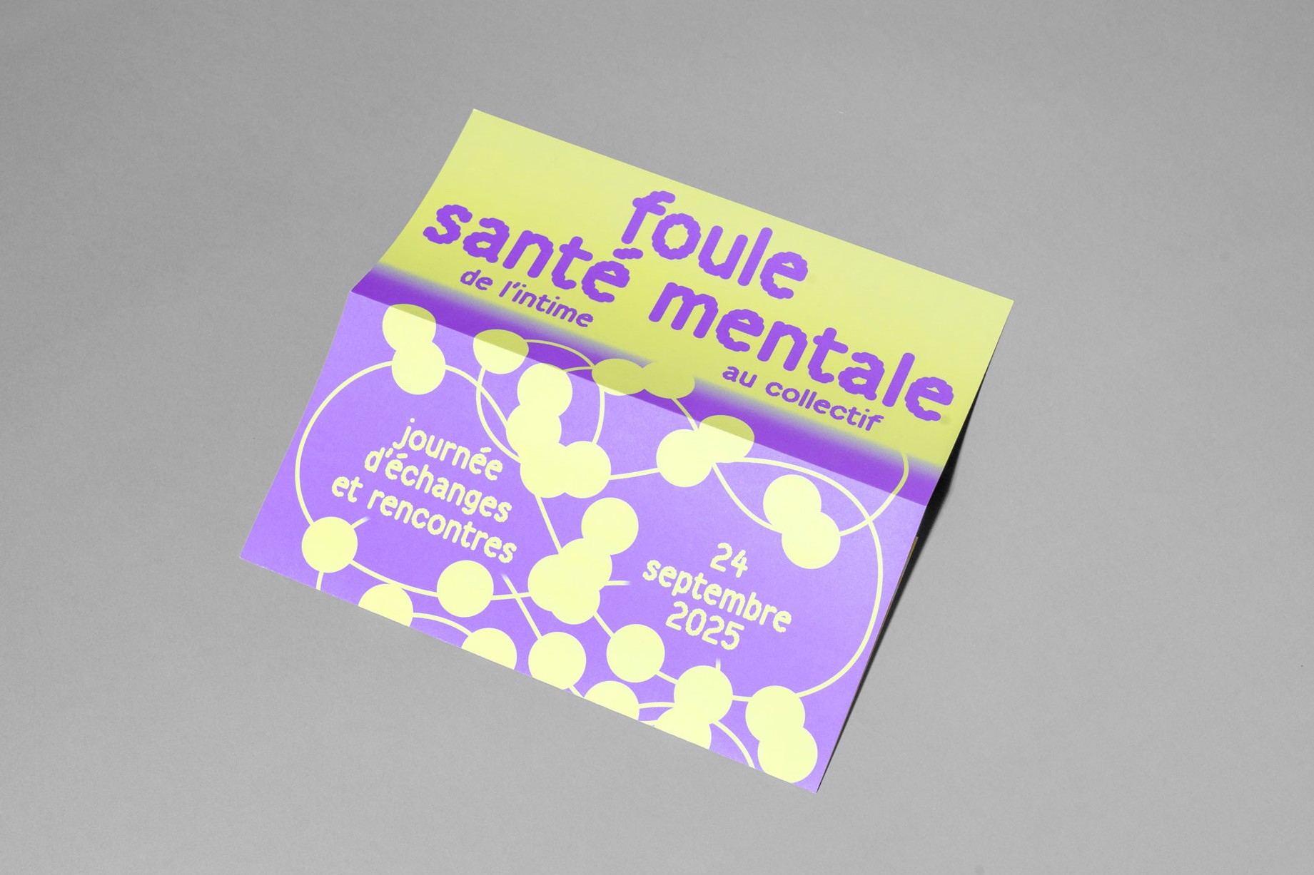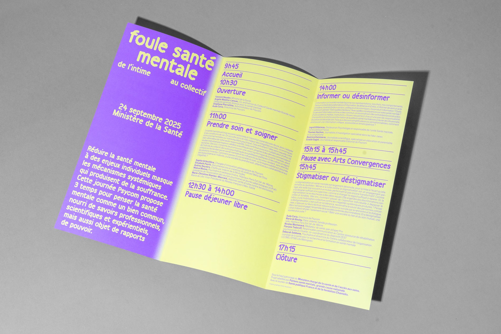 Pour promouvoir la journée d’échanges et de rencontres de l’organisme public Psycom au Ministère de la santé, nous avons travaillé une identité visuelle qui évoque subtilement la santé mentale, grâce à la métaphore du fil : parfois tendu, parfois relâché, mais toujours présent. Le fil illustre l’idée que notre équilibre mental est quelque chose de fragile, qui peut se tendre, se casser, ou se renouer… Dans un monde où la perte de repères, l'accélération de la vie numérique et la polarisation des opinions empêchent souvent de penser la complexité et de faire face aux incertitudes, Psycom informe, oriente et sensibilise afin d’aider les personnes à agir en faveur de leur santé mentale et de celle des autres.