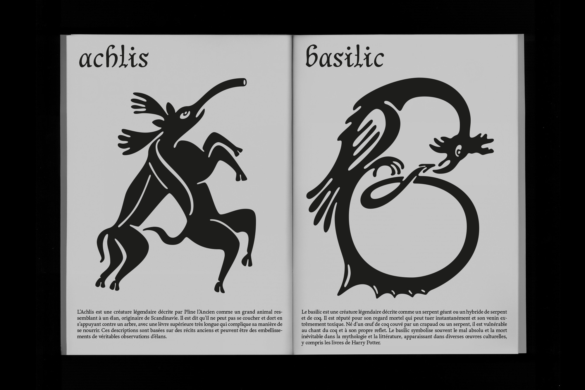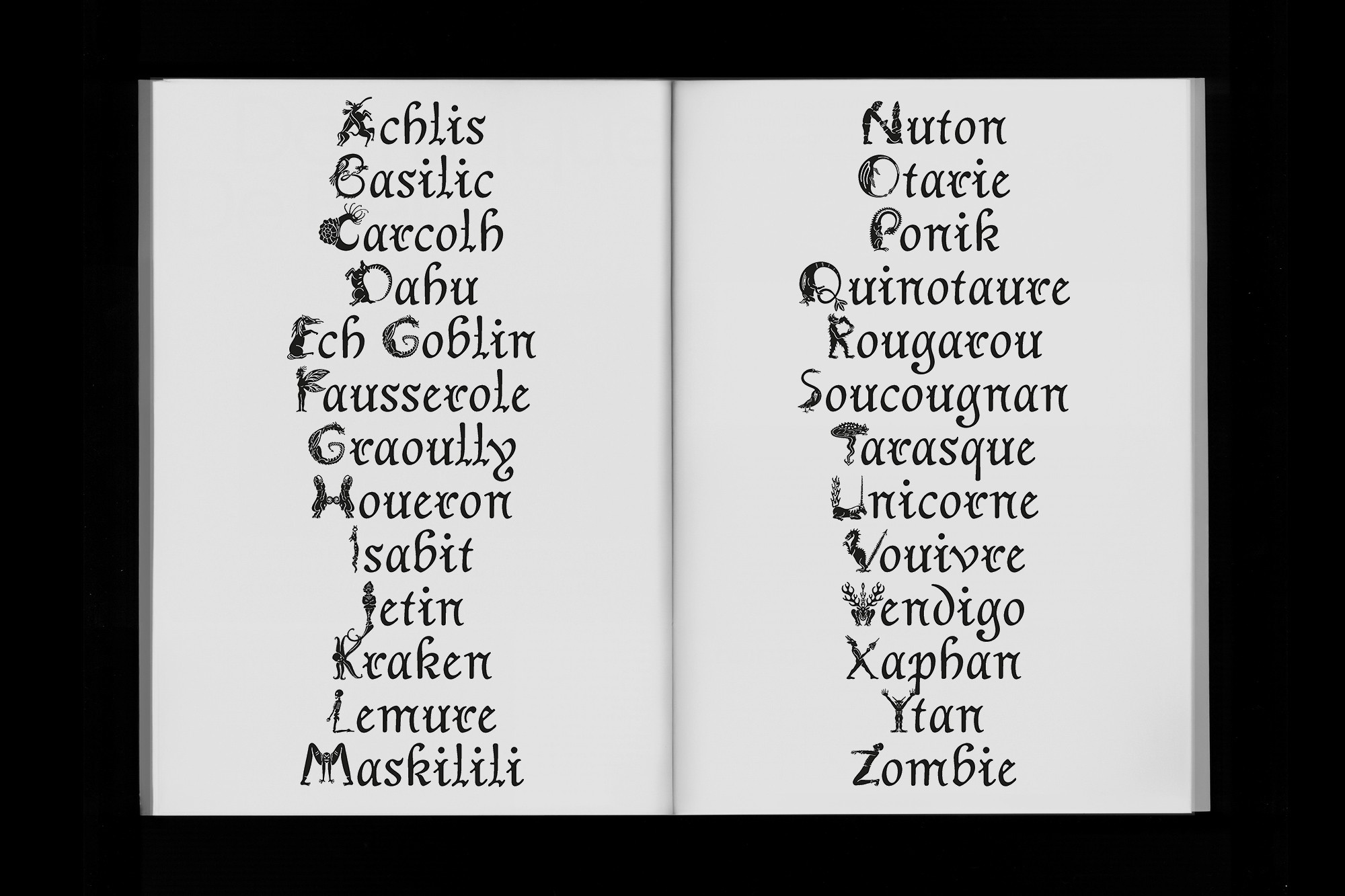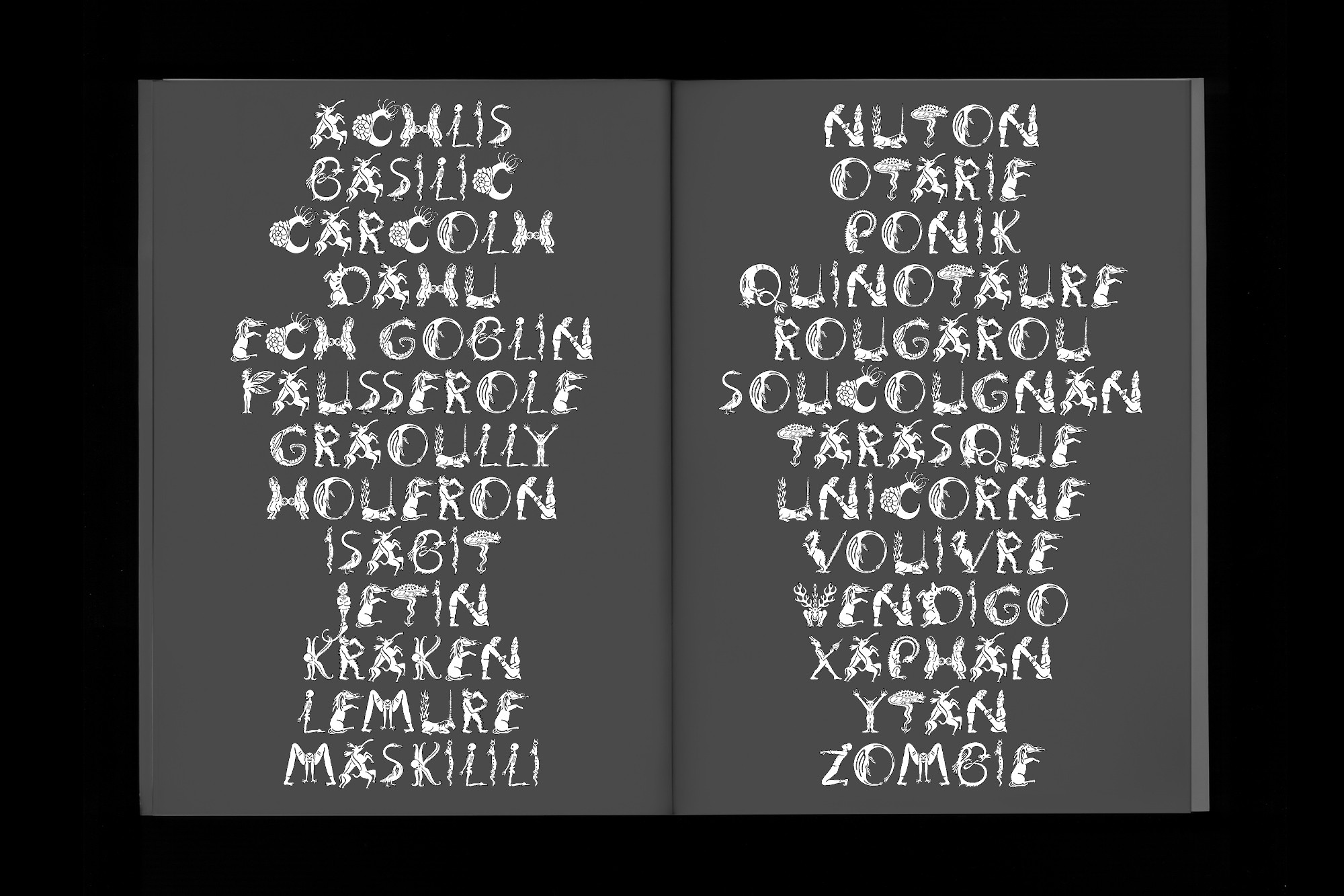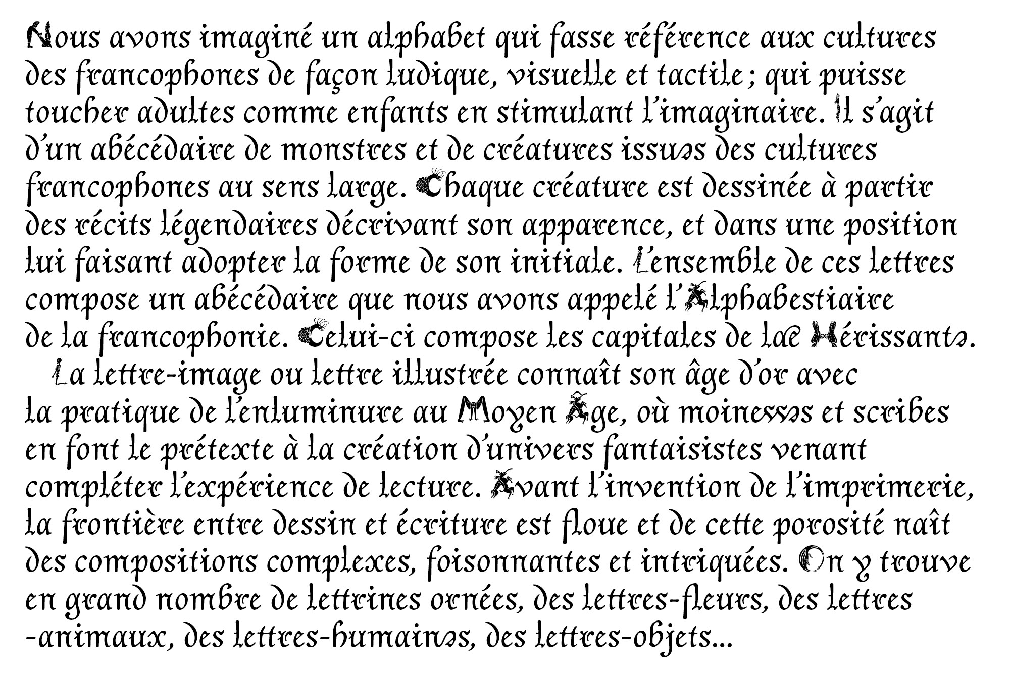 Dans le cadre de l’ouverture de la Cité internationale de la langue française au château de Villers-Cotterêts, le Centre des monuments nationaux, l’Imprimerie nationale et le Centre national des arts plastiques se sont associés pour mettre en œuvre une résidence artistique dédiée à la création, la recherche ou l’expérimentation autour de la thématique « Typographier la francophonie ou la francophonie typographiée ». Notre projet a été retenu et est en cours d’élaboration ! Nous avons imaginé un alphabet qui puisse faire référence à la culture de la langue française de façon ludique, visuelle et tactile, qui puisse toucher adultes comme enfants en stimulant l’imaginaire. Il s’agit d’un abécédaire de monstres et créatures issus de la culture francophone au sens large. Chaque monstre est dessiné dans la forme de son initiale, inspiré des différents récits décrivant son apparence visuelle. L’ensemble de ces lettres compose un abécédaire que nous avons appelé l'Alphabestiaire de la francophonie.