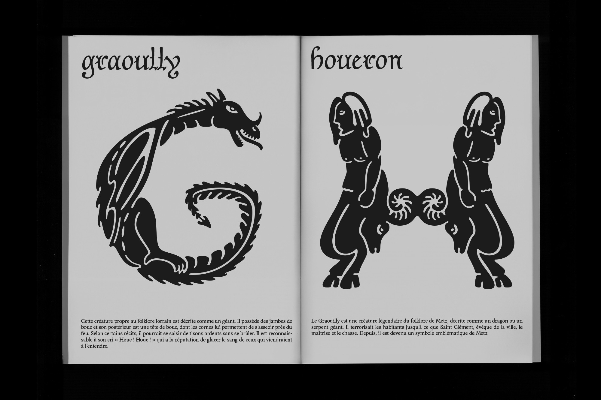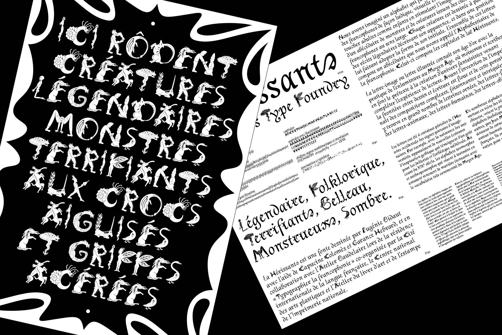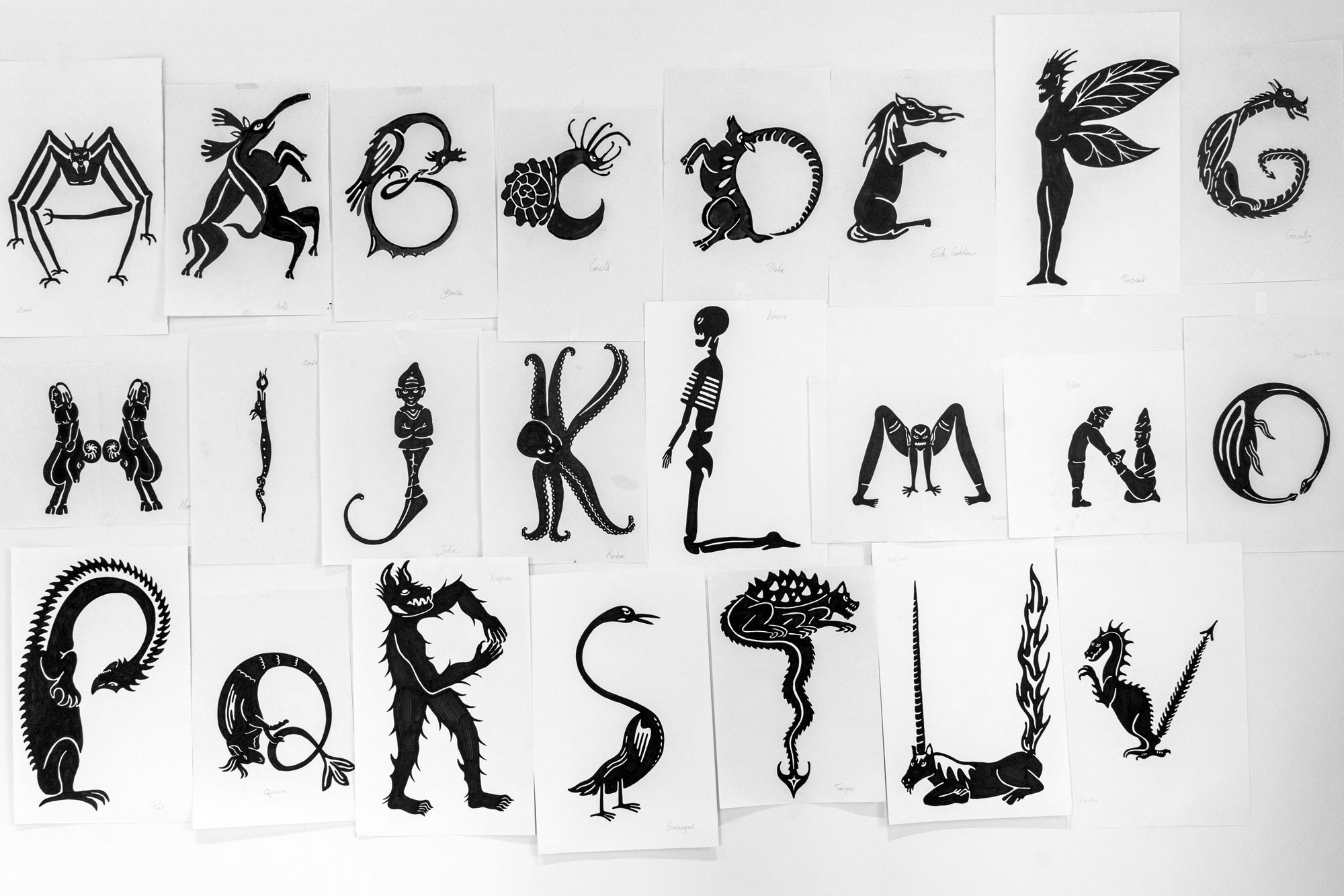 Dans le cadre de l’ouverture de la Cité internationale de la langue française au château de Villers-Cotterêts, le Centre des monuments nationaux, l’Imprimerie nationale et le Centre national des arts plastiques se sont associés pour mettre en œuvre une résidence artistique dédiée à la création, la recherche ou l’expérimentation autour de la thématique « Typographier la francophonie ou la francophonie typographiée ». Notre projet a été retenu et est en cours d’élaboration ! Nous avons imaginé un alphabet qui puisse faire référence à la culture de la langue française de façon ludique, visuelle et tactile, qui puisse toucher adultes comme enfants en stimulant l’imaginaire. Il s’agit d’un abécédaire de monstres et créatures issus de la culture francophone au sens large. Chaque monstre est dessiné dans la forme de son initiale, inspiré des différents récits décrivant son apparence visuelle. L’ensemble de ces lettres compose un abécédaire que nous avons appelé l'Alphabestiaire de la francophonie.