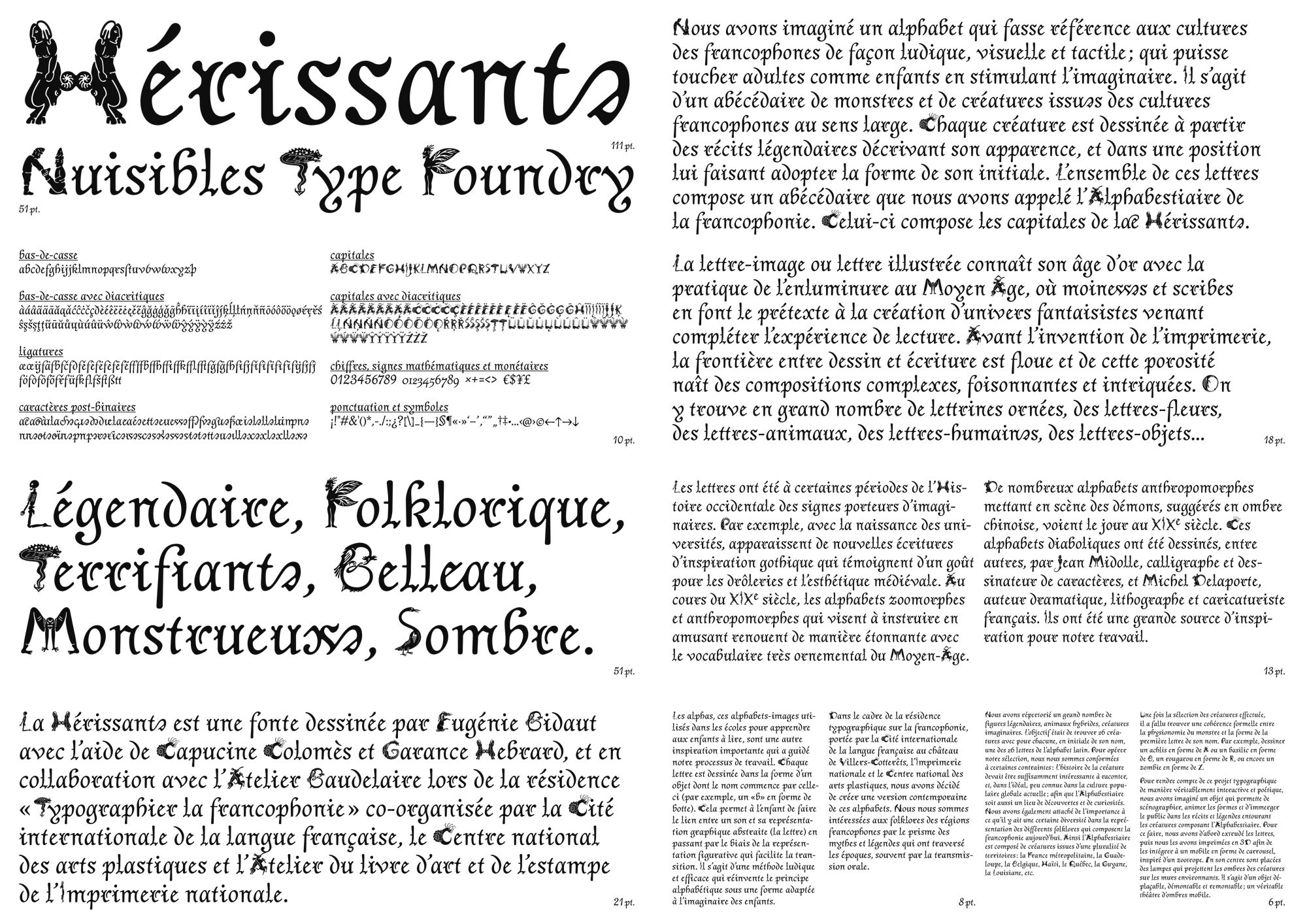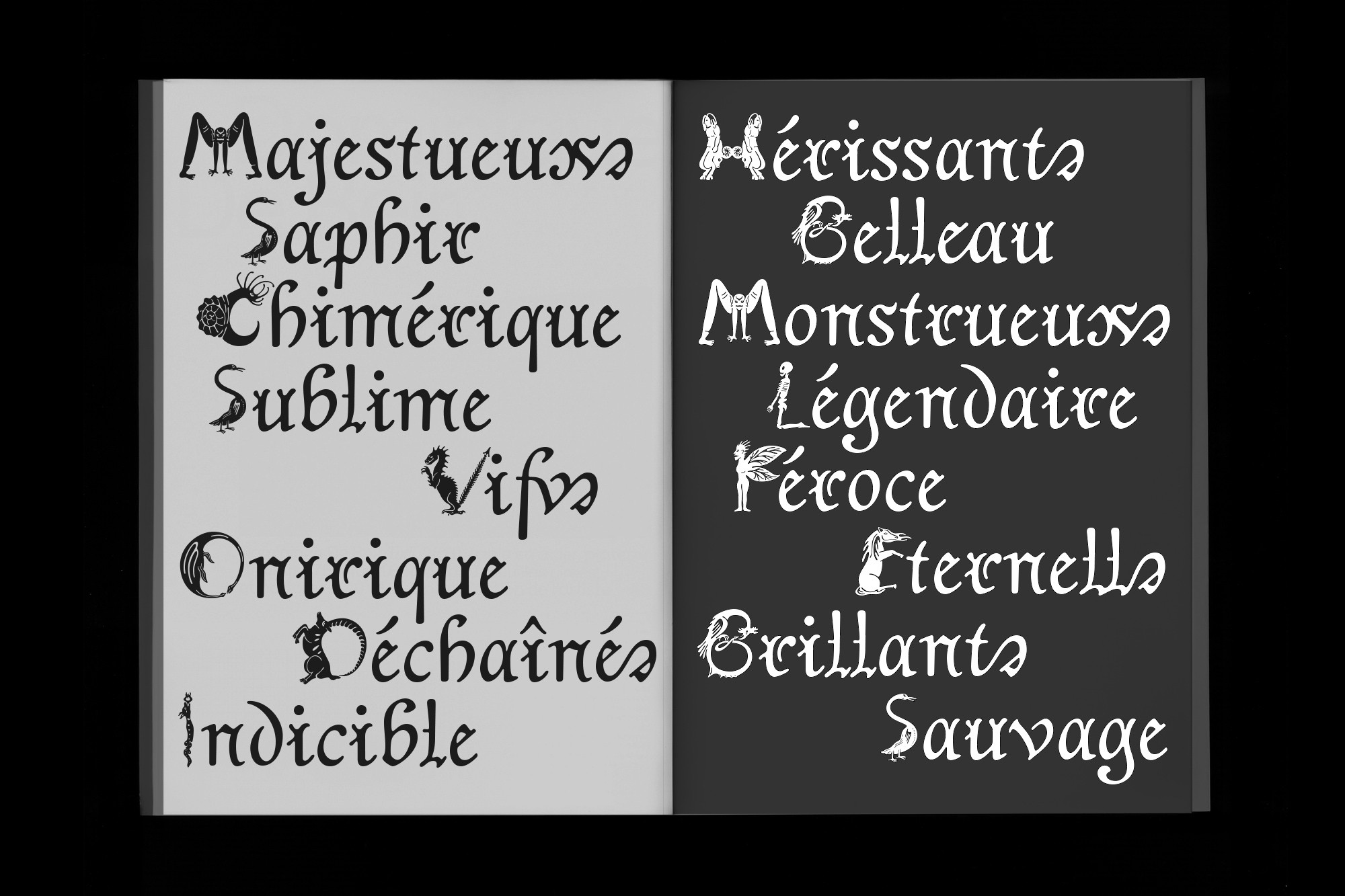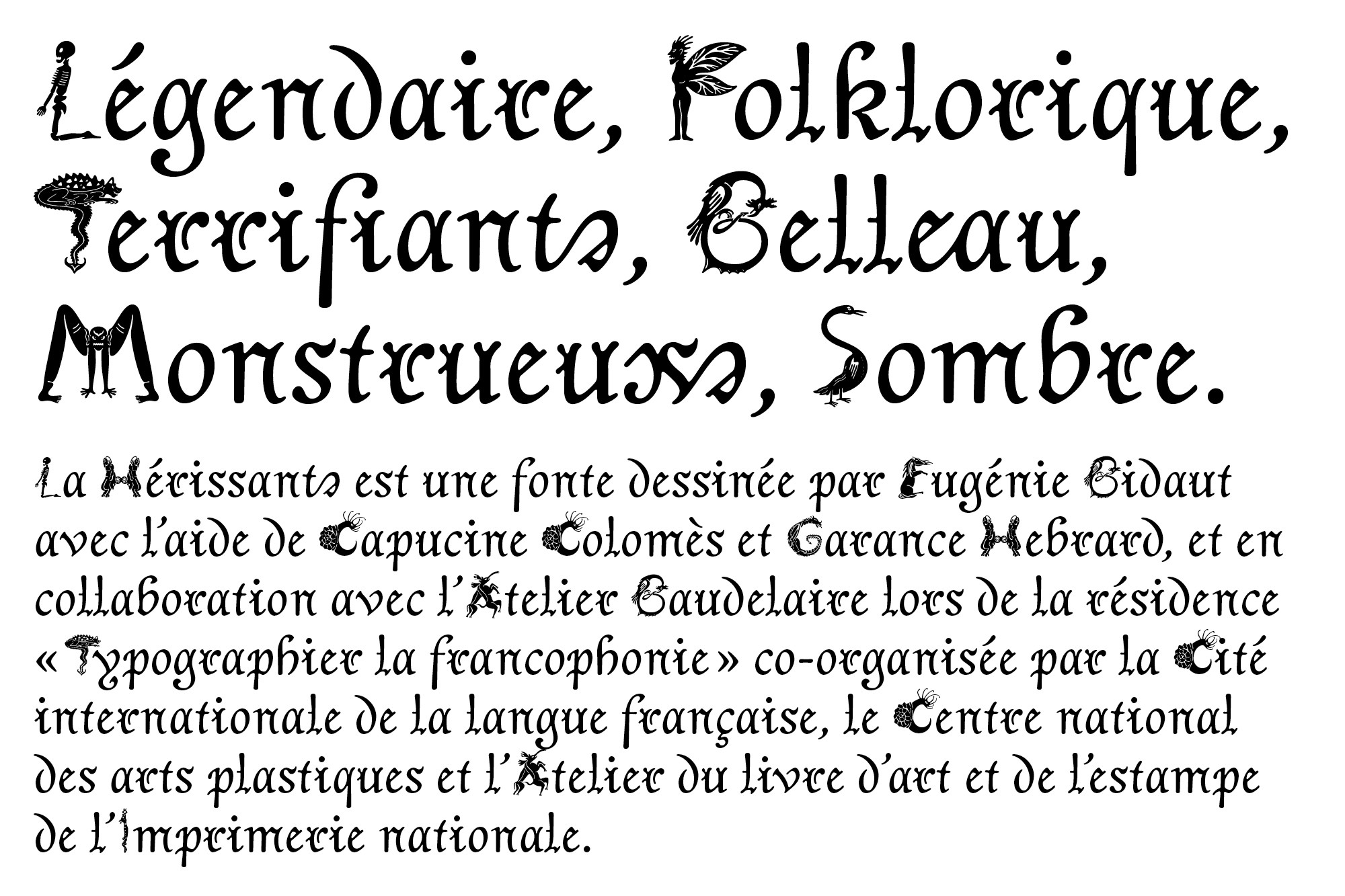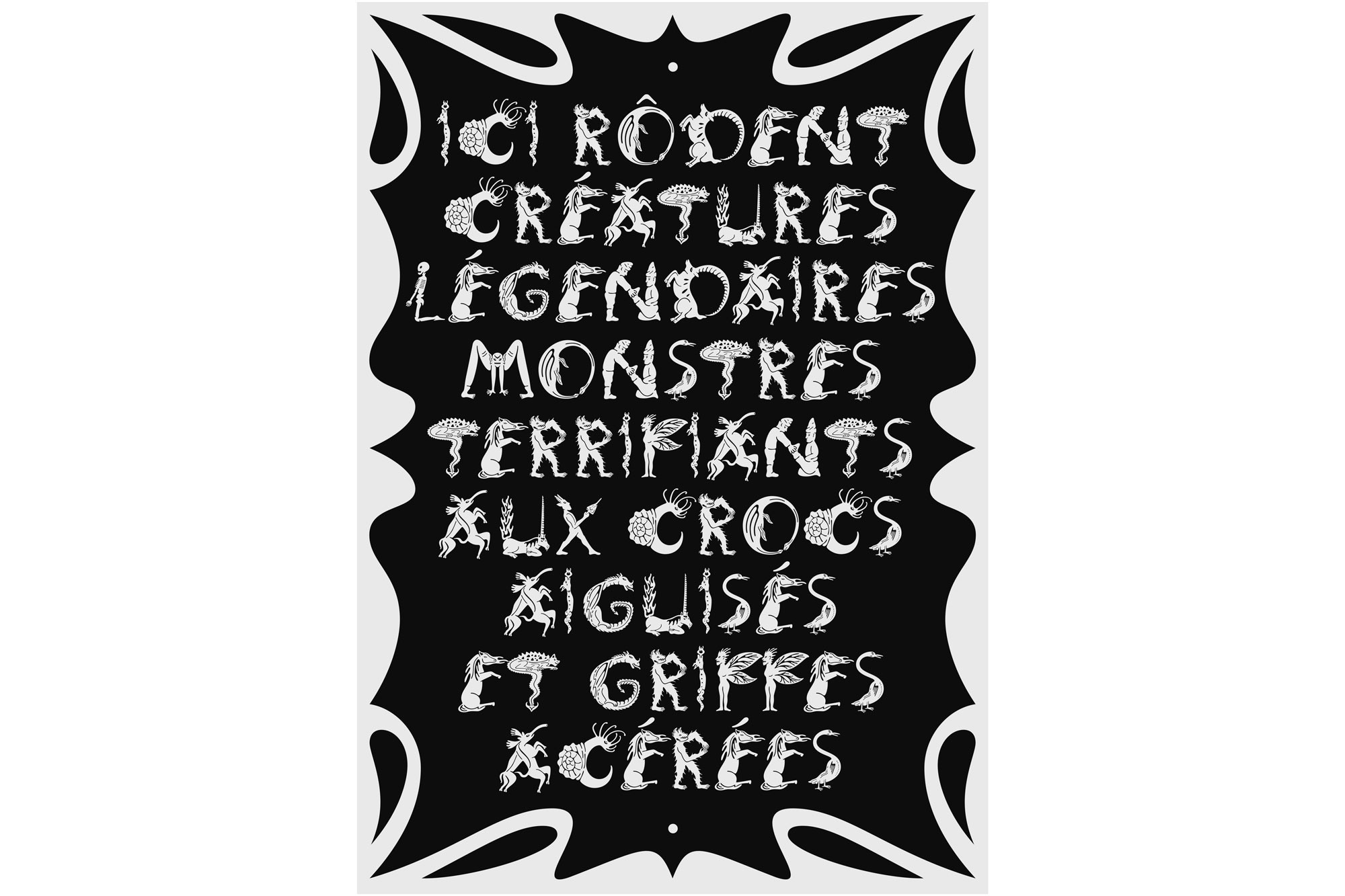 Dans le cadre de l’ouverture de la Cité internationale de la langue française au château de Villers-Cotterêts, le Centre des monuments nationaux, l’Imprimerie nationale et le Centre national des arts plastiques se sont associés pour mettre en œuvre une résidence artistique dédiée à la création, la recherche ou l’expérimentation autour de la thématique « Typographier la francophonie ou la francophonie typographiée ». Notre projet a été retenu et est en cours d’élaboration ! Nous avons imaginé un alphabet qui puisse faire référence à la culture de la langue française de façon ludique, visuelle et tactile, qui puisse toucher adultes comme enfants en stimulant l’imaginaire. Il s’agit d’un abécédaire de monstres et créatures issus de la culture francophone au sens large. Chaque monstre est dessiné dans la forme de son initiale, inspiré des différents récits décrivant son apparence visuelle. L’ensemble de ces lettres compose un abécédaire que nous avons appelé l'Alphabestiaire de la francophonie.