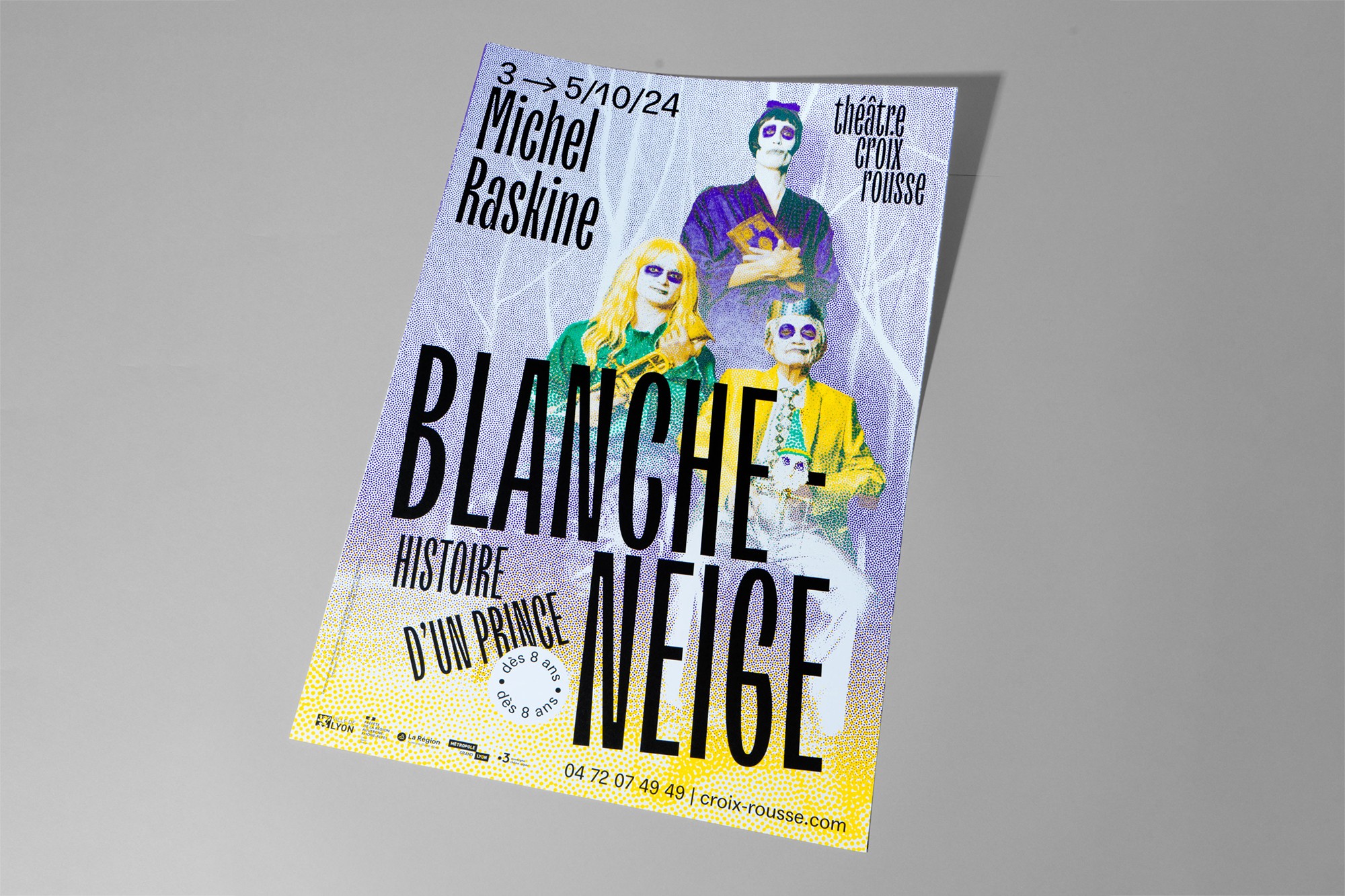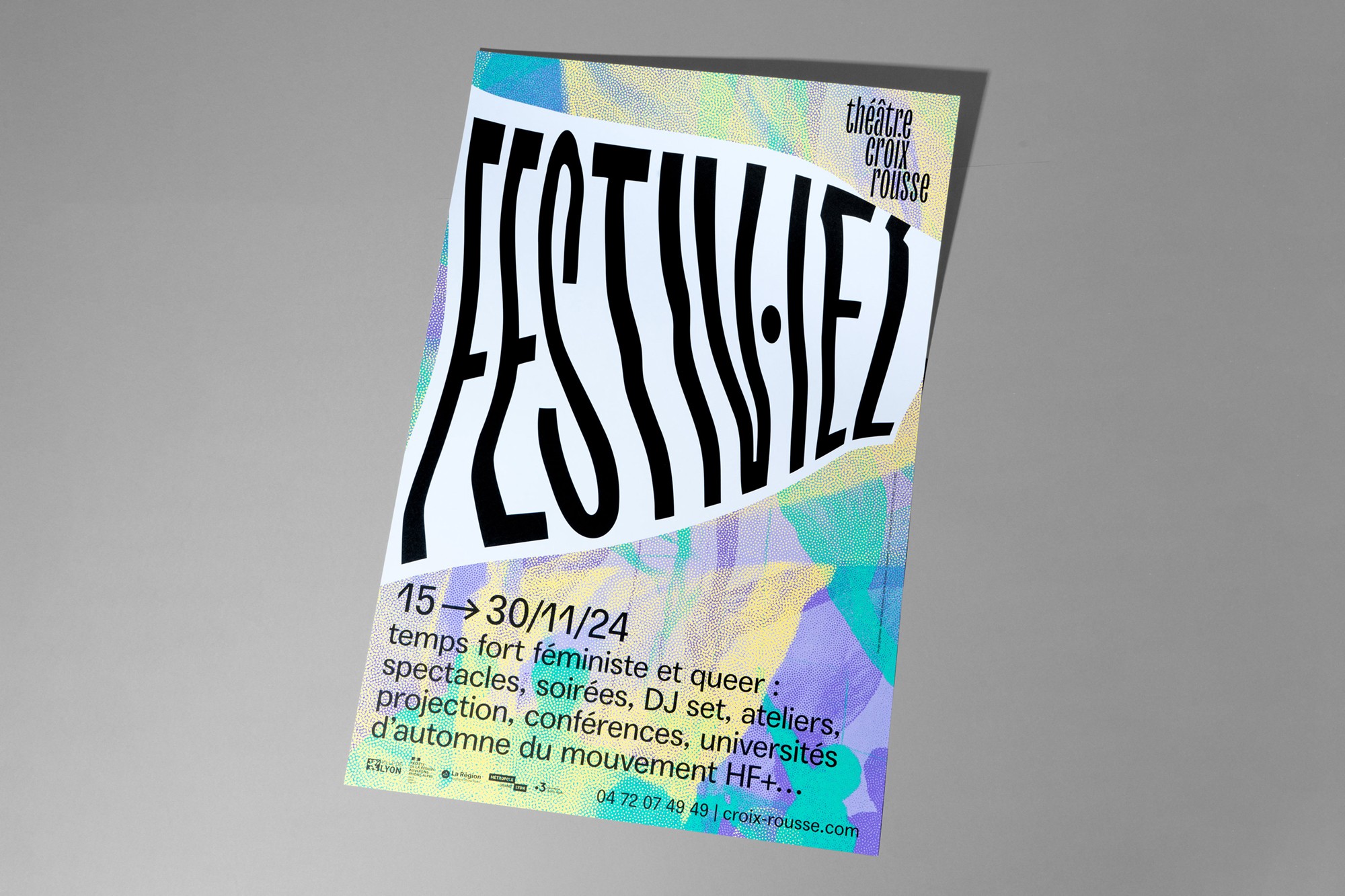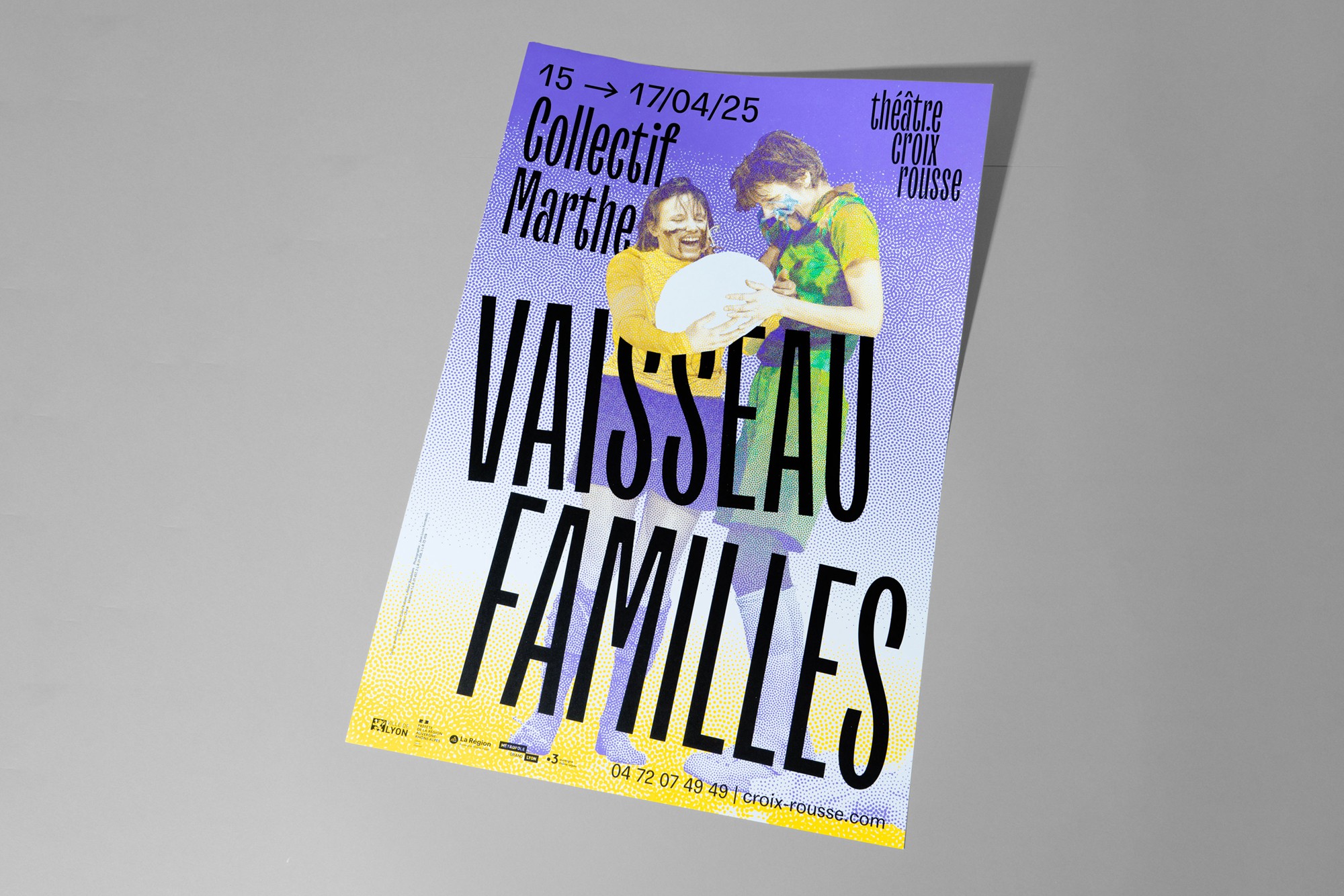 Le visuel de cette saison 2024-25 conserve le principe de superposition de plans et de couches entre typographie, paysages et personnages colorés. Une séance photo menée au sein du théâtre nous a inspiré cette composition où s’entremêlent corps et lettres. La mise en page en escalier, qui fait écho aux collines de la Croix-Rousse, est un axe fort de l’identité du théâtre que nous continuons de faire vivre au fil des saisons.