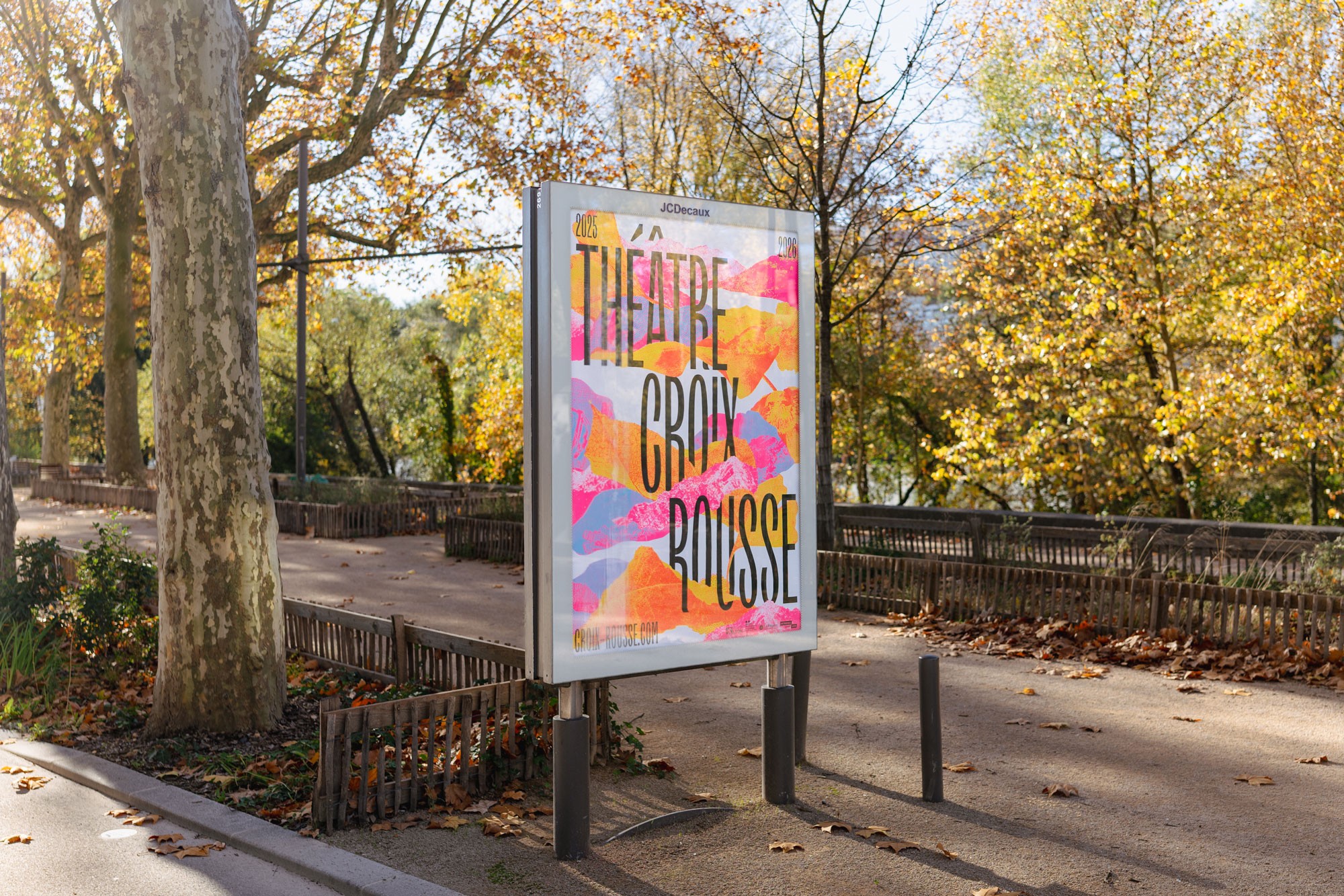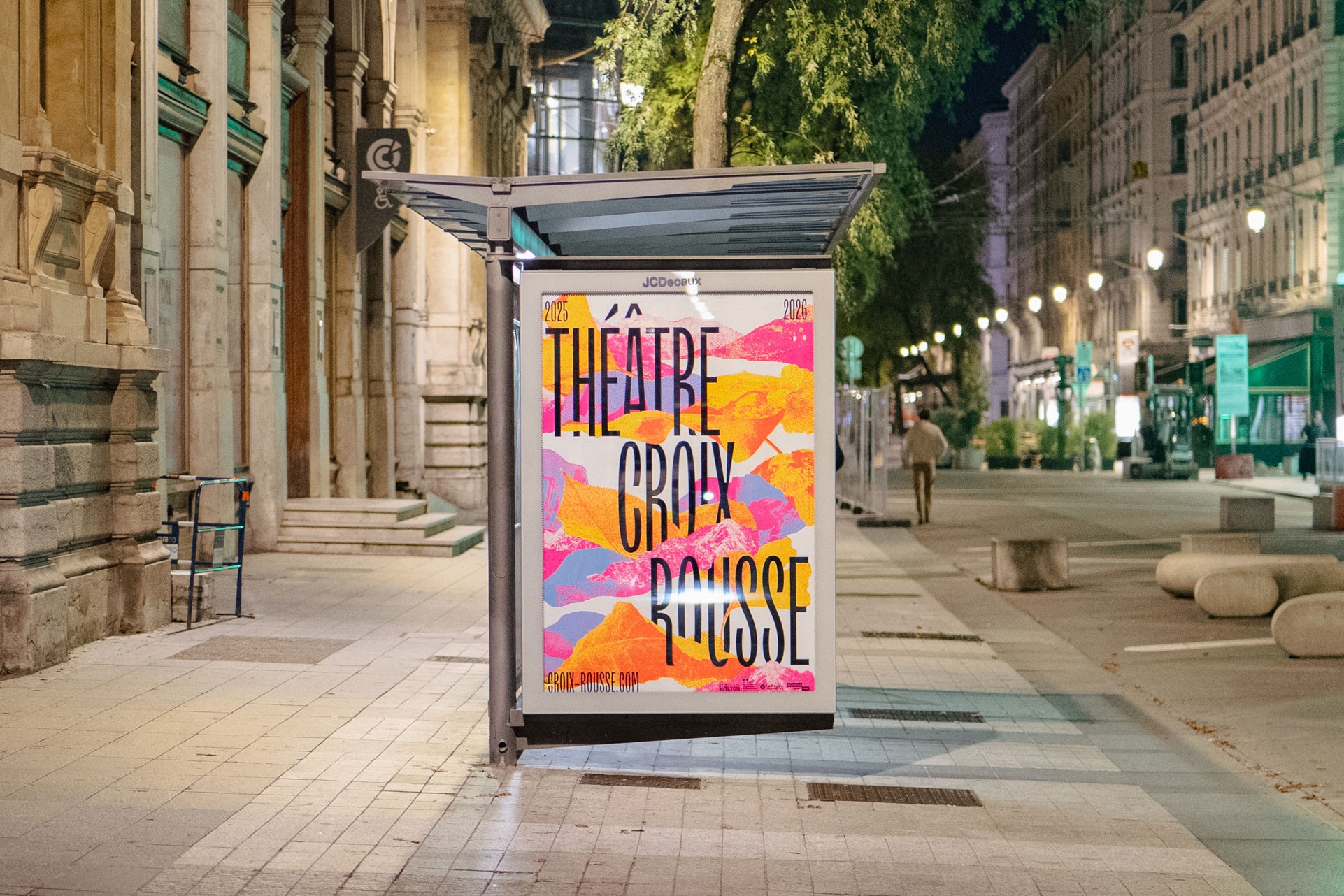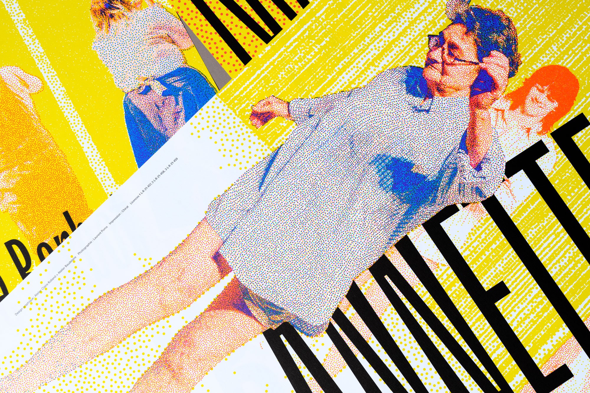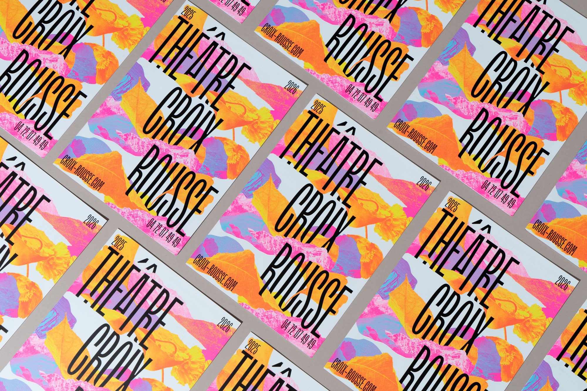 Dans la continuité des saisons précédentes, l’affiche est un enchevêtrement en cascade de typographie, paysages et formes abstraites. Jeux d’échelle et de trames composent un décor coloré de près et de loin une peinture abstraite. La mise en page en escalier, qui fait écho aux collines de la Croix-Rousse, est un repère fort au sein de l’identité du théâtre.
