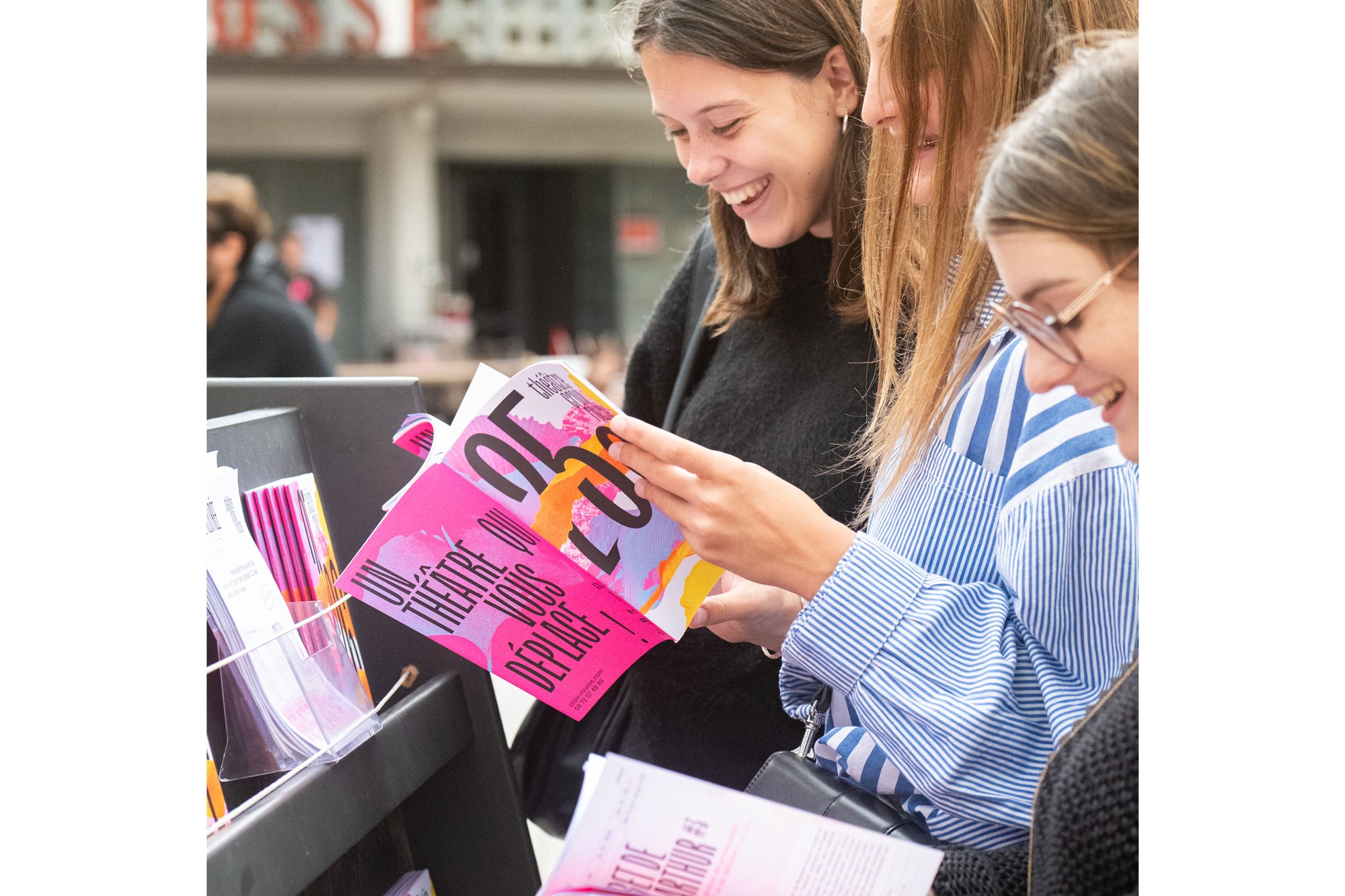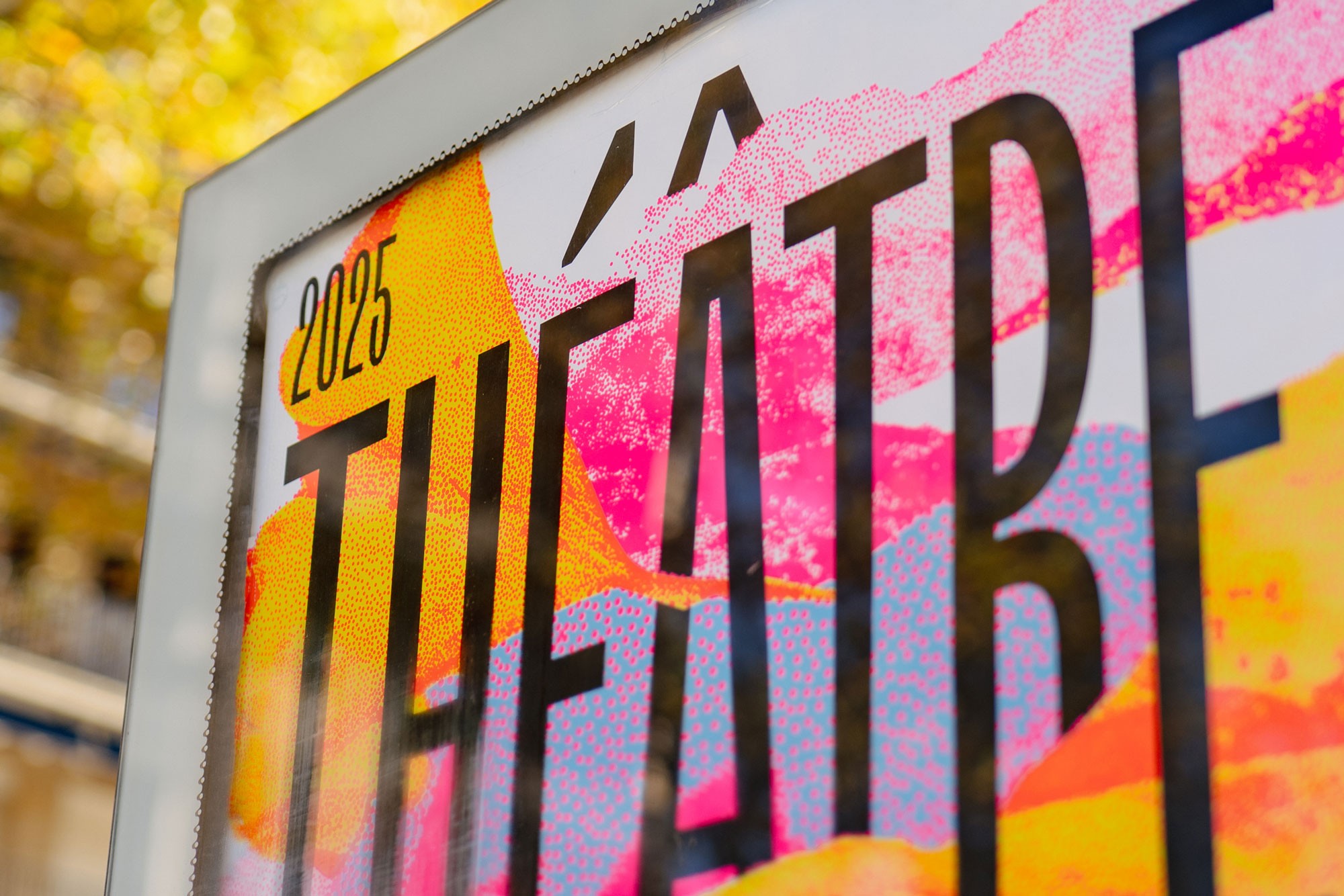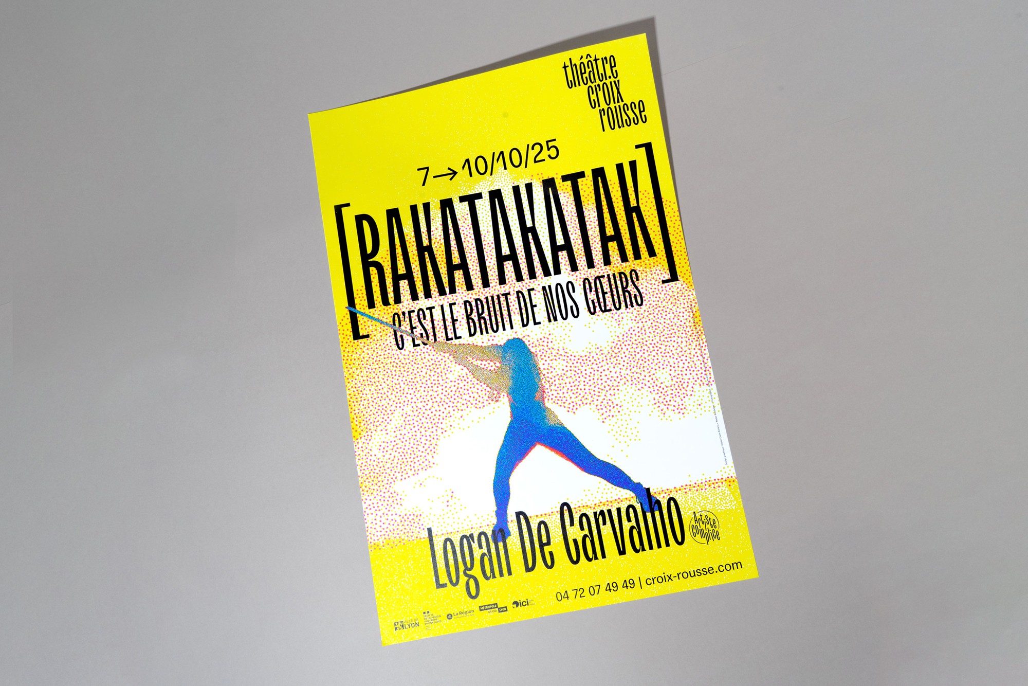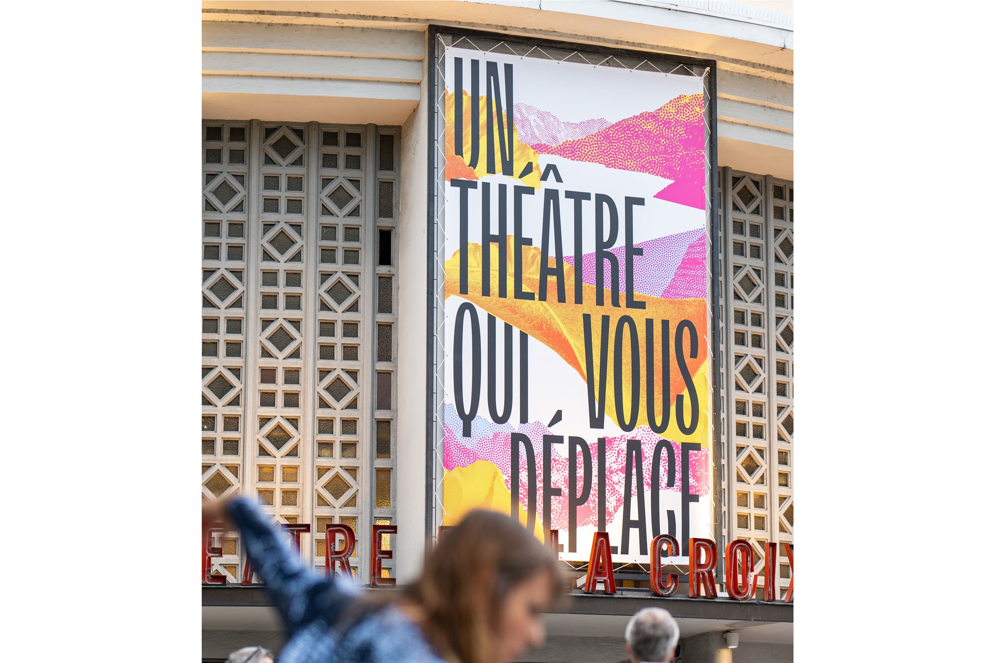 Dans la continuité des saisons précédentes, l’affiche est un enchevêtrement en cascade de typographie, paysages et formes abstraites. Jeux d’échelle et de trames composent un décor coloré de près et de loin une peinture abstraite. La mise en page en escalier, qui fait écho aux collines de la Croix-Rousse, est un repère fort au sein de l’identité du théâtre.