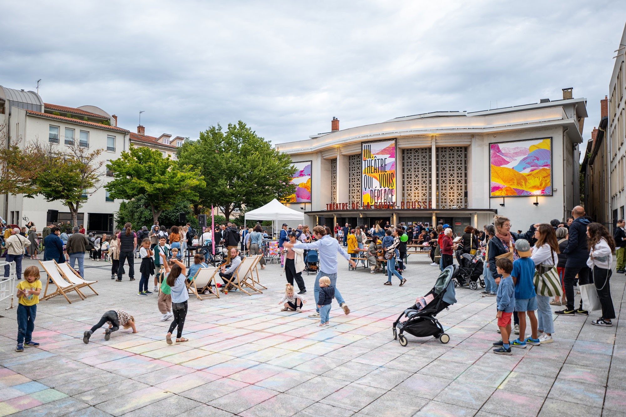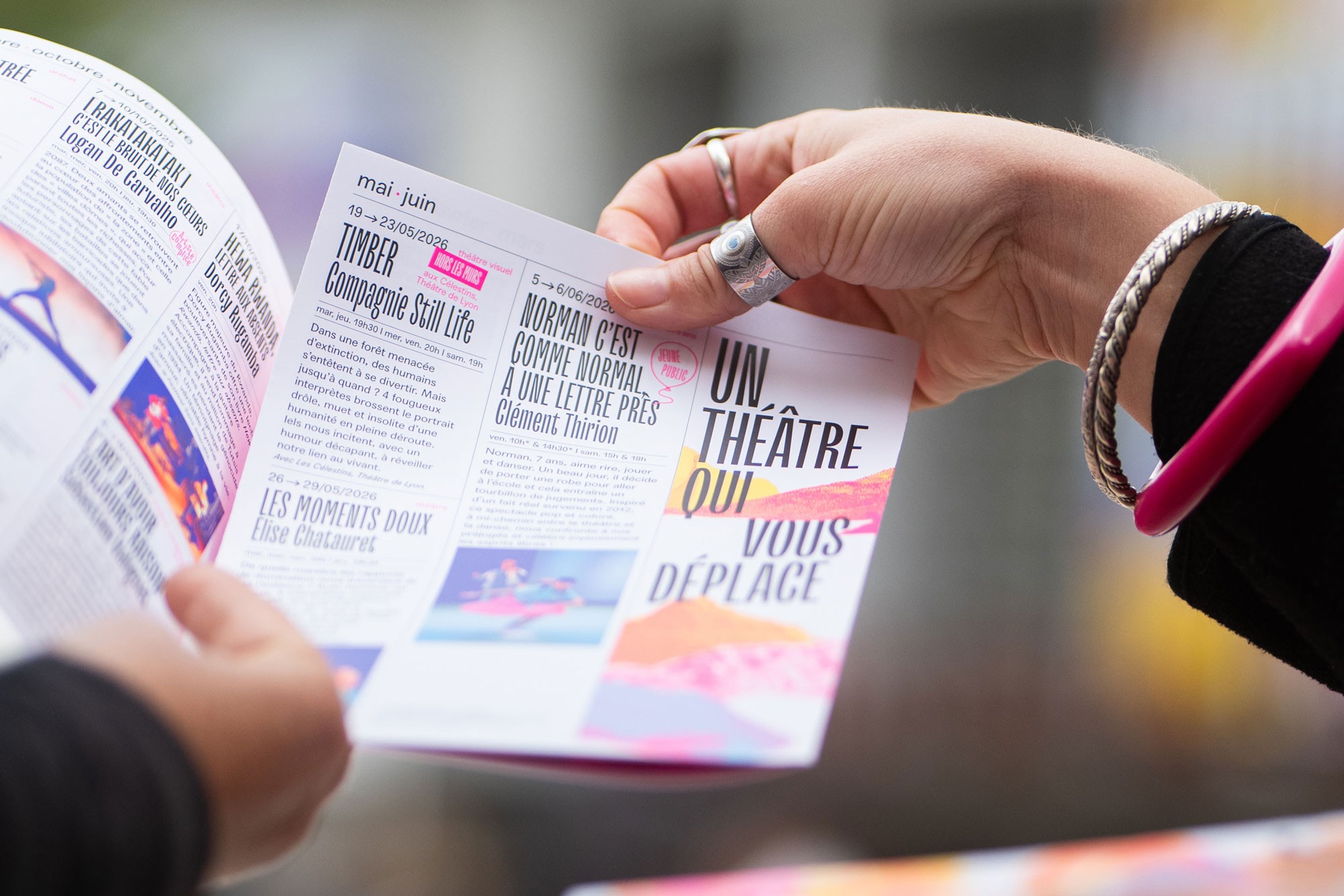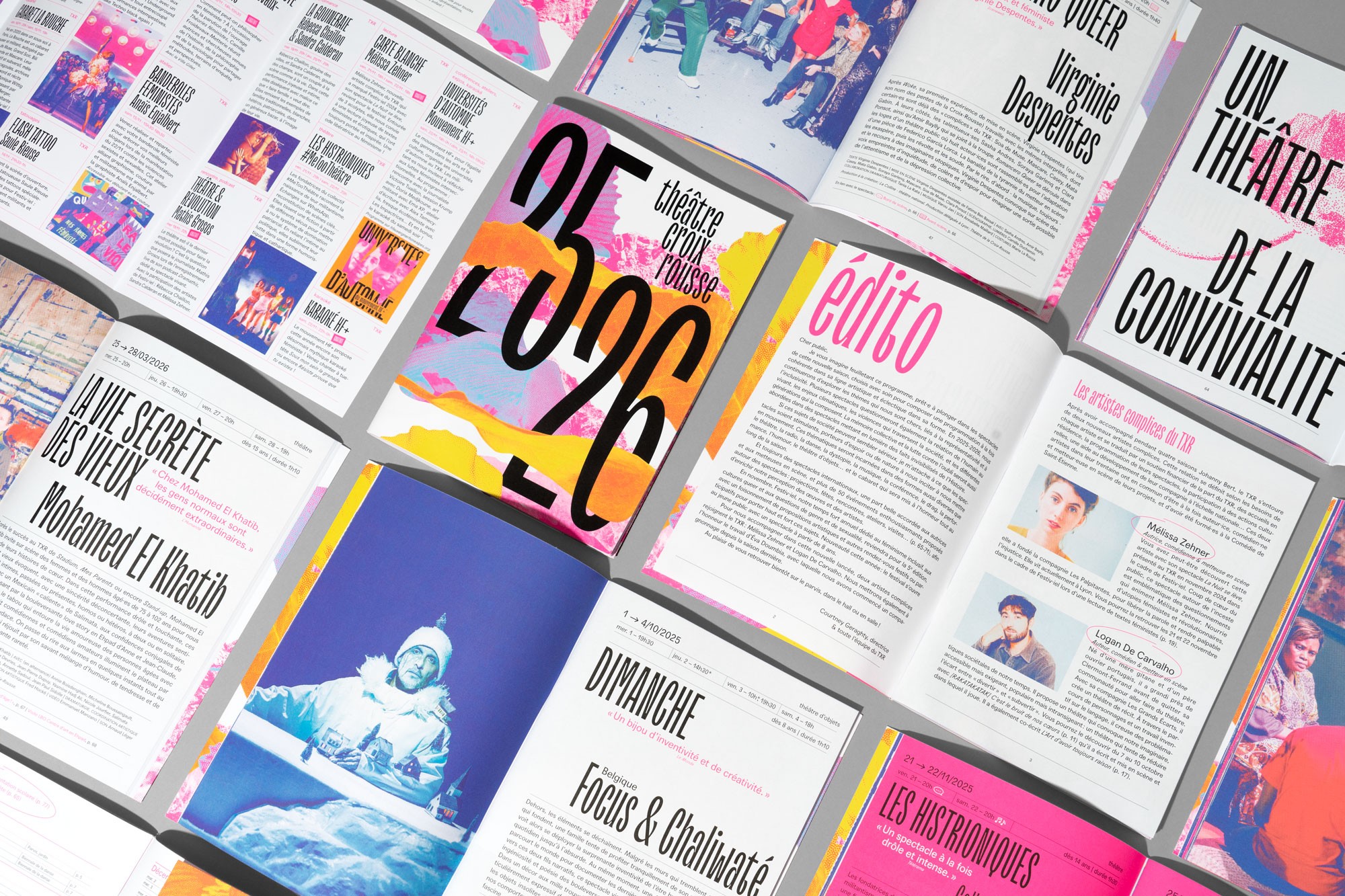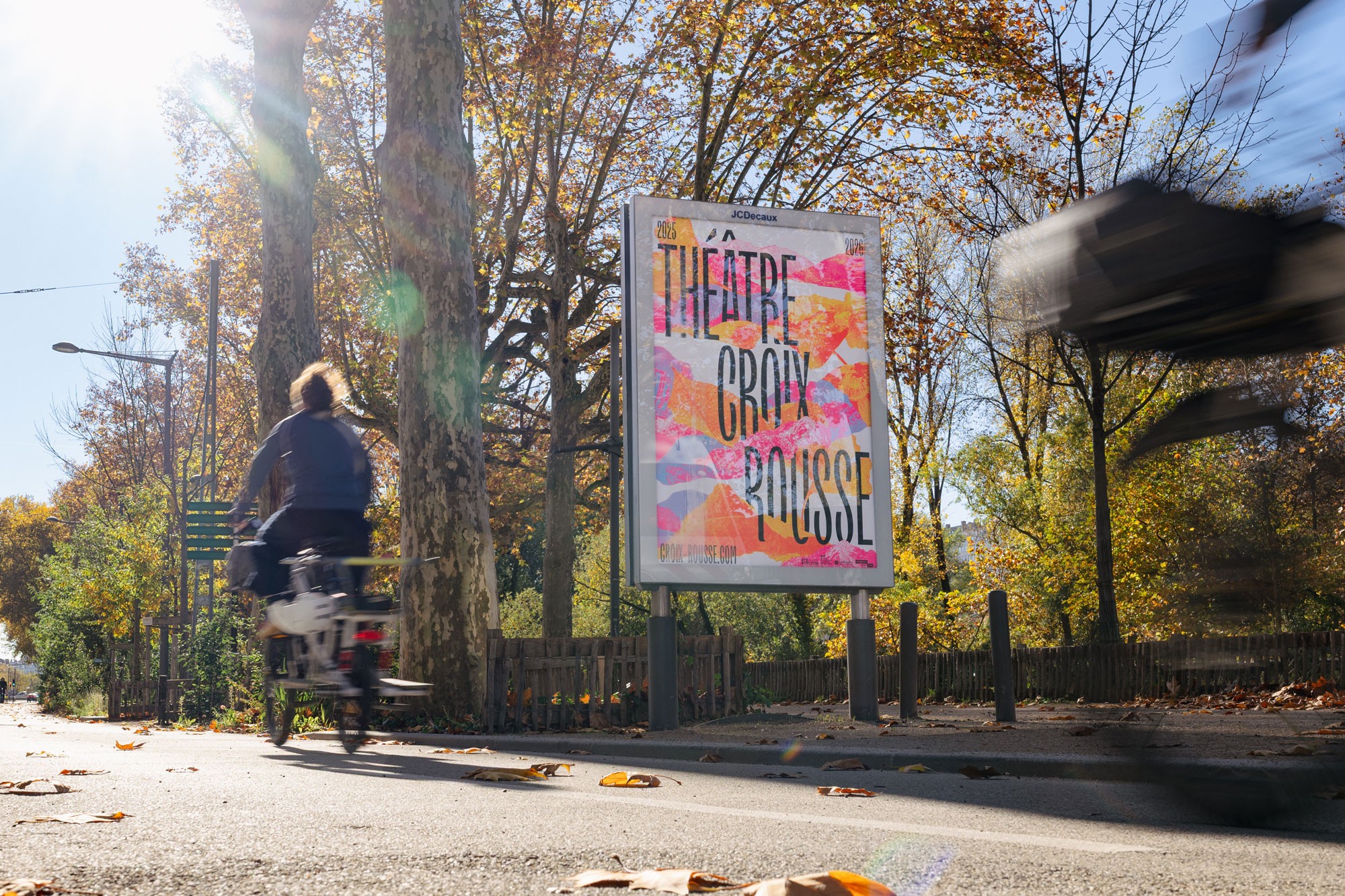 Dans la continuité des saisons précédentes, l’affiche est un enchevêtrement en cascade de typographie, paysages et formes abstraites. Jeux d’échelle et de trames composent un décor coloré de près et de loin une peinture abstraite. La mise en page en escalier, qui fait écho aux collines de la Croix-Rousse, est un repère fort au sein de l’identité du théâtre.
